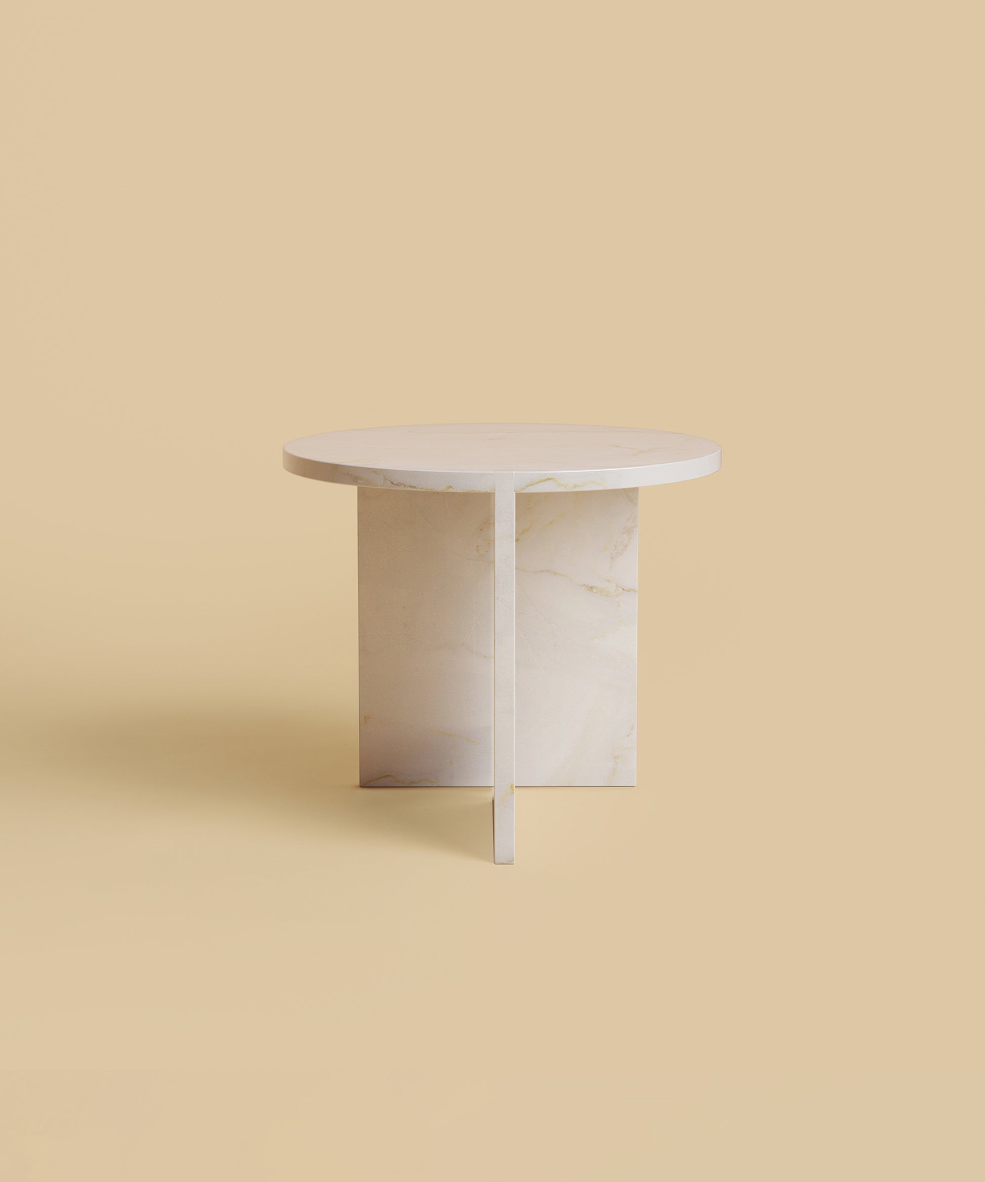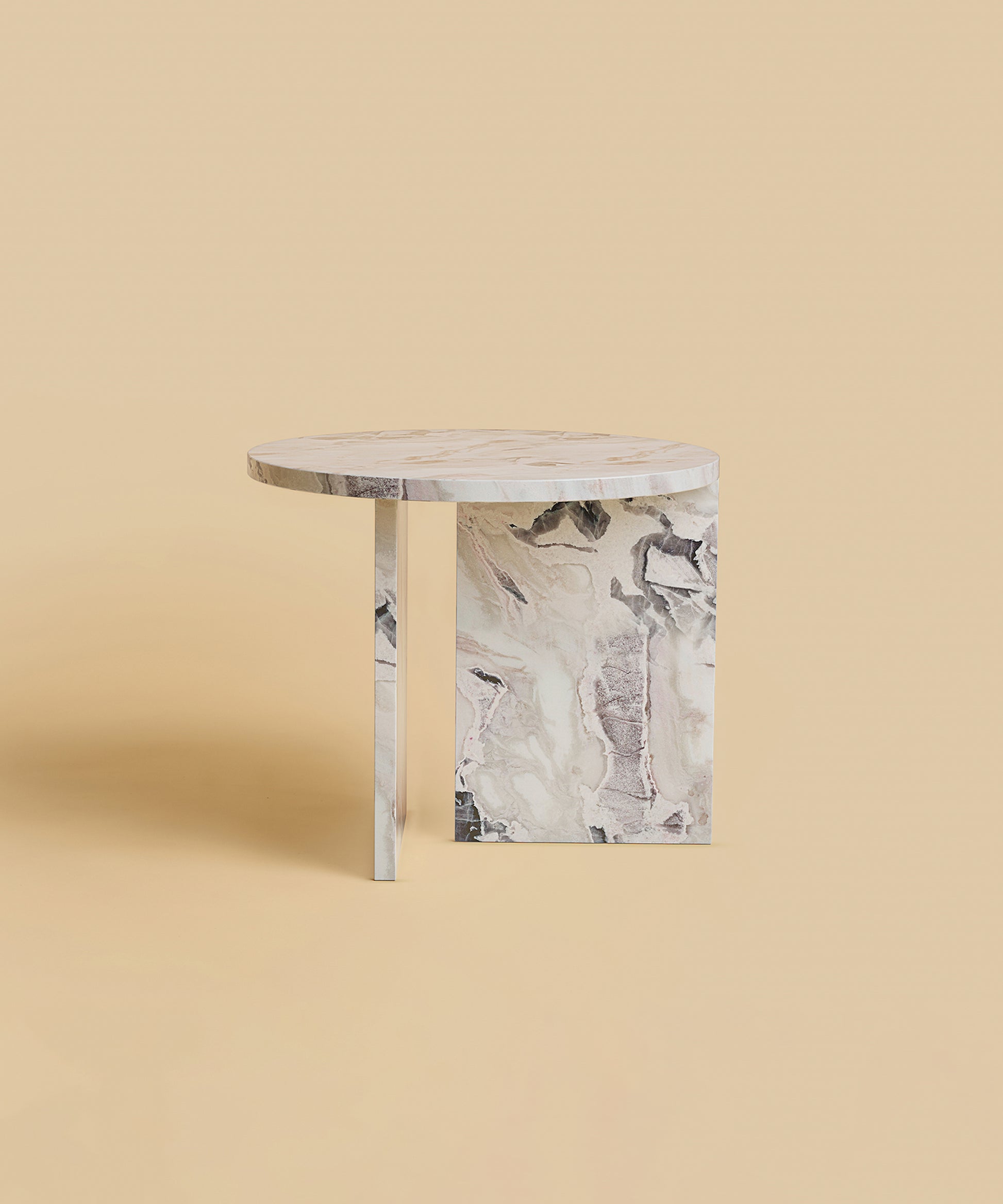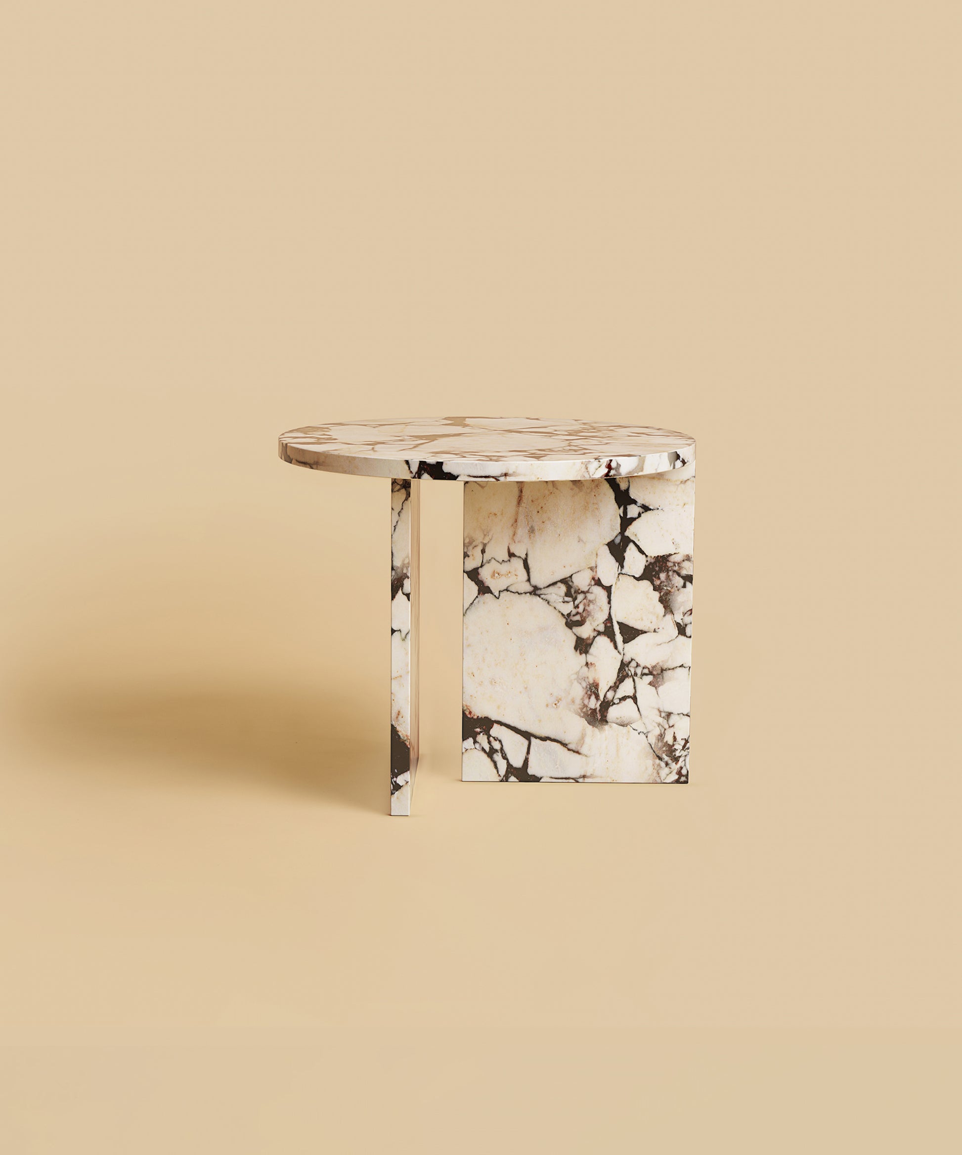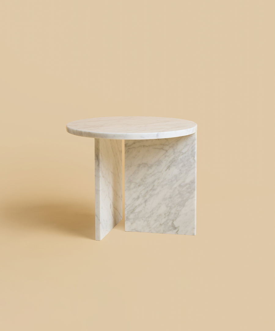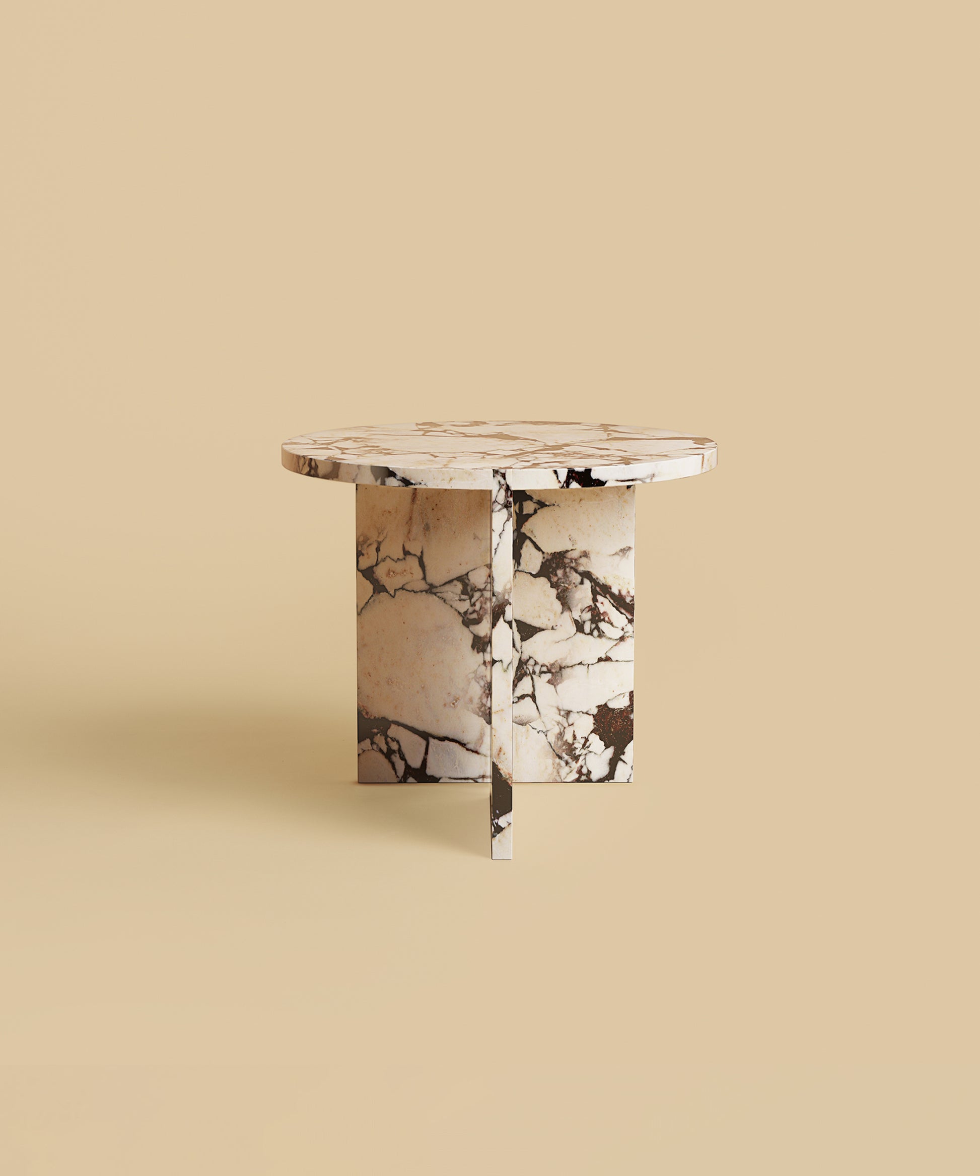 The legs are made from two travertine slabs, two Marble slabs, or, two terrazzo slabs in which one part is interlocked on the top. One part of the leg is interlocked on the top. Carrara terrazzo, a material that is obtained by mixing first-rate grits, is selected by size and color. The top is circular and has a diameter of 17.7 inches.