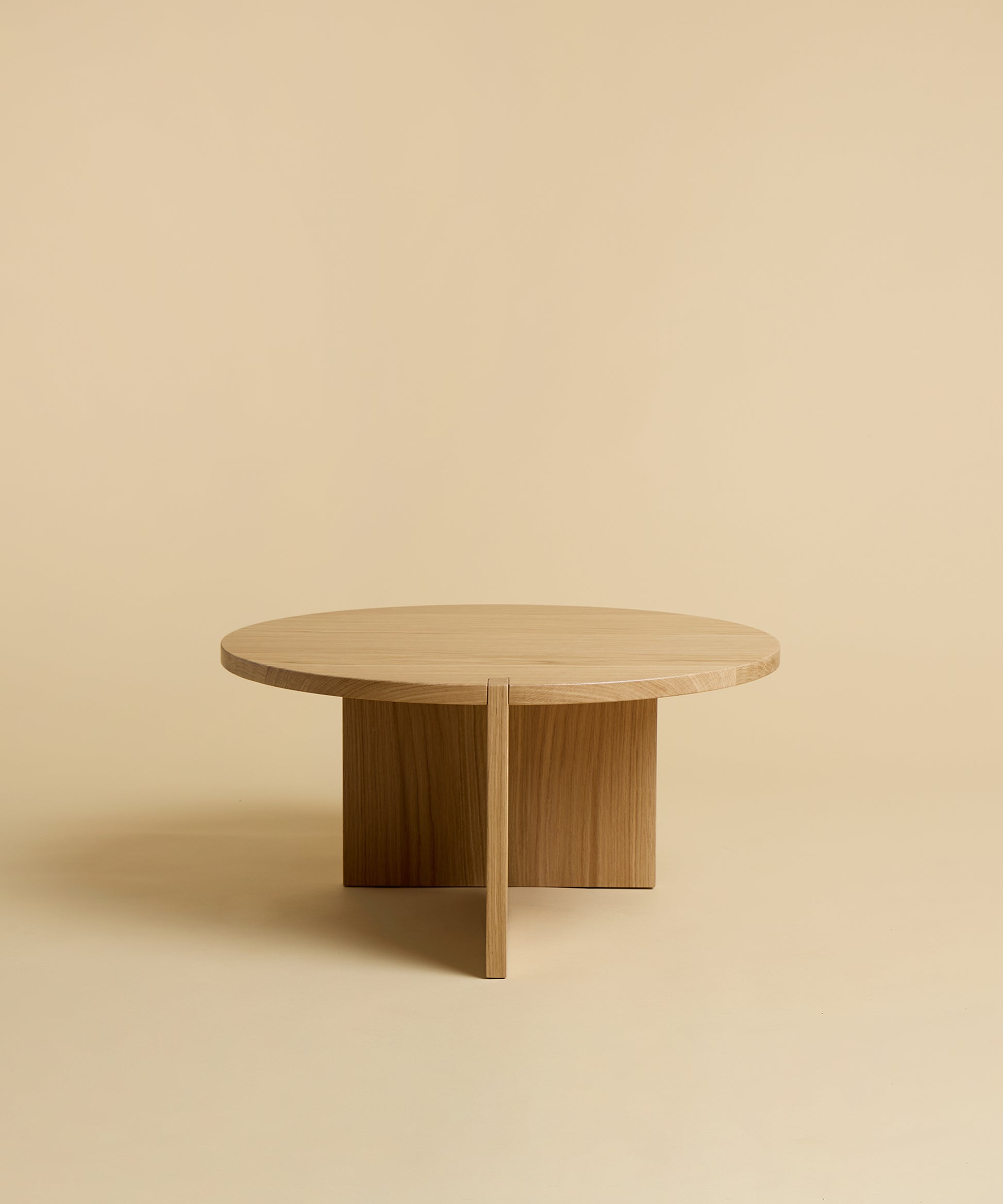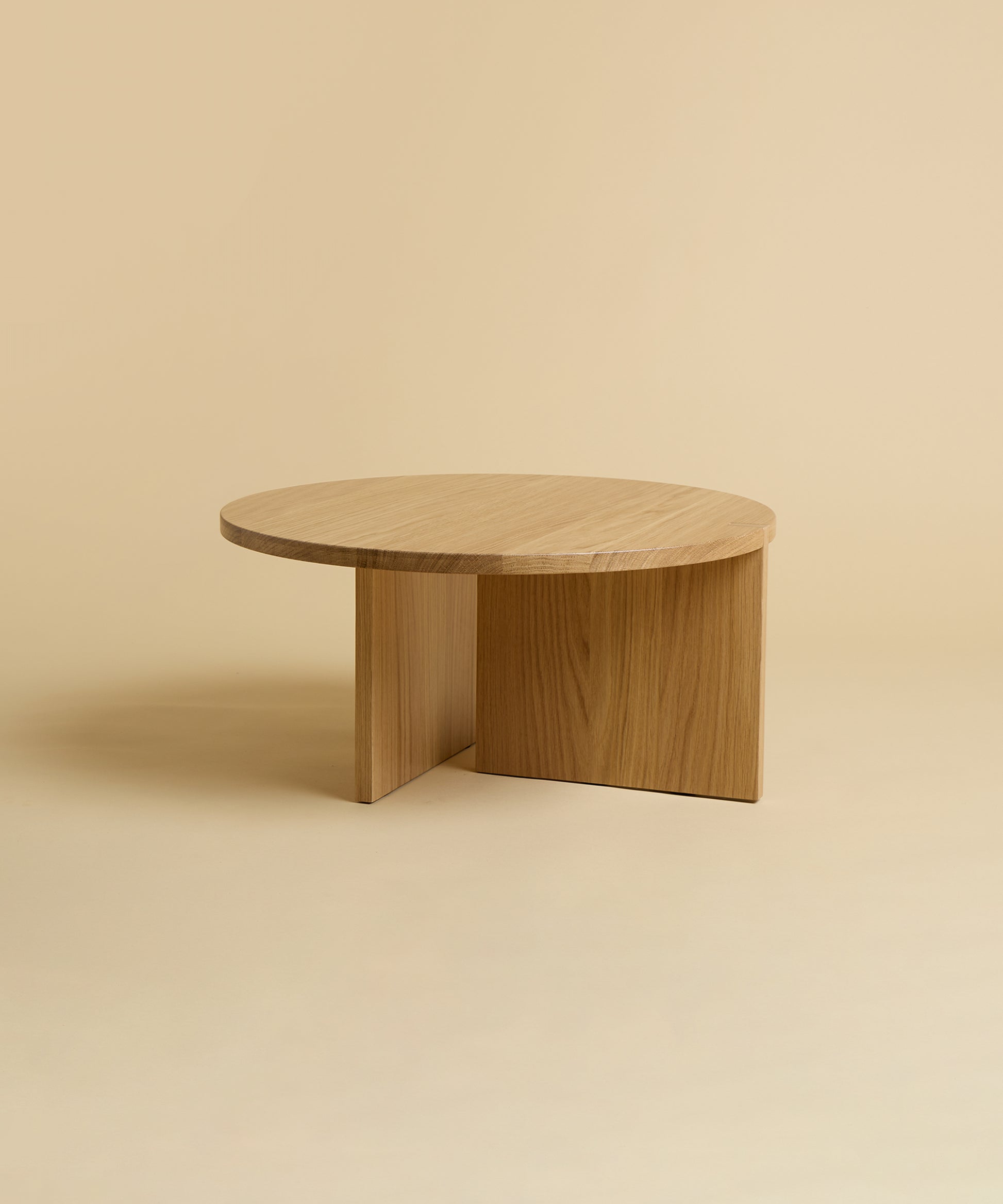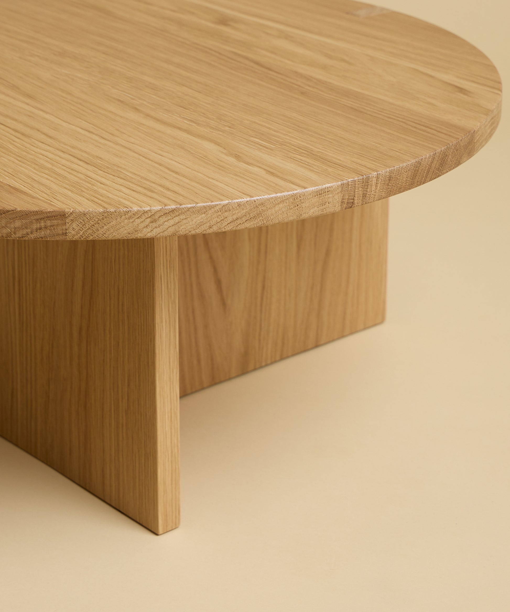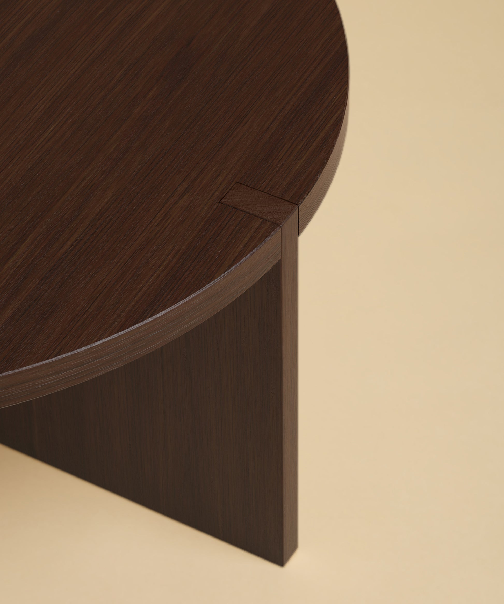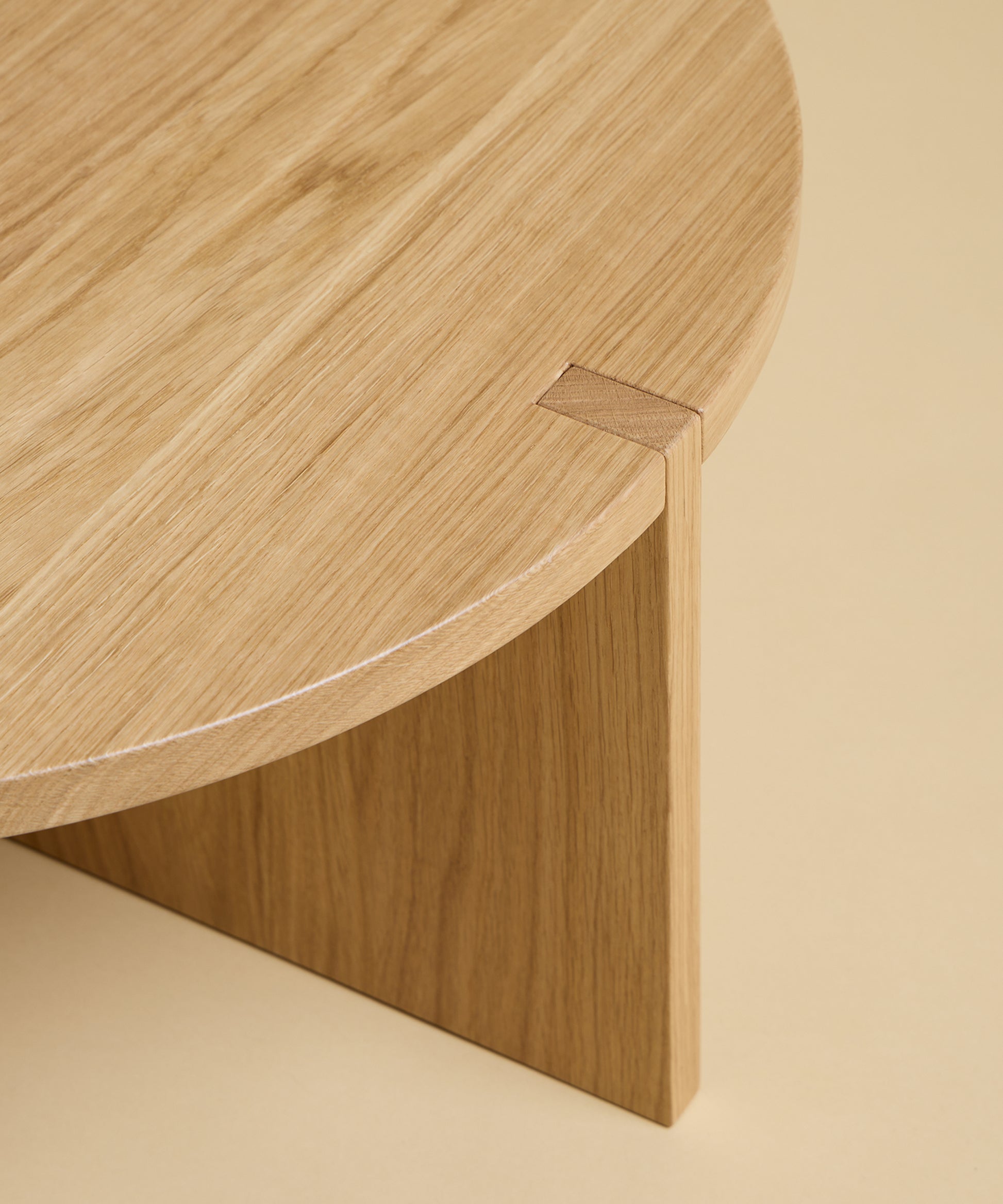 The top is circular and has a diameter of 23.6 inches, the legs are made from two glued solid wood boards in which one part is interlocked on the top.