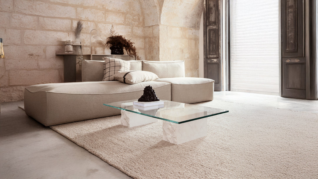A harmonious marriage of natural materials and contrasting finishes, our Mineral Coffee Table showcases the intrinsic beauty of stone and glass.