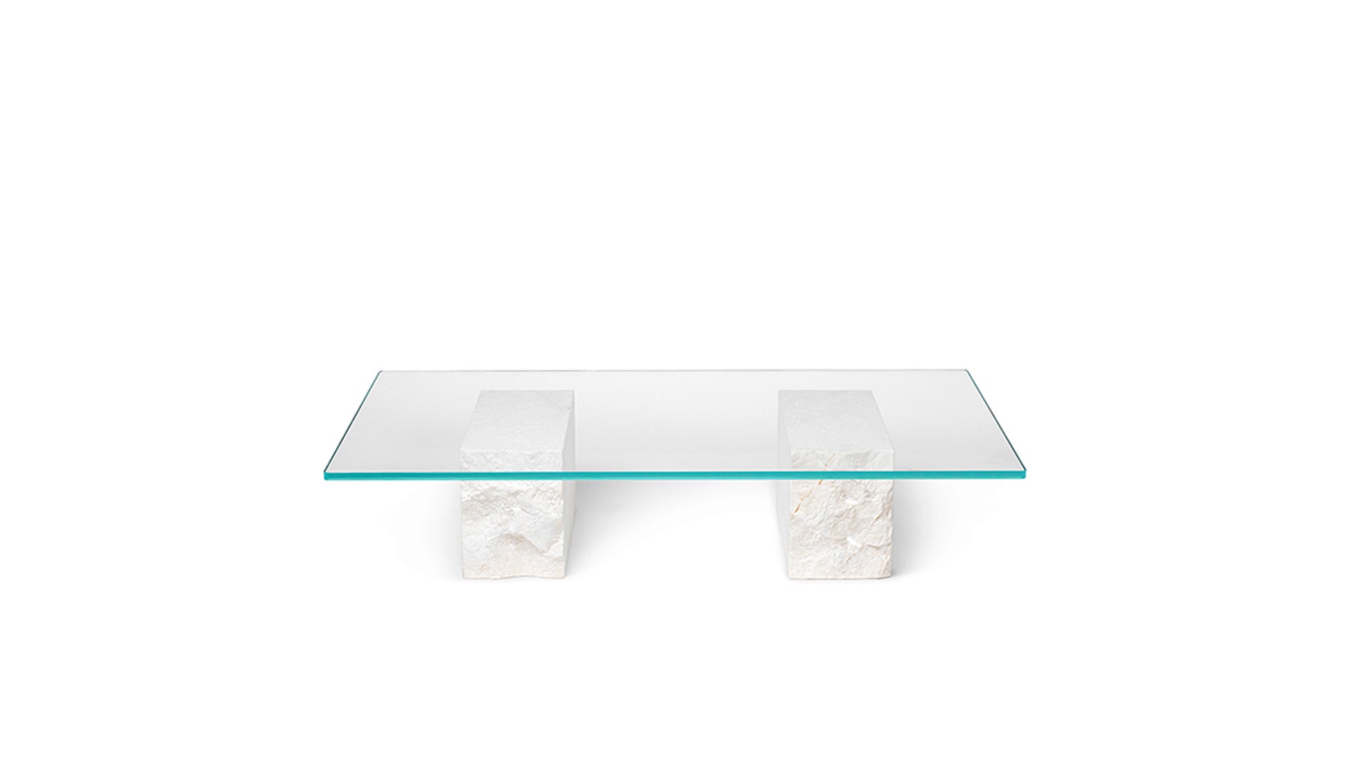 The smooth, rectangular glass top is placed on a base of two stone blocks each with one end of which is left unfinished for a raw, textural look.