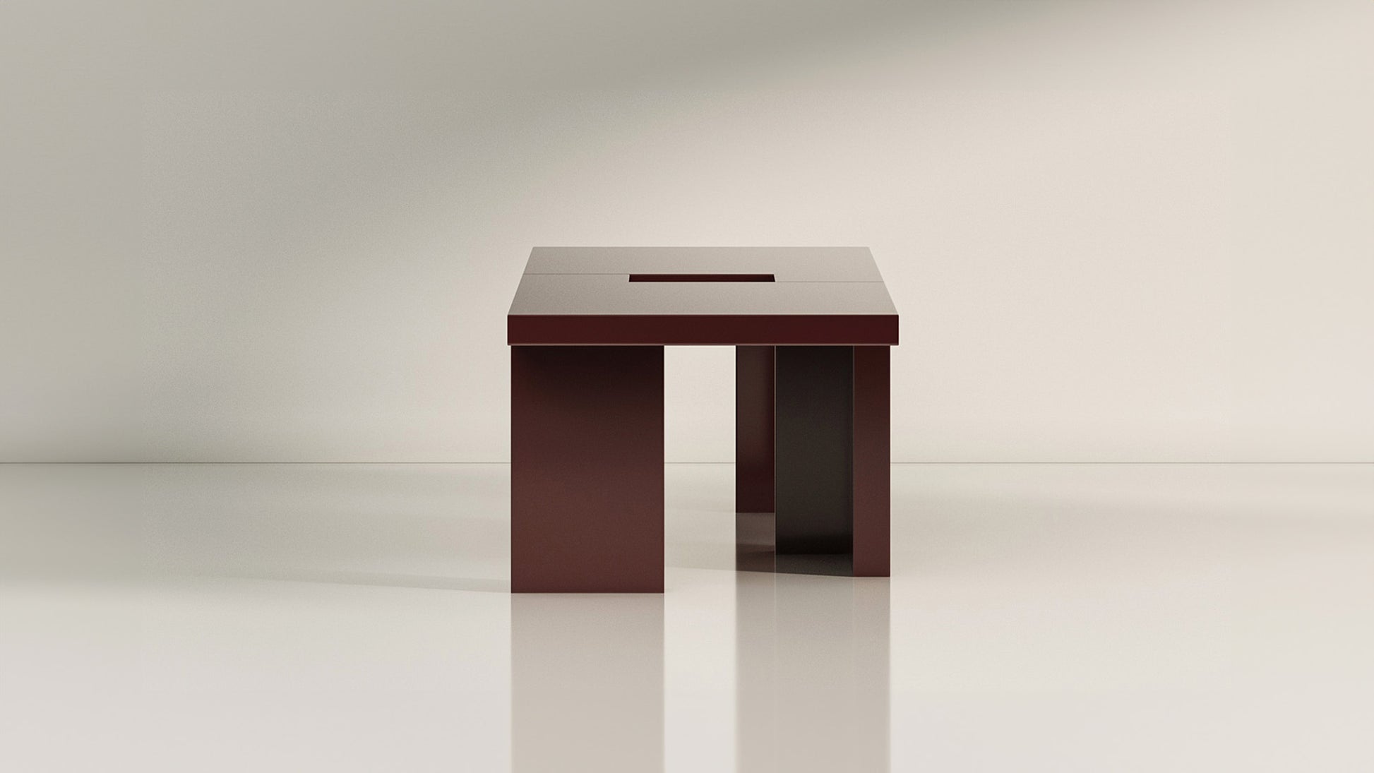The Practice Dining Table features a minimalist design of sleek panels and precise 90º angles. Its distinct protruding ledge allows for five unique configurations. This modular table can adapt to a variety of spaces, functioning in even the tightest spaces. One such configuration allows for a confined vacant space between two tables. In the spirit of the original at PRACTICE Studio, this space can be filled with a living plant whose growth will one day be restricted by the space it has been afforded. A temporary coexistence of nature and design.