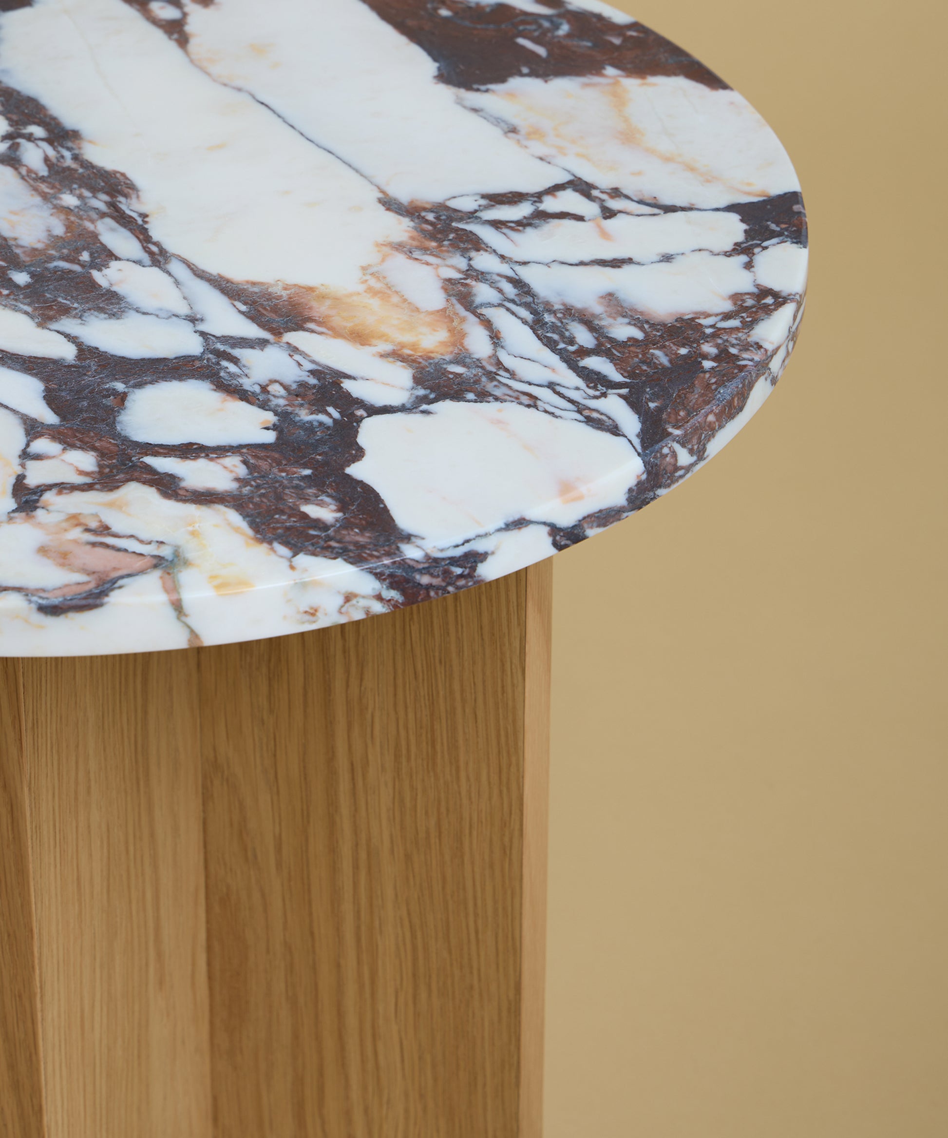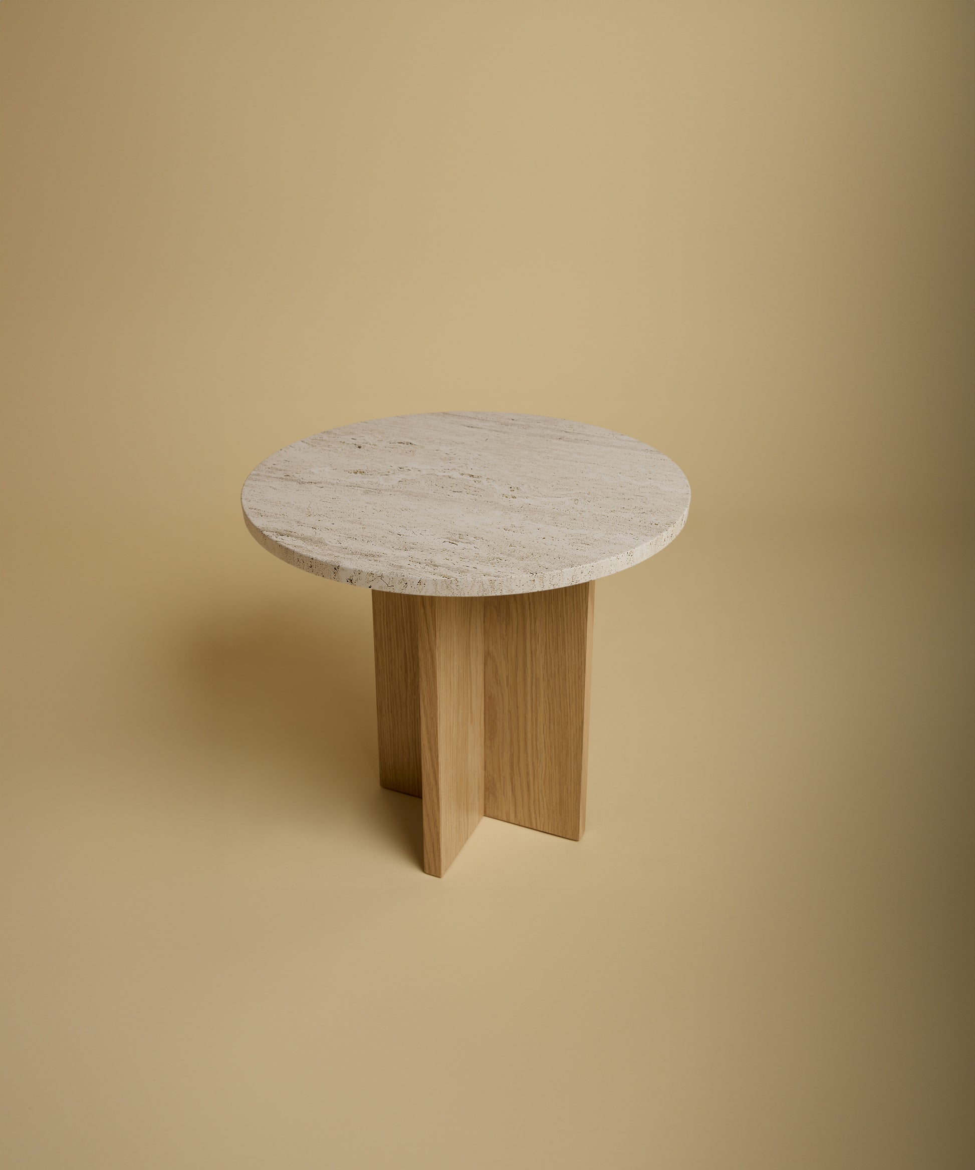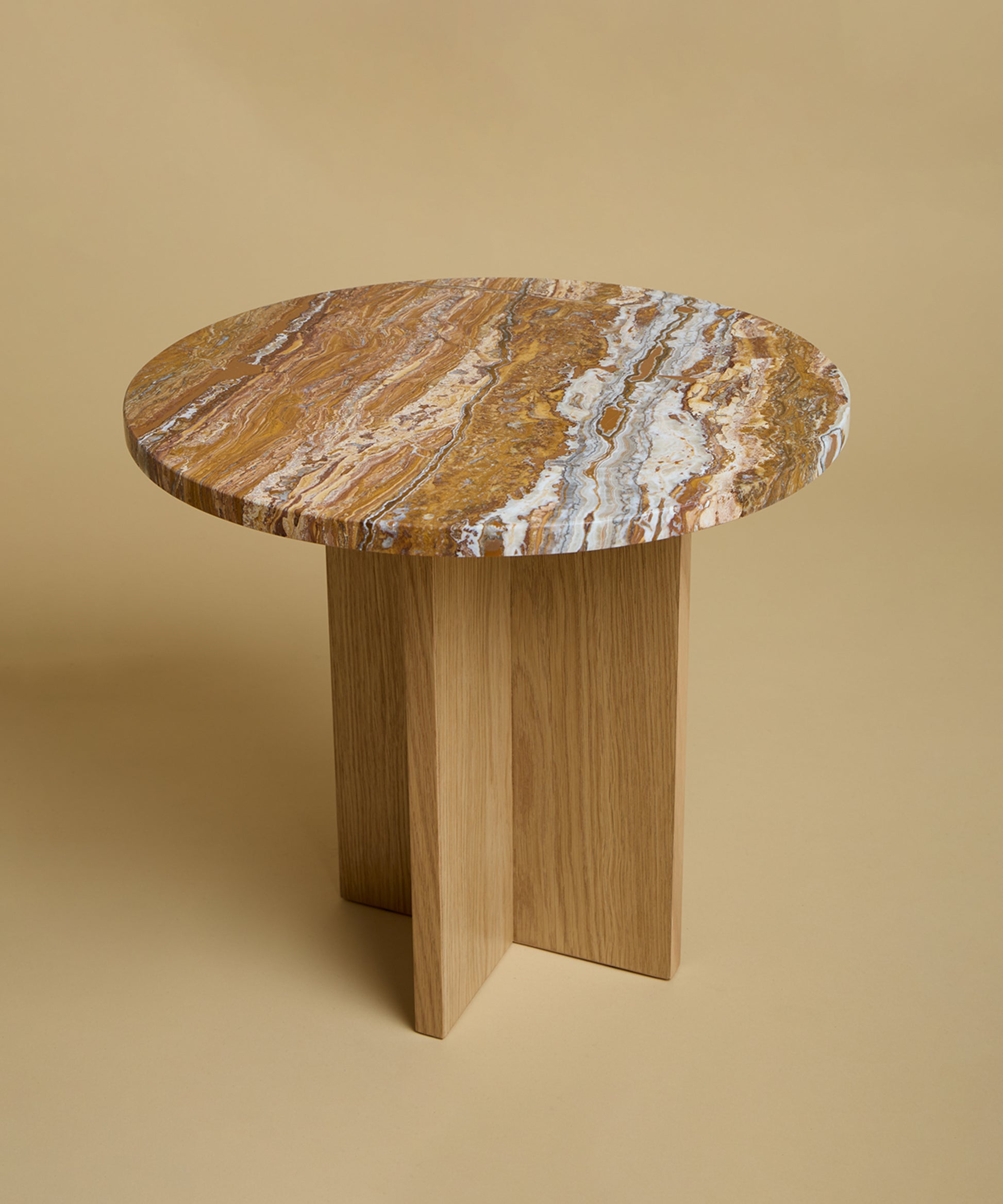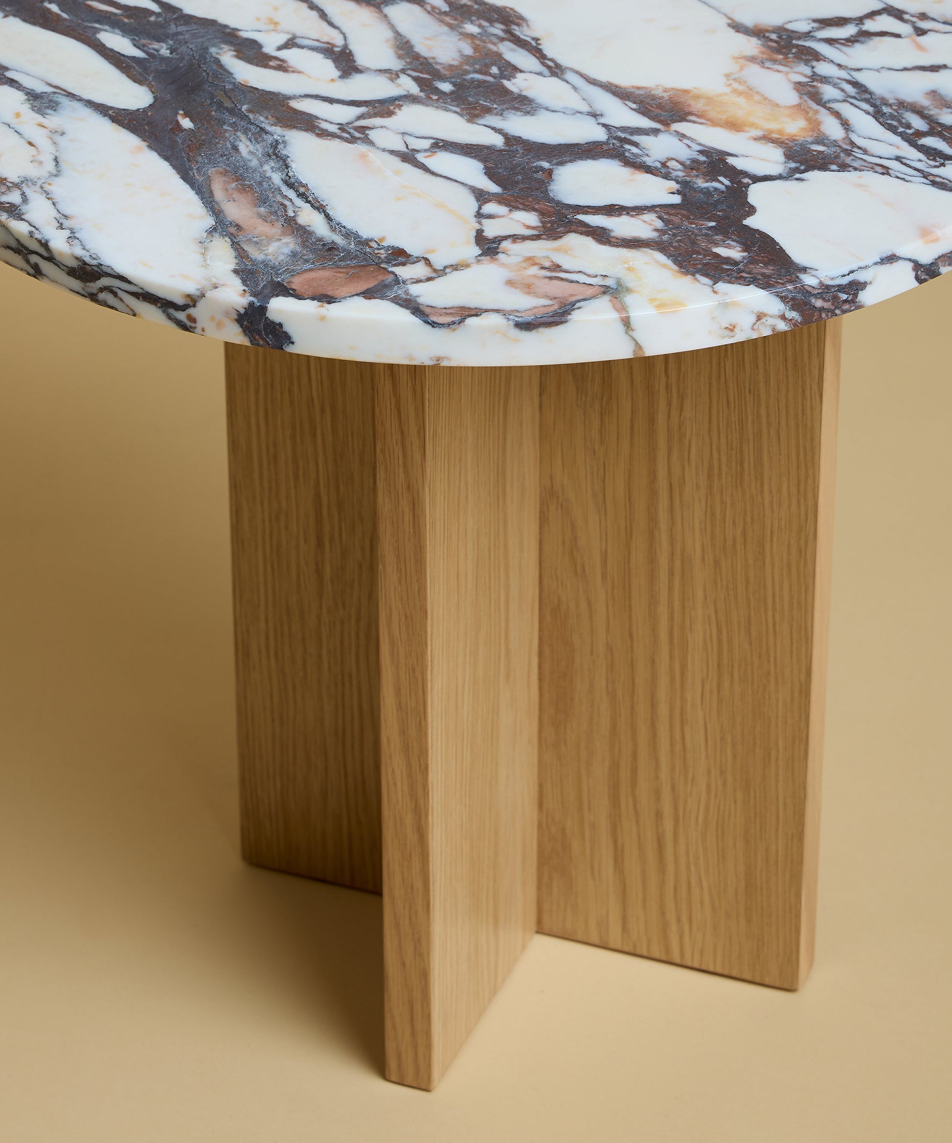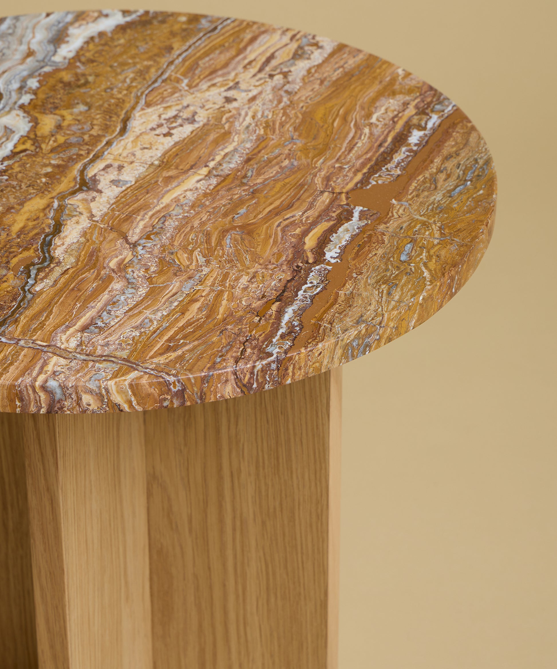The Sherman coffee table is produced with an oak wood base and a Calacatta Viola marble or Orange Travertine marble top.