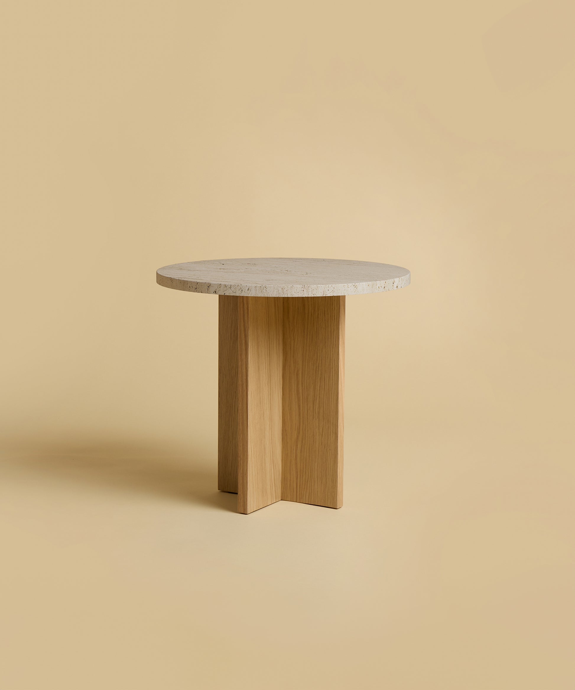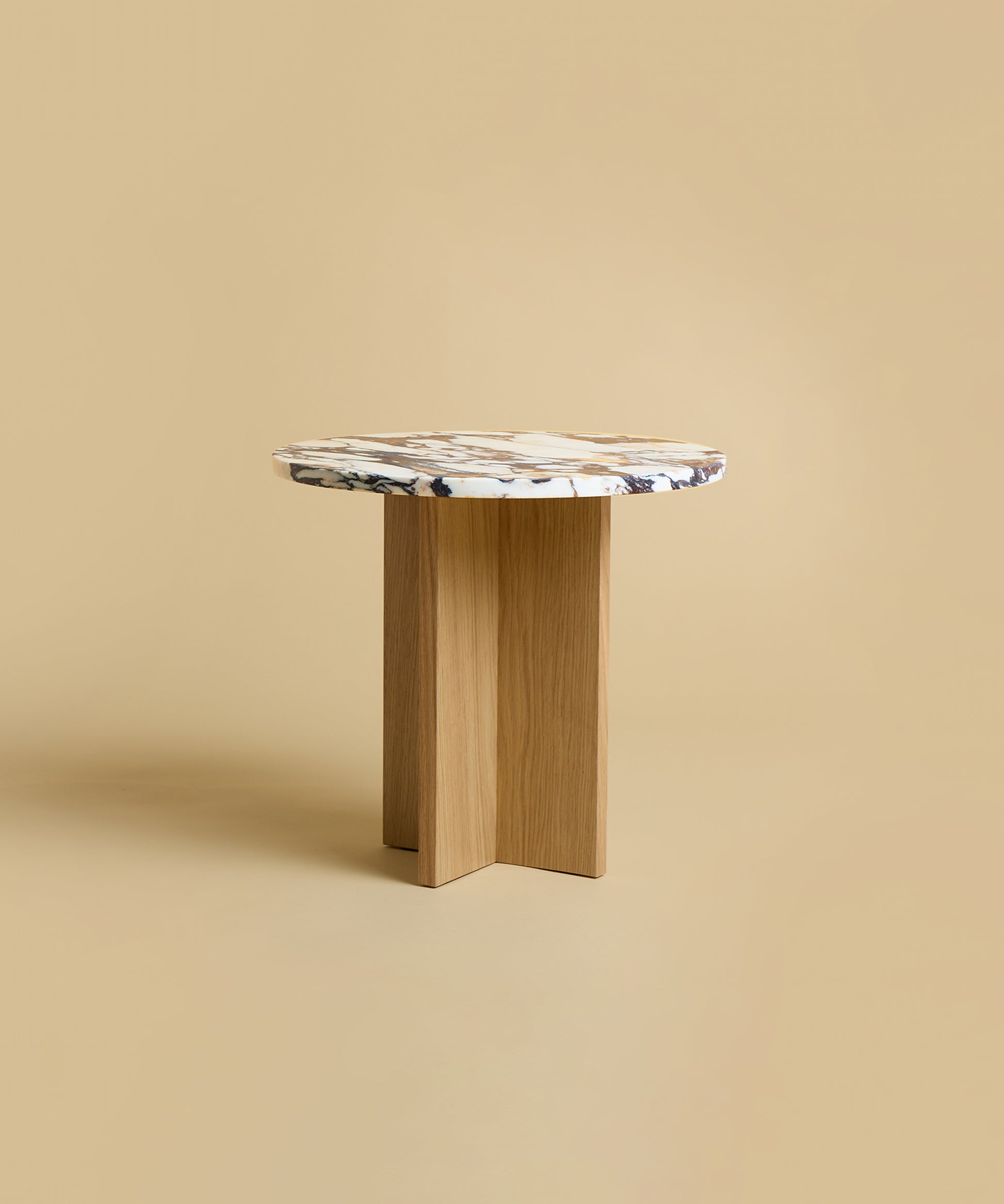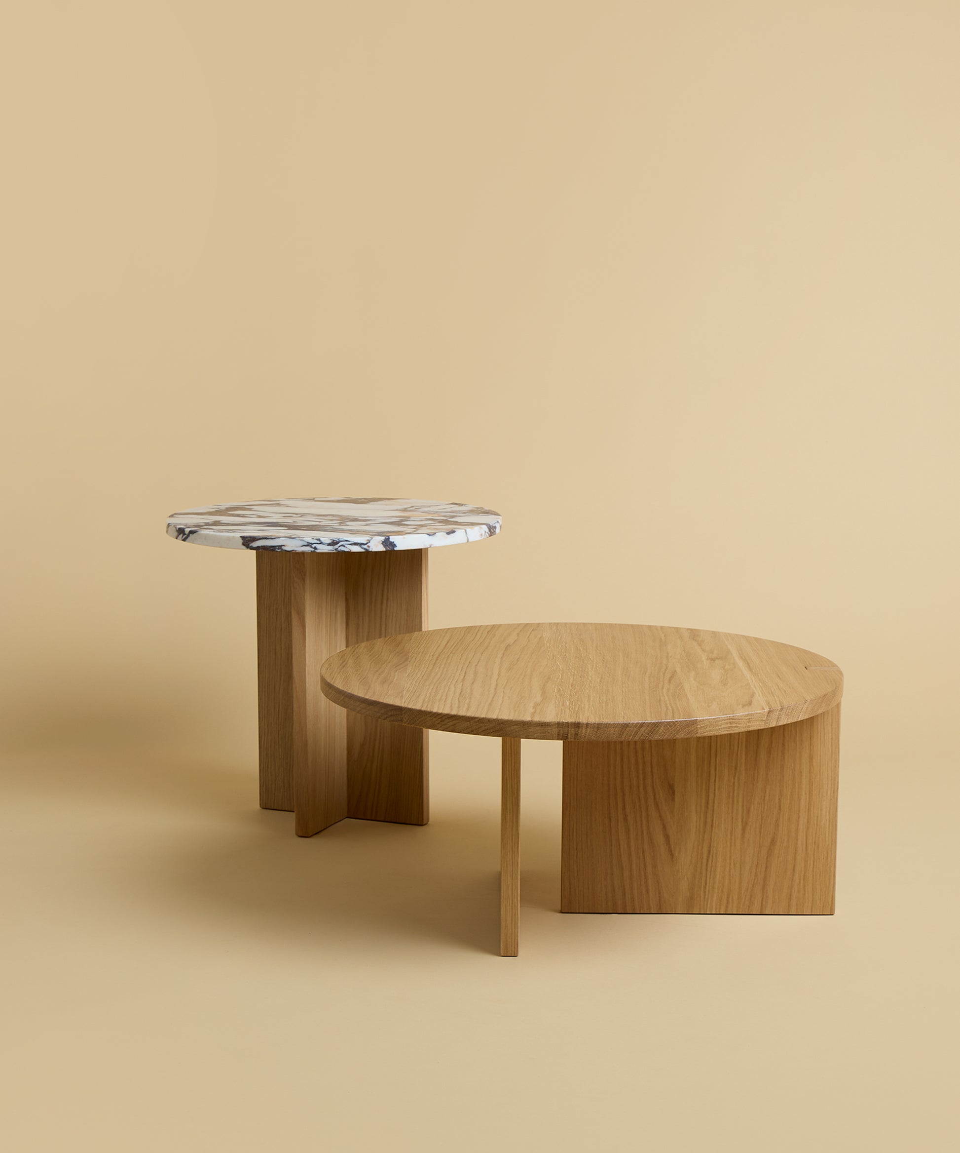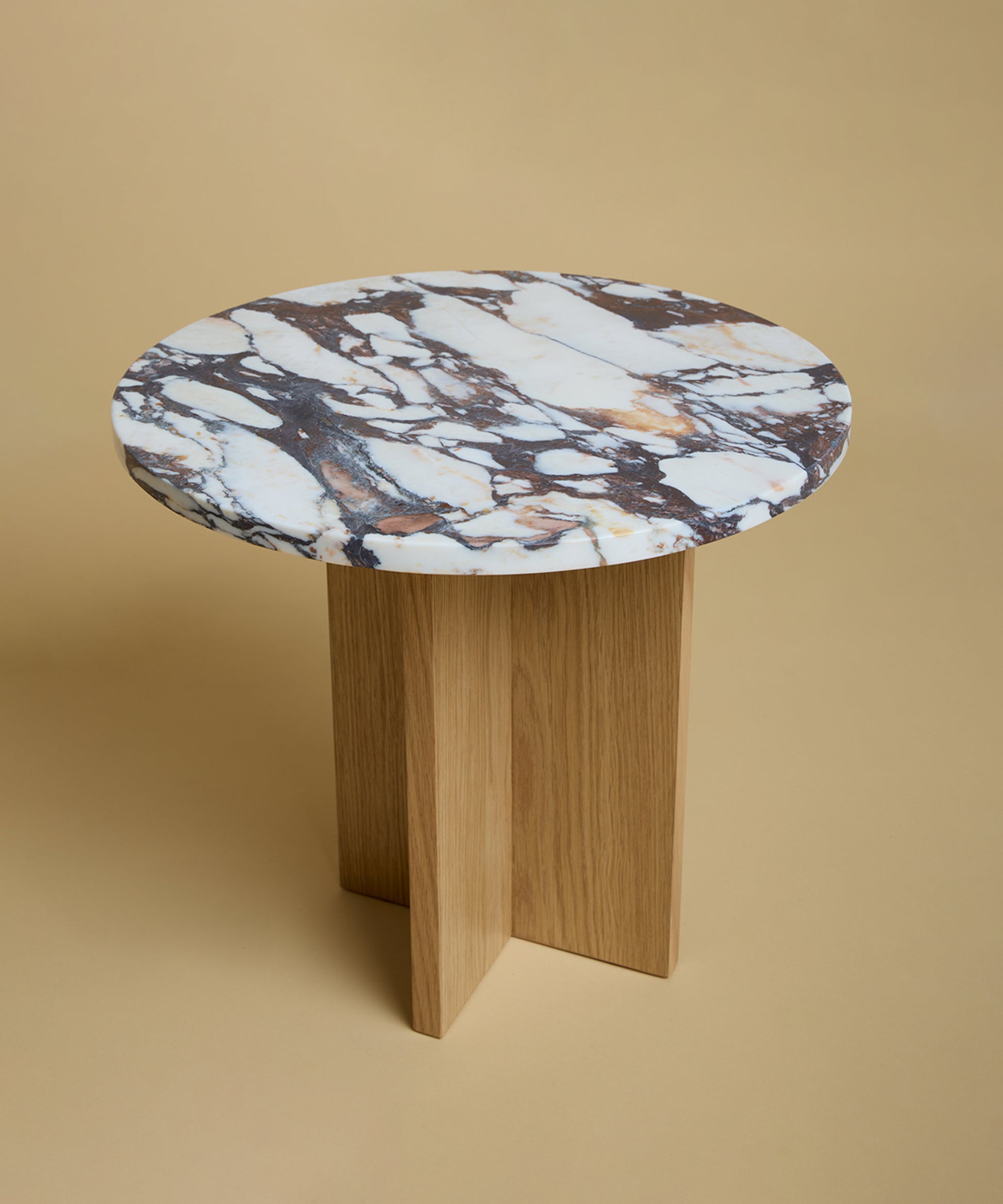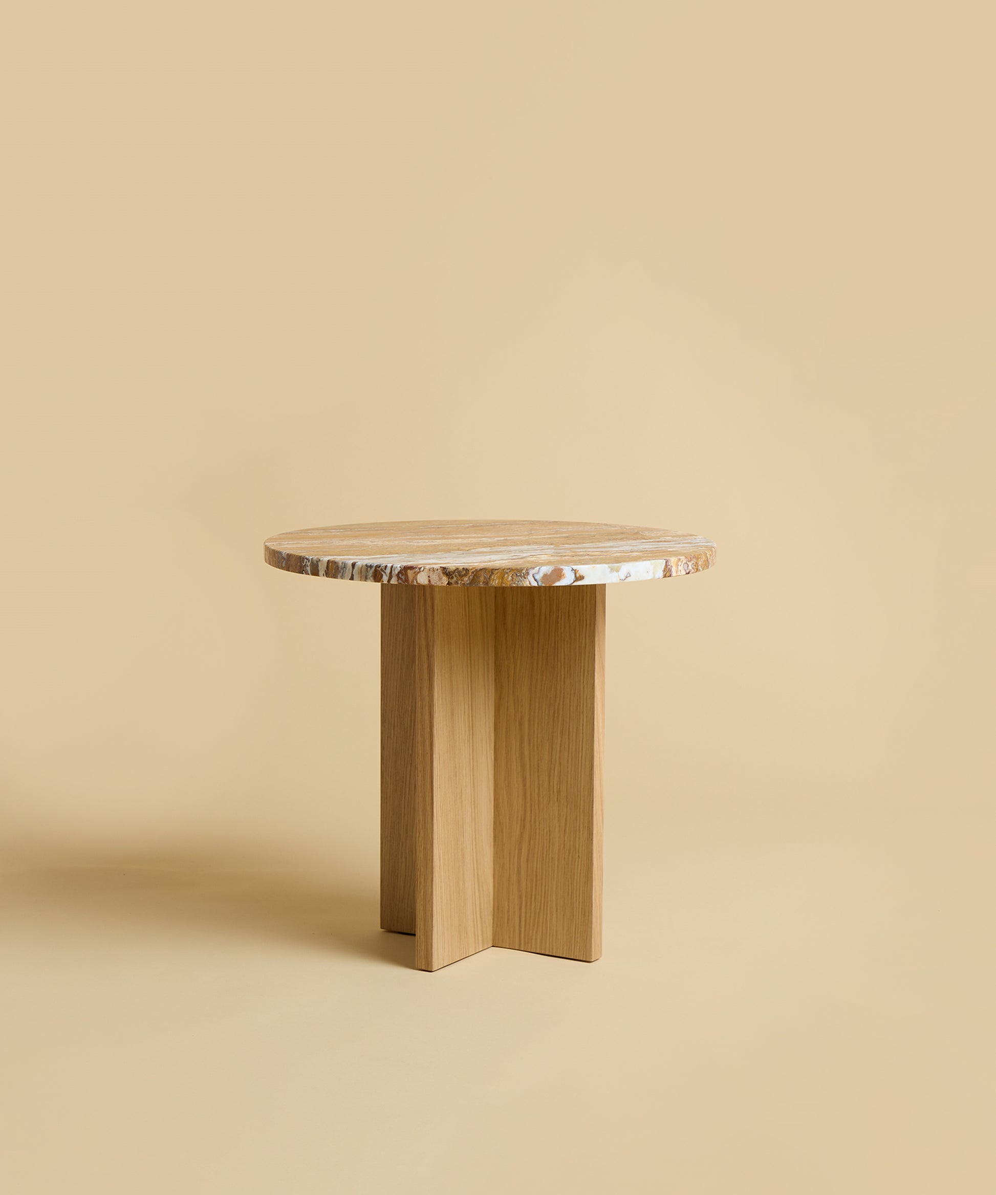 The Sherman coffee table is produced with an oak wood base and a Calacatta Viola marble or Orange Travertine marble top.