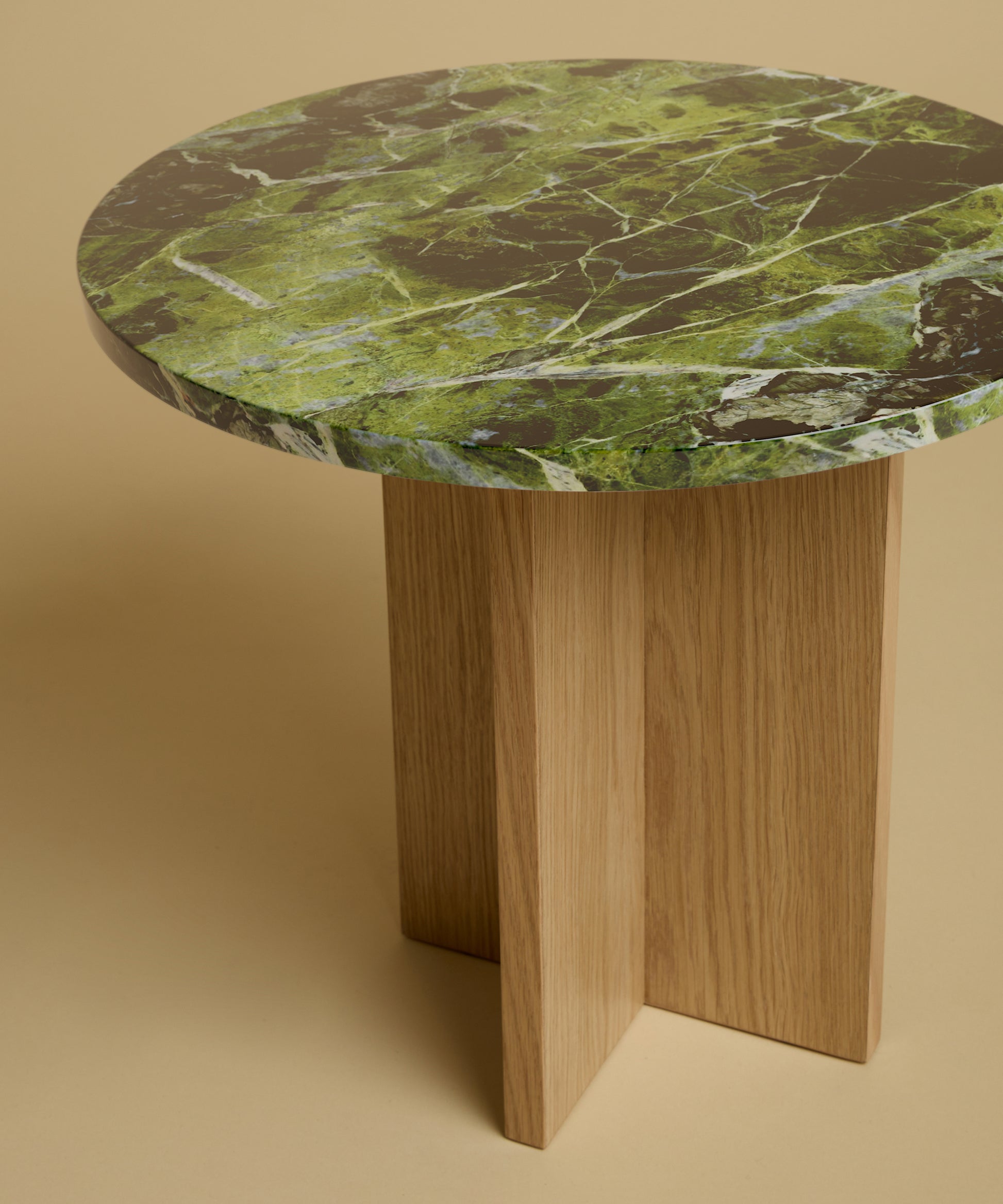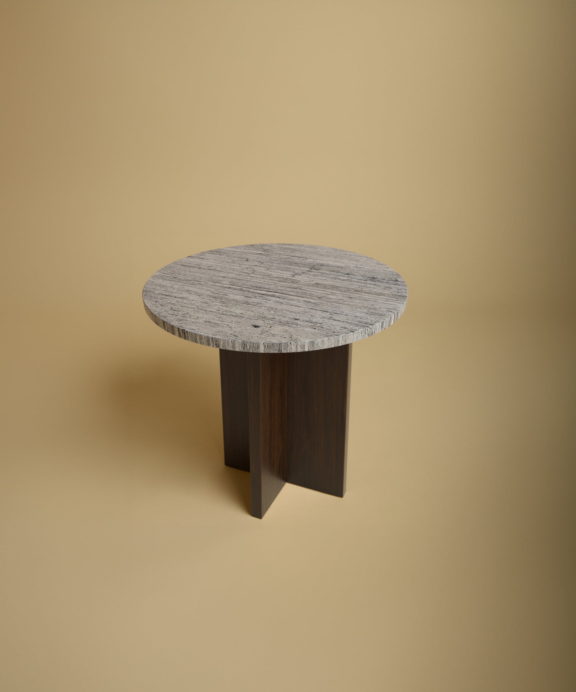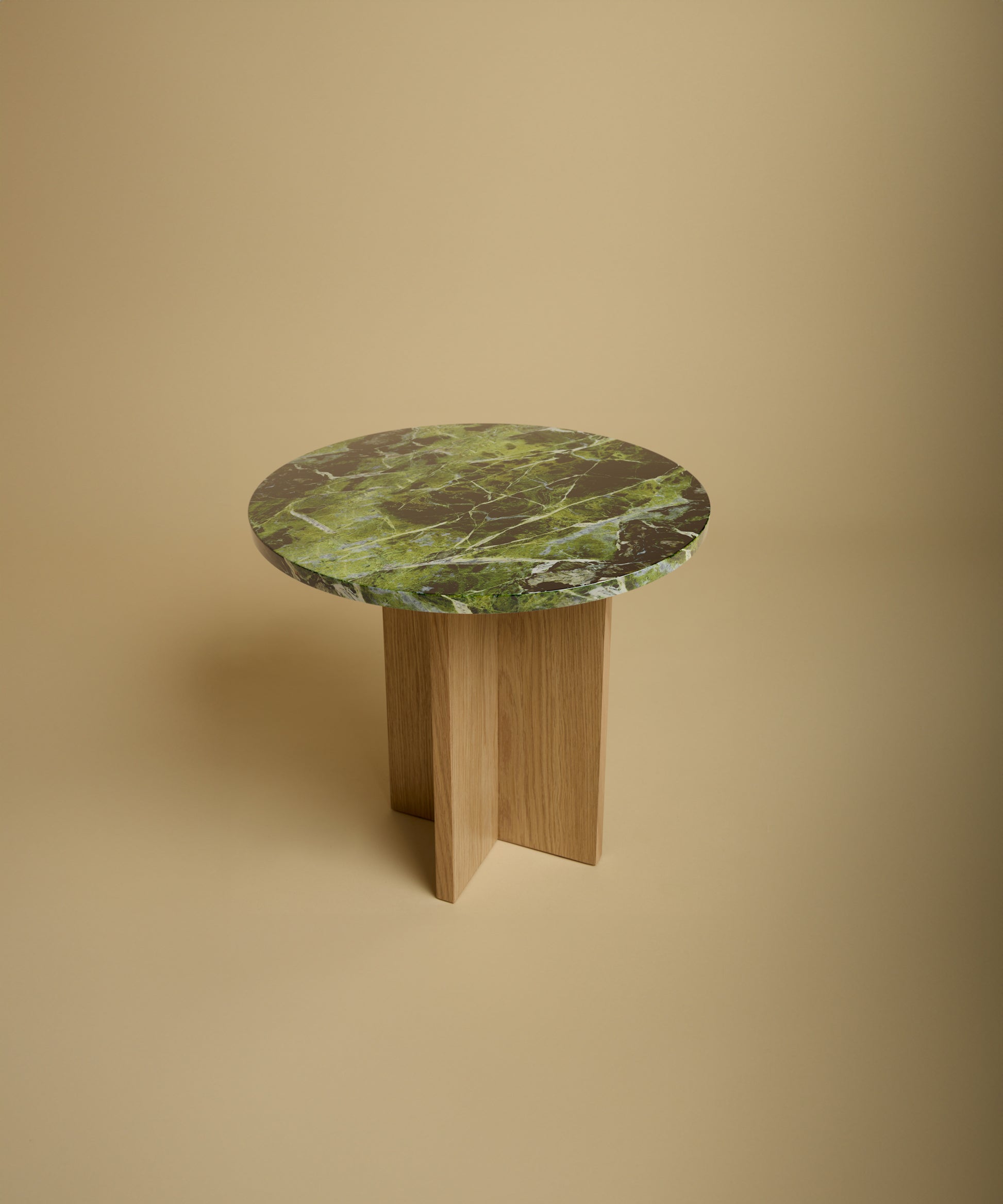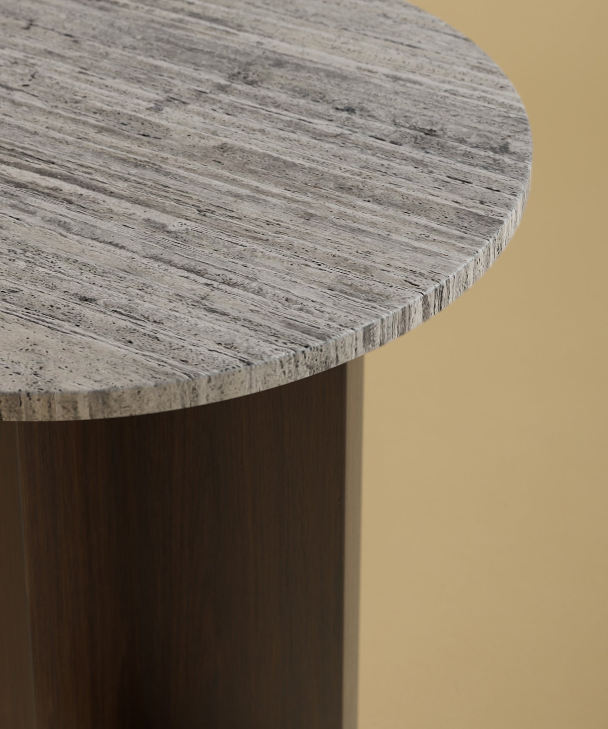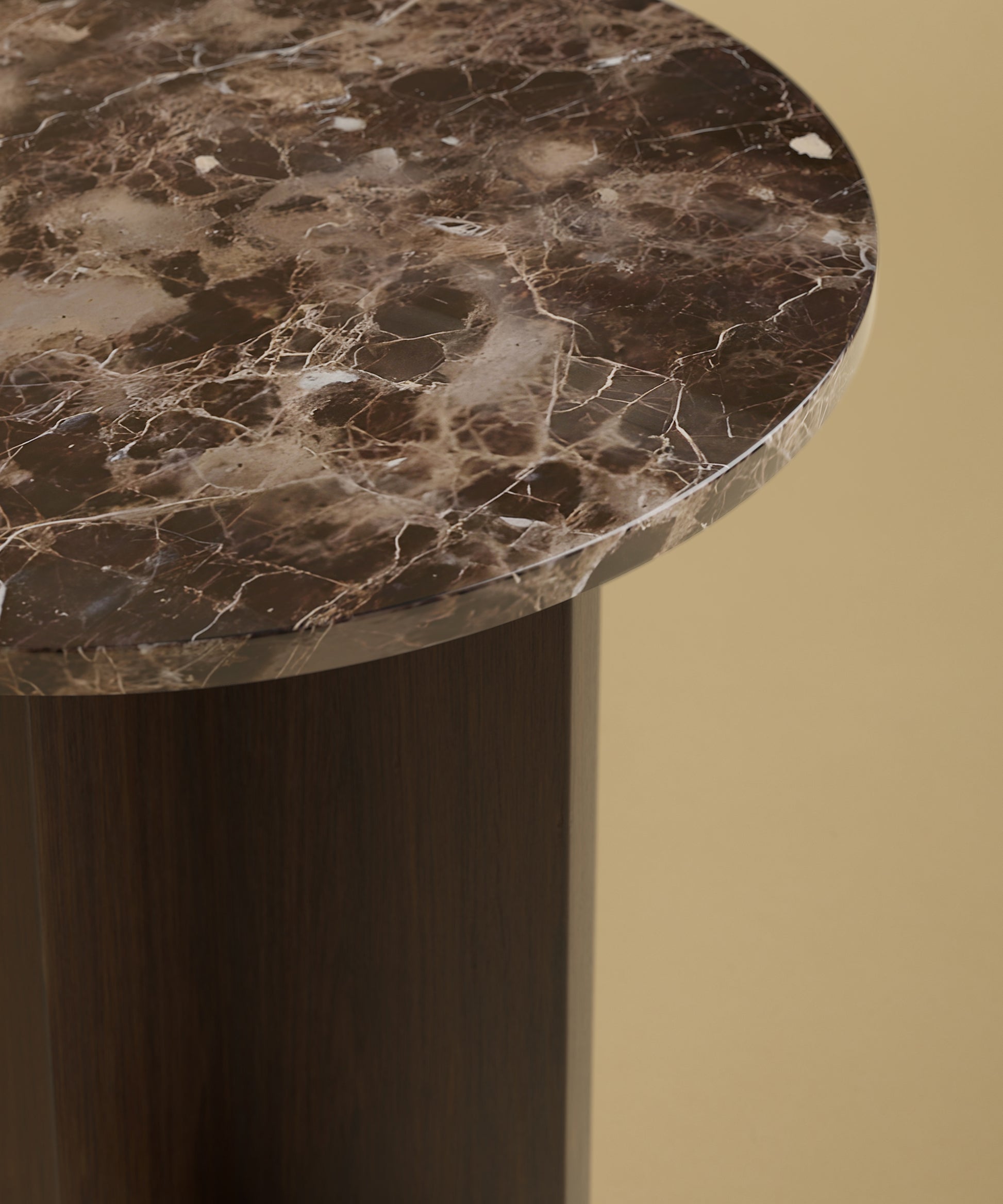 The Sherman coffee table is produced with an oak wood base and a Calacatta Viola marble or Orange Travertine marble top.