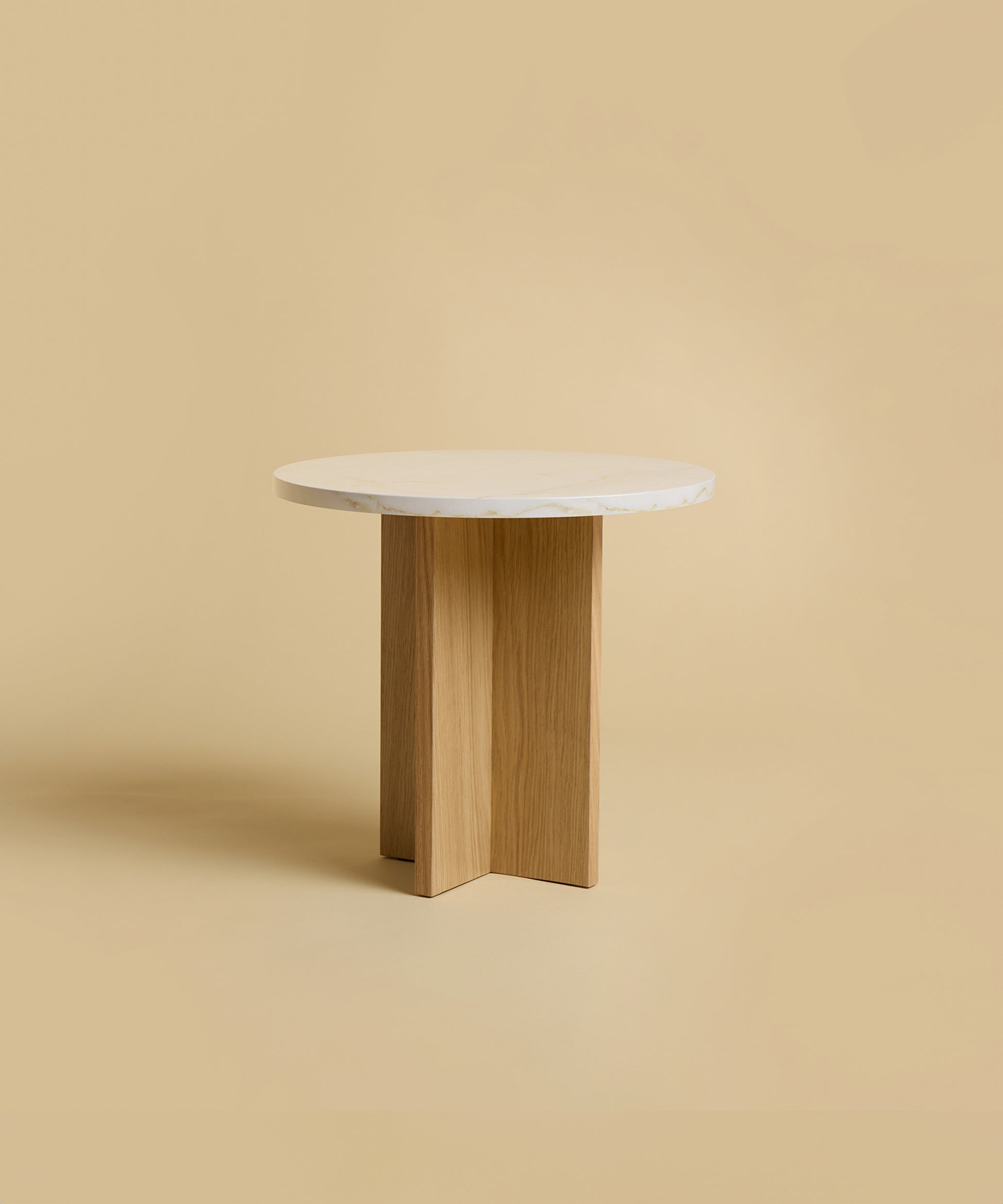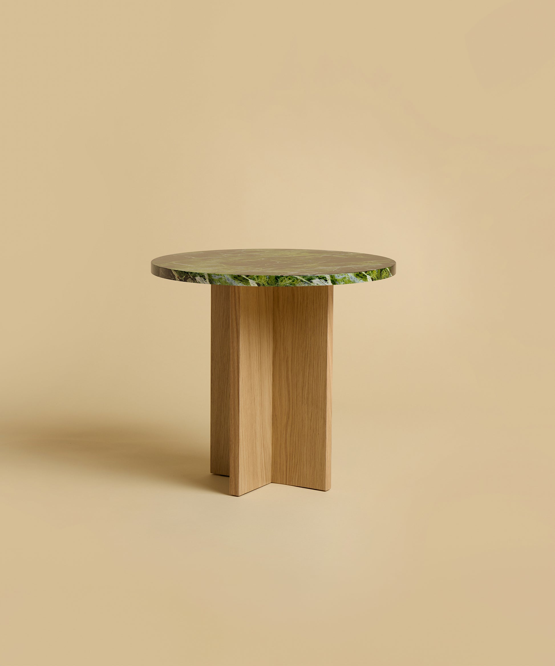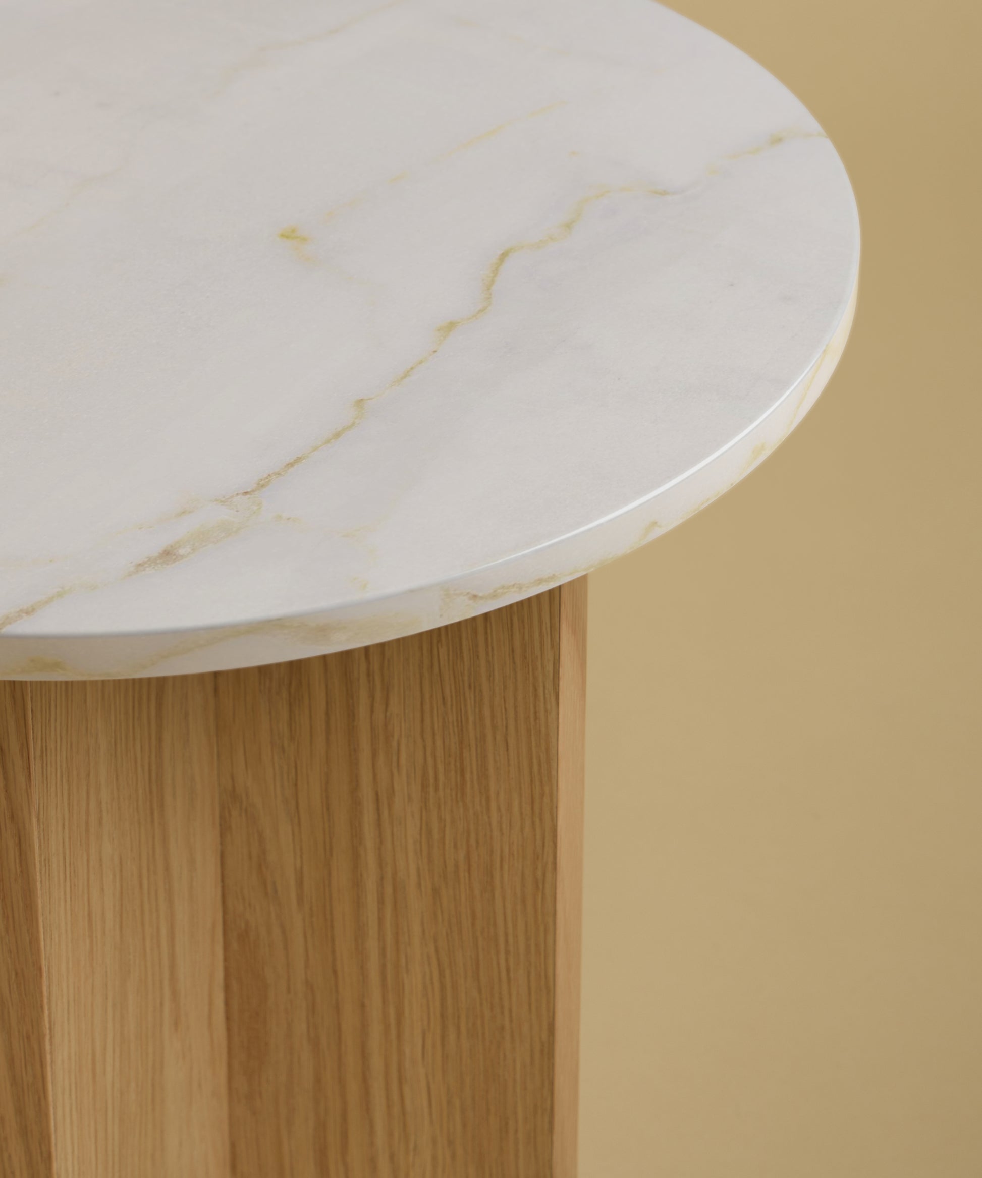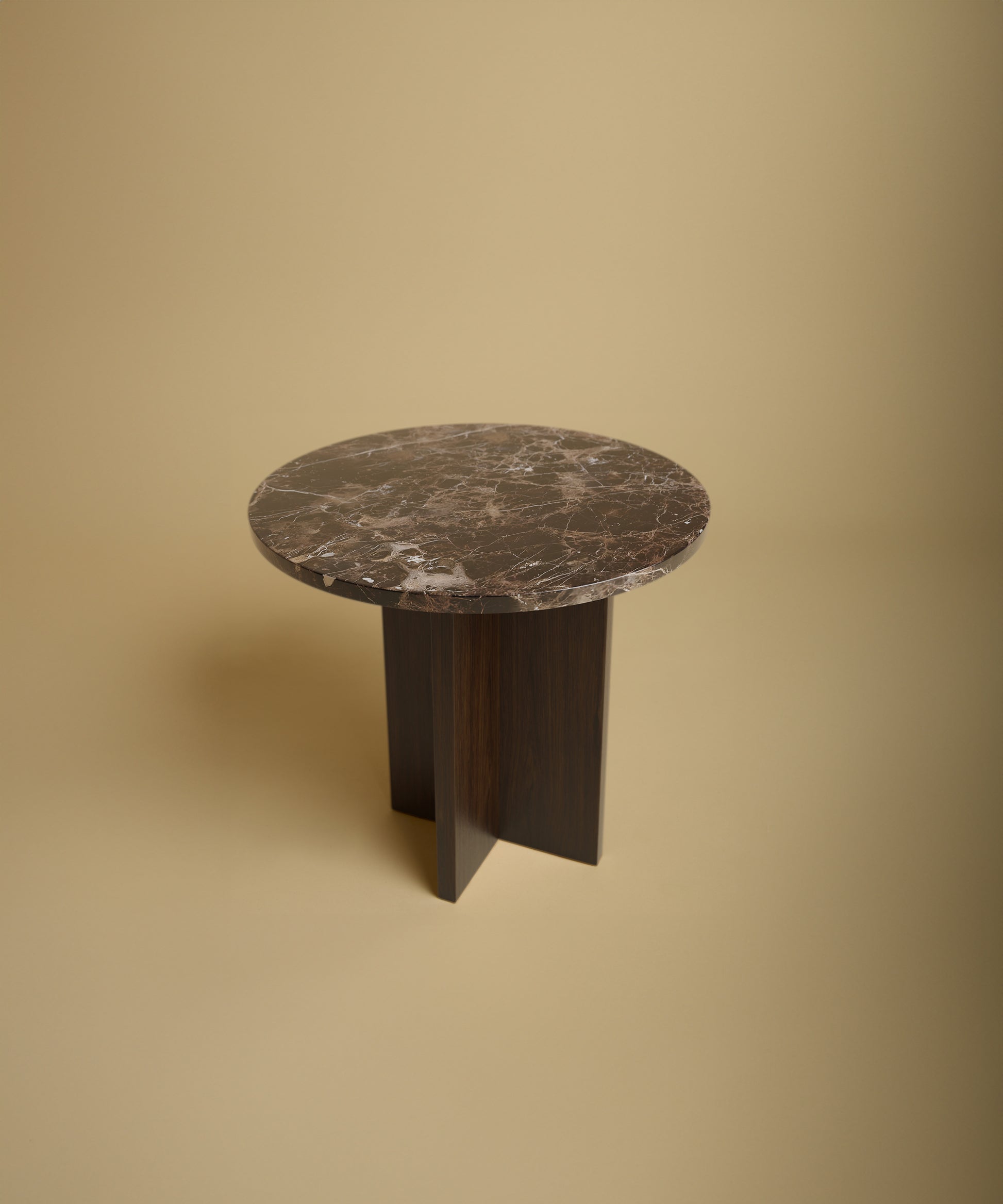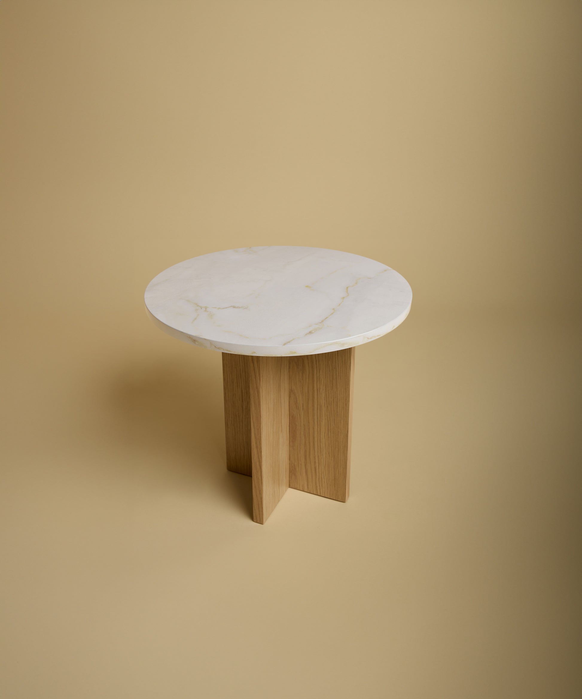 The Sherman coffee table is produced with an oak wood base and a Calacatta Viola marble or Orange Travertine marble top.