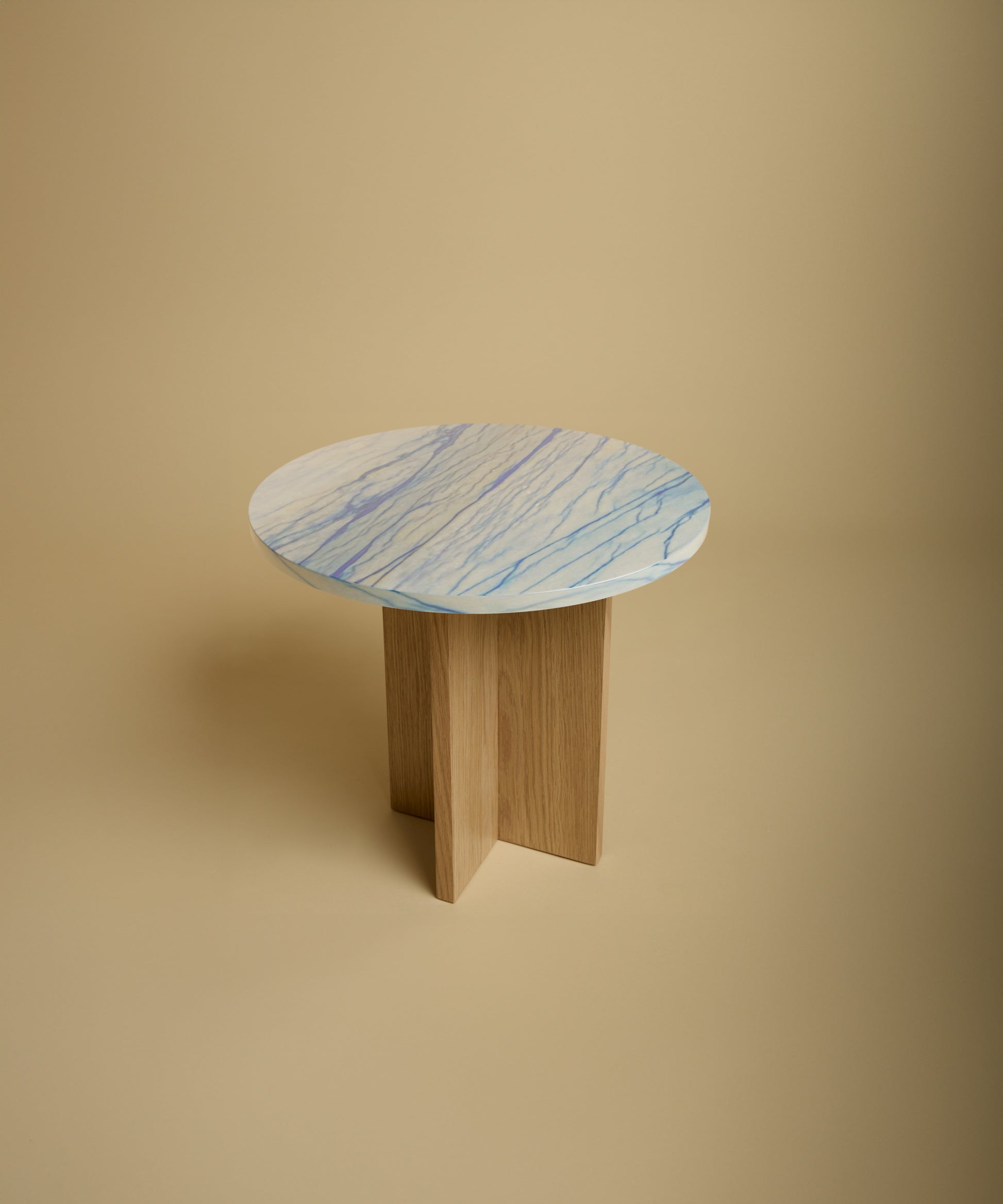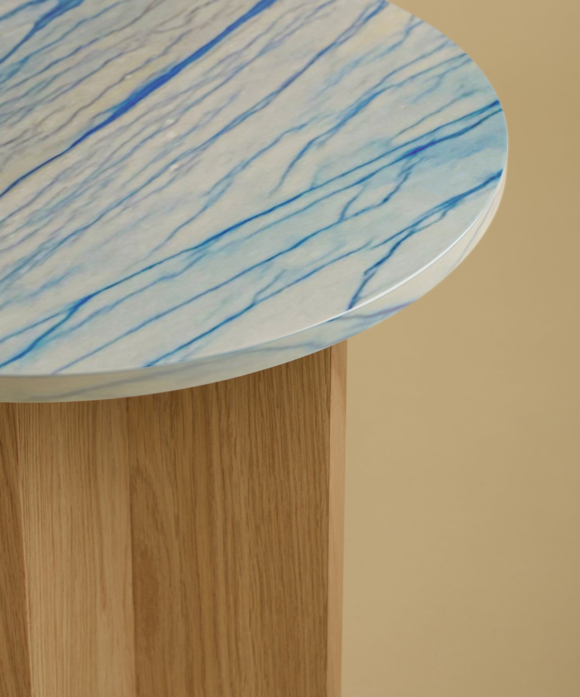 The top is circular, while the base is obtained by gluing oak planks perpendicular to each other.