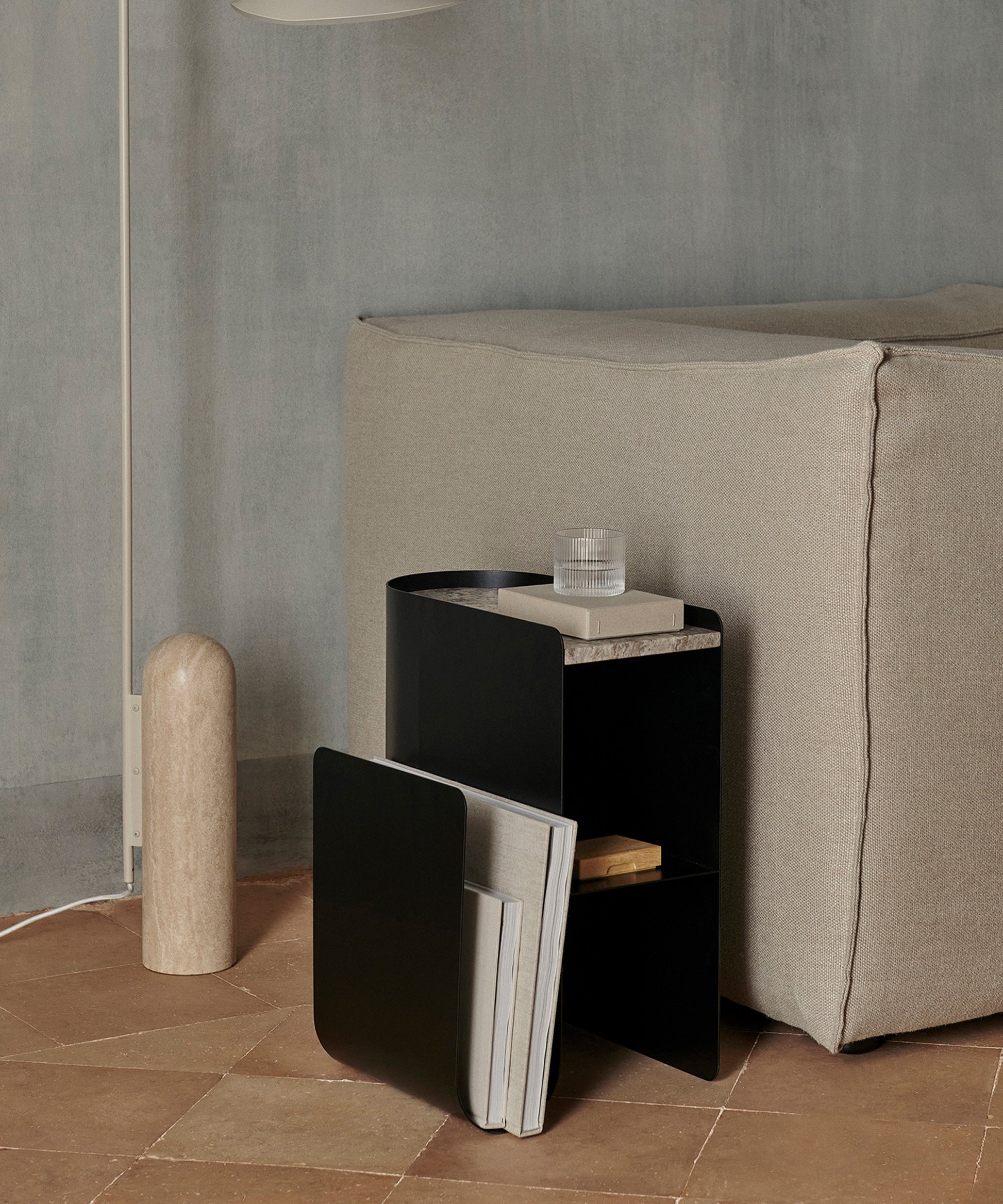 With a name that mirrors the arched shape of the powder-coated steel base, this table allows you to store your favorite books or magazines on the vaulted side, while the practical shelf is ideal for displaying decorative objects. The tabletop itself is made of beautiful, natural marble, providing the Vault Side Table with a warm, sophisticated expression.