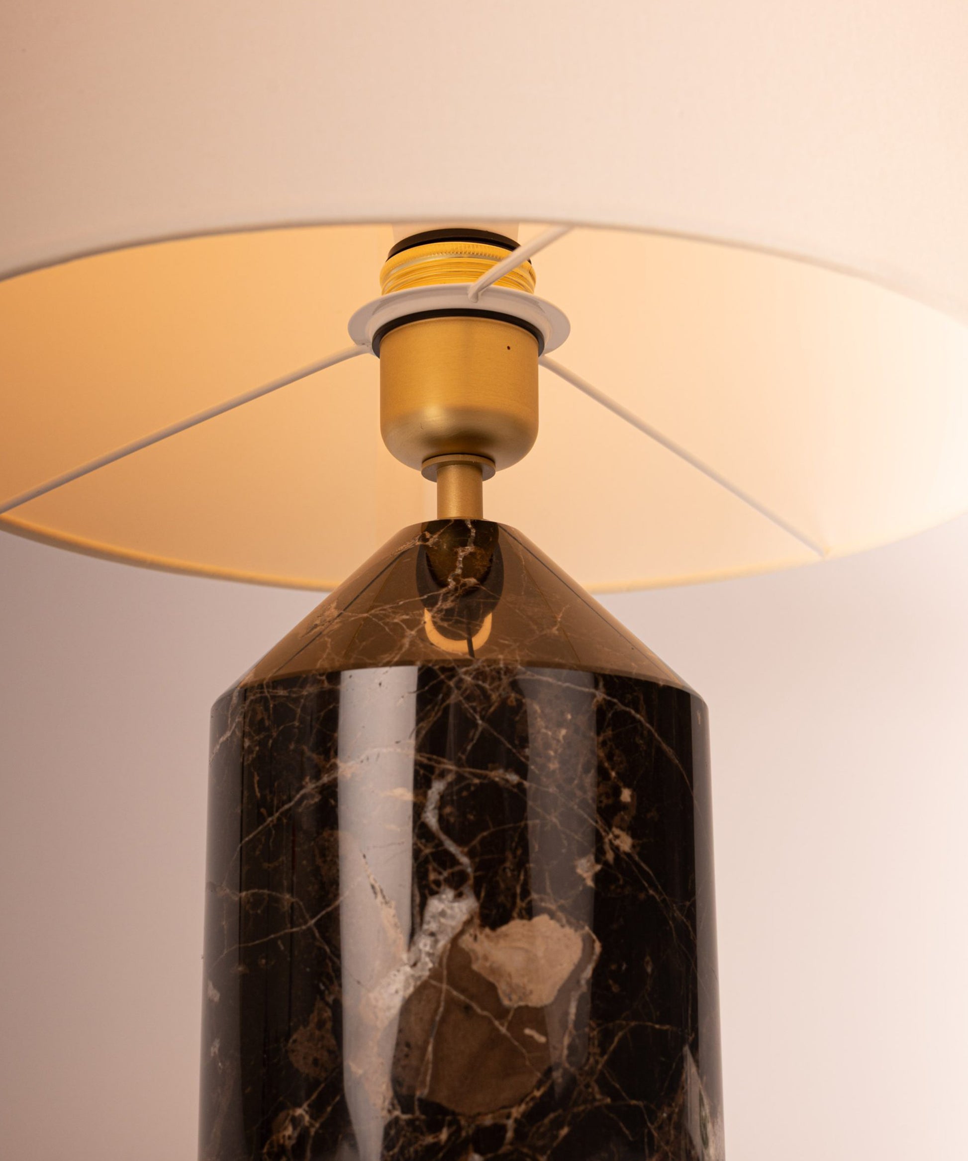 Wood, alabaster,ceramic, or marble base, brass or steel hardware, cotton shade