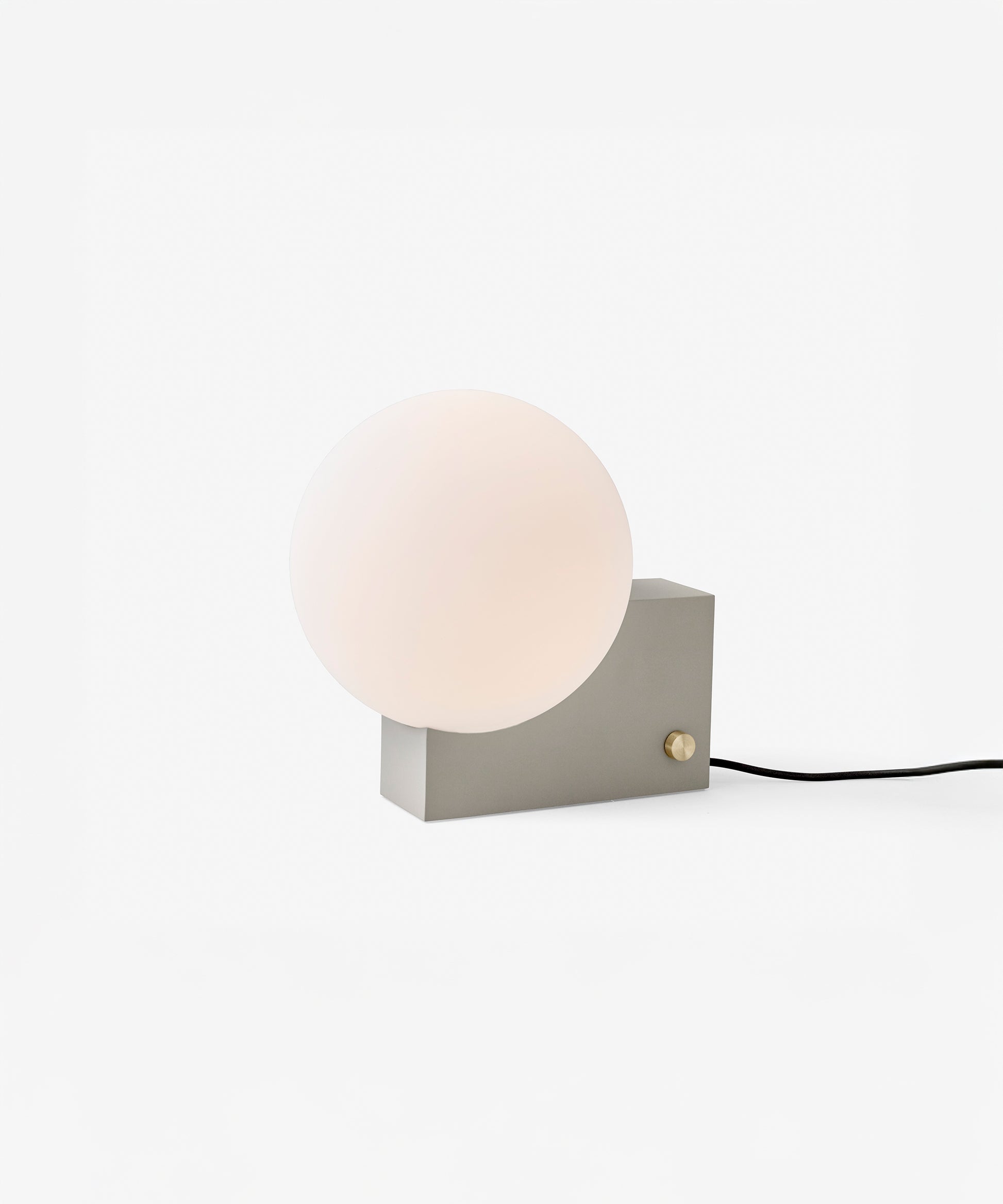 Denoted by its cubic base and curved opal shade, the Journey lamp exhibits an interplay between solid and translucent forms.