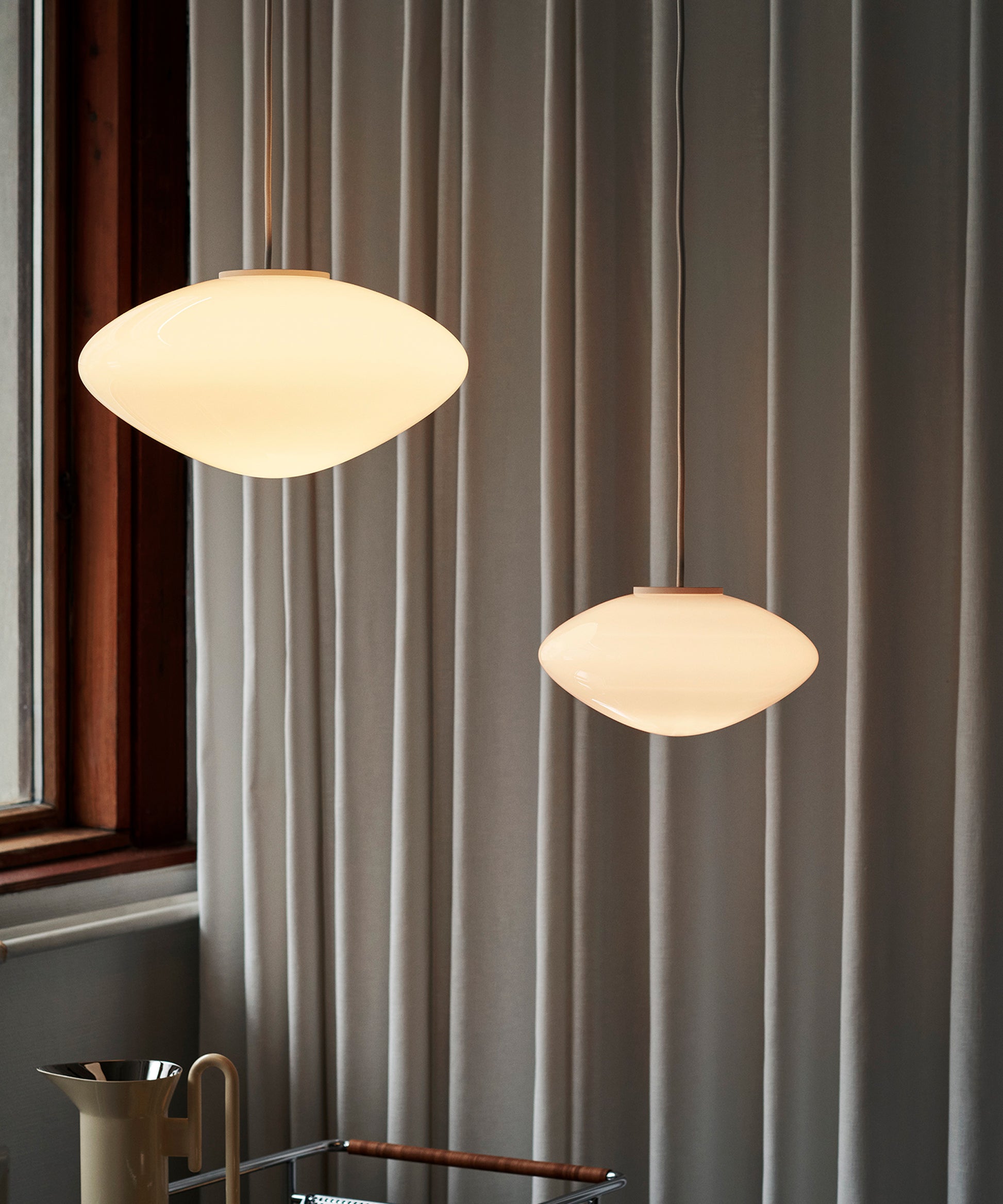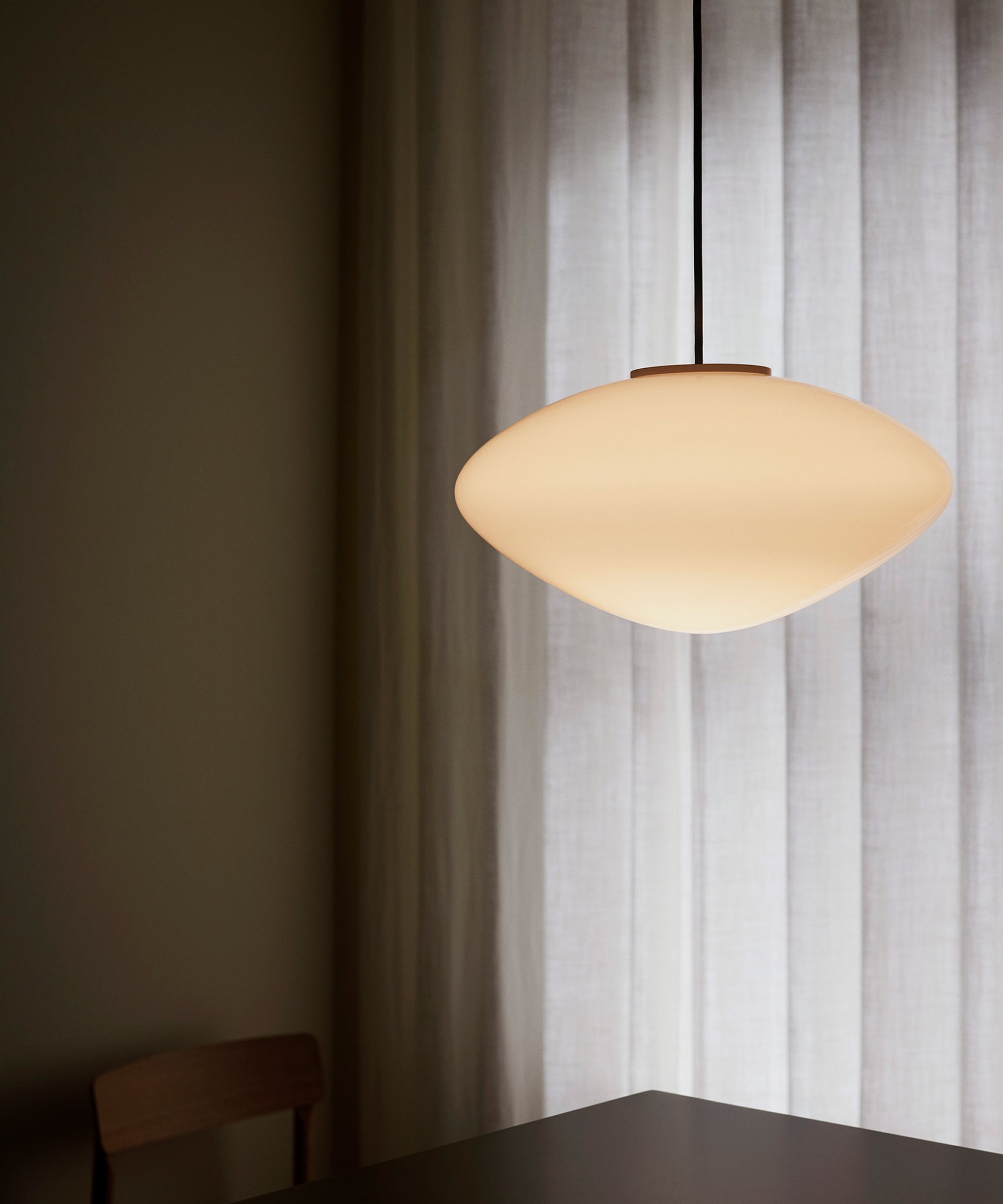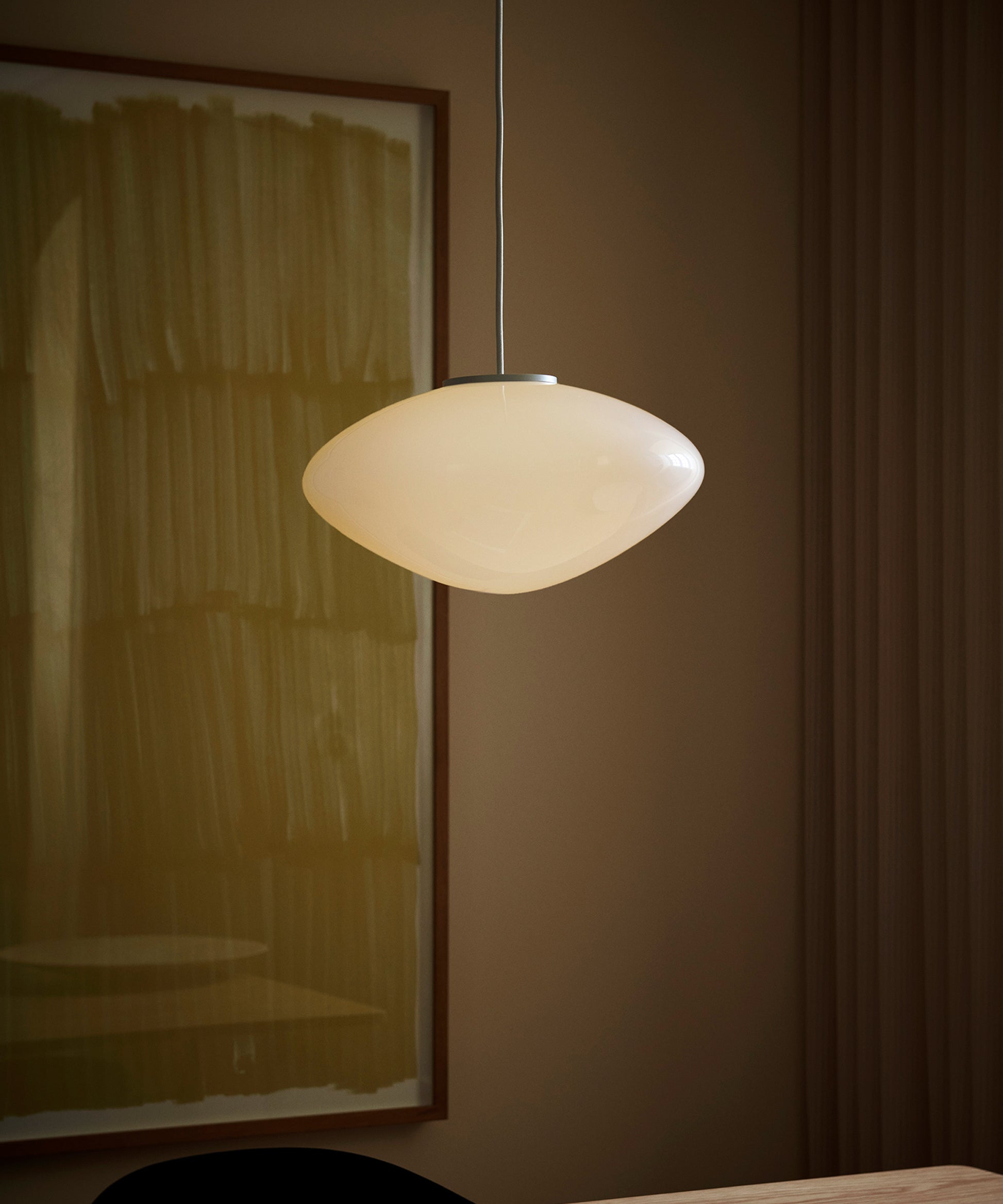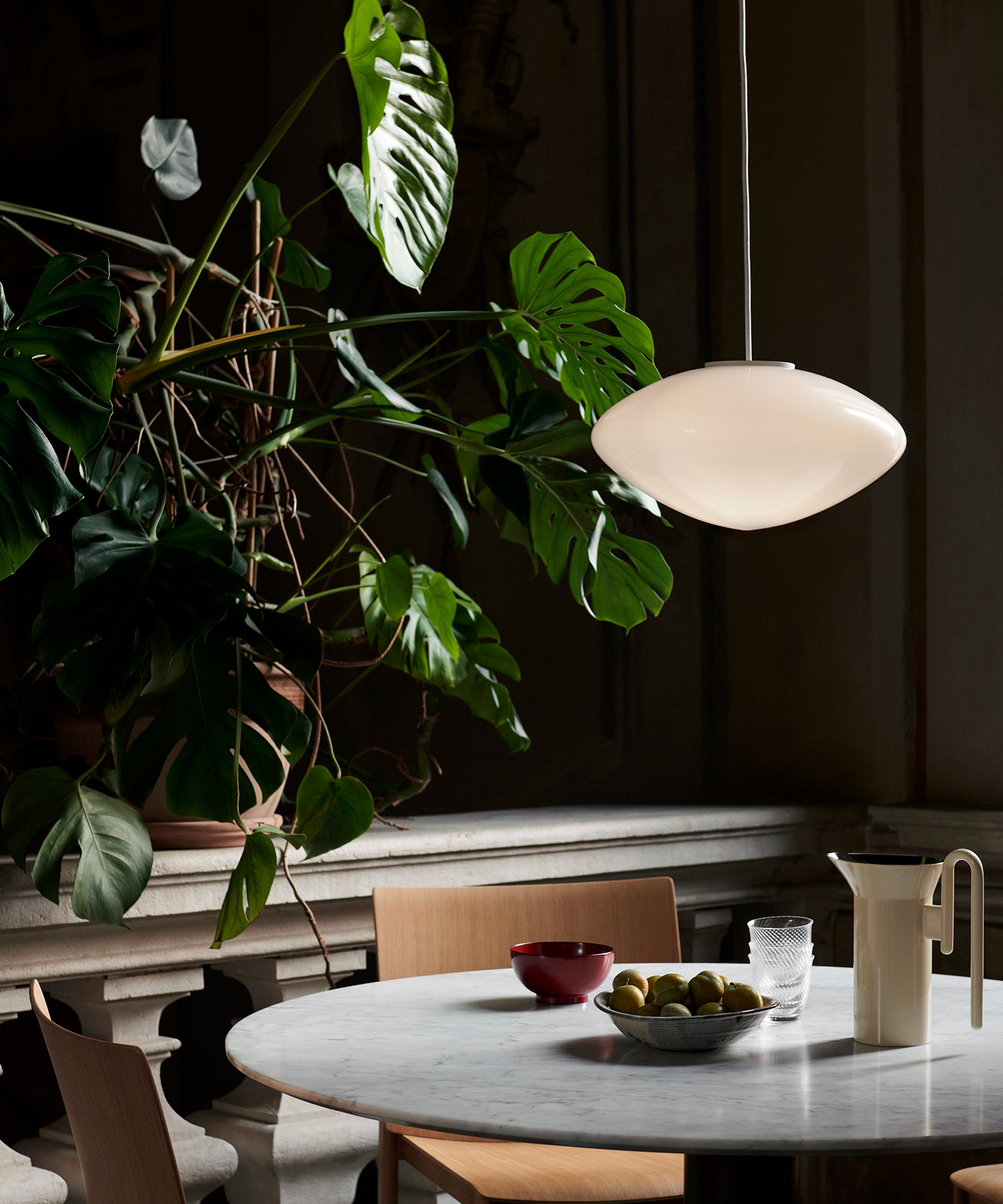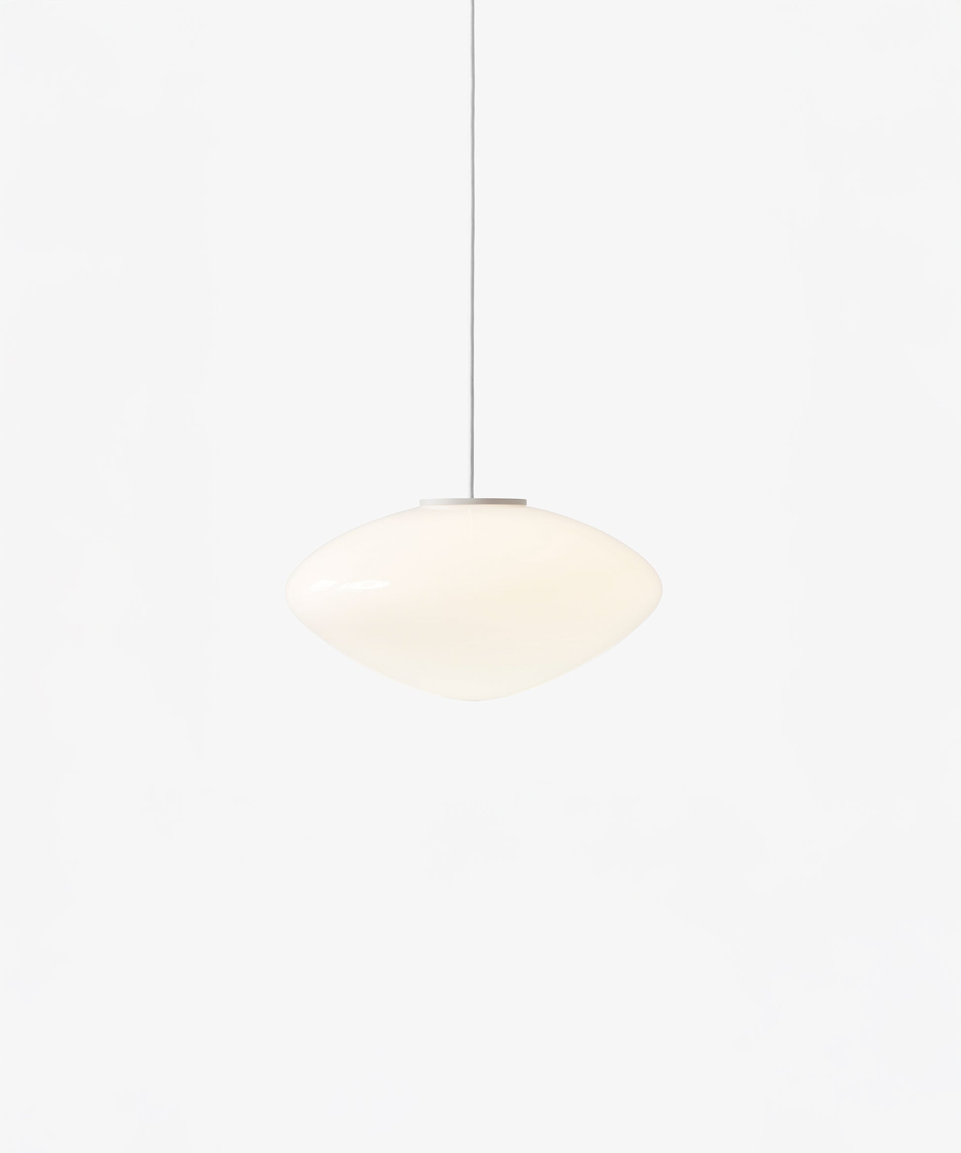 Crafted from mouth-blown opal glass with white coated aluminium details and a textile cord, the Mist pendant appears to float when suspended, creating a visually striking ensemble when arranged in a cluster.
