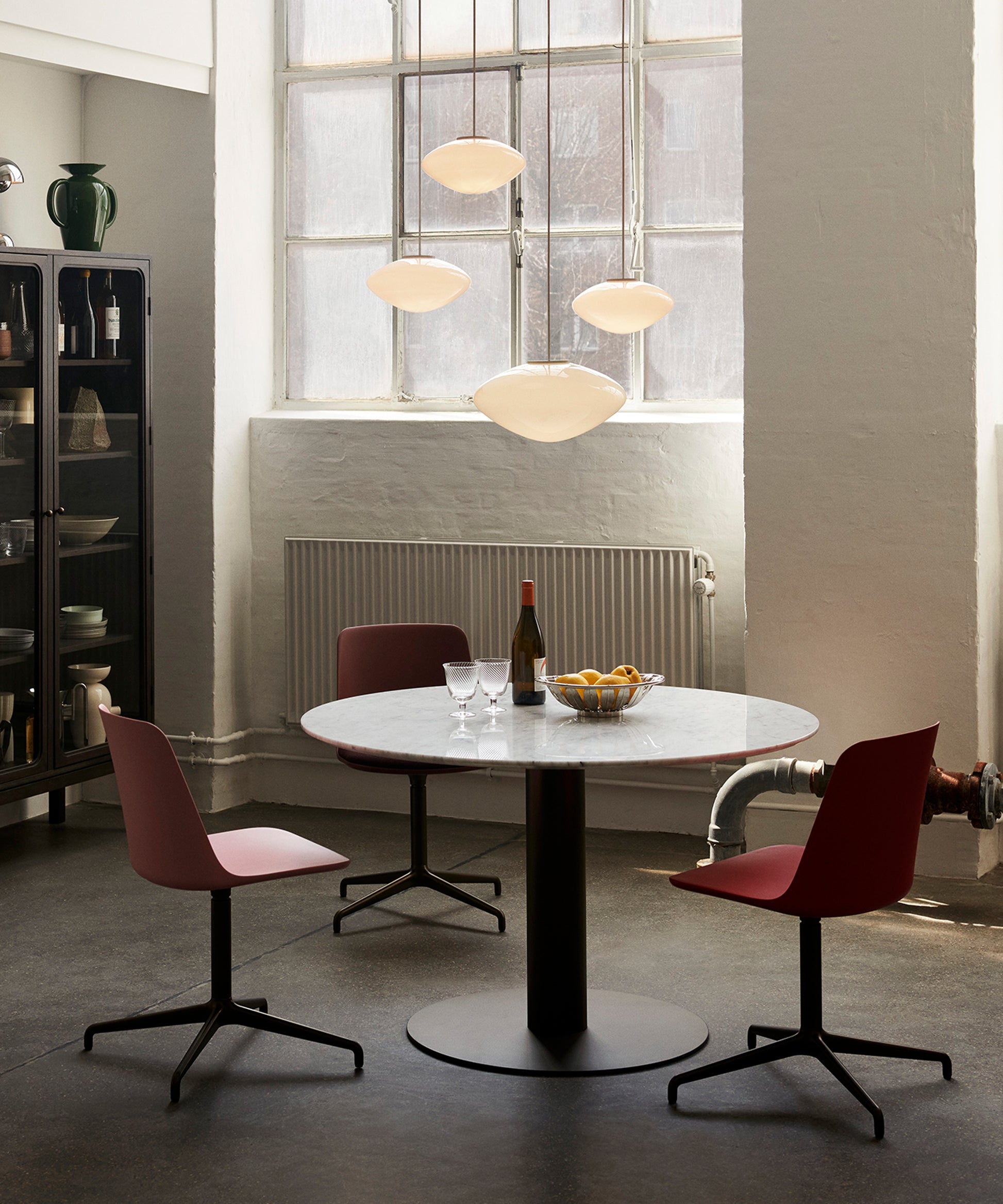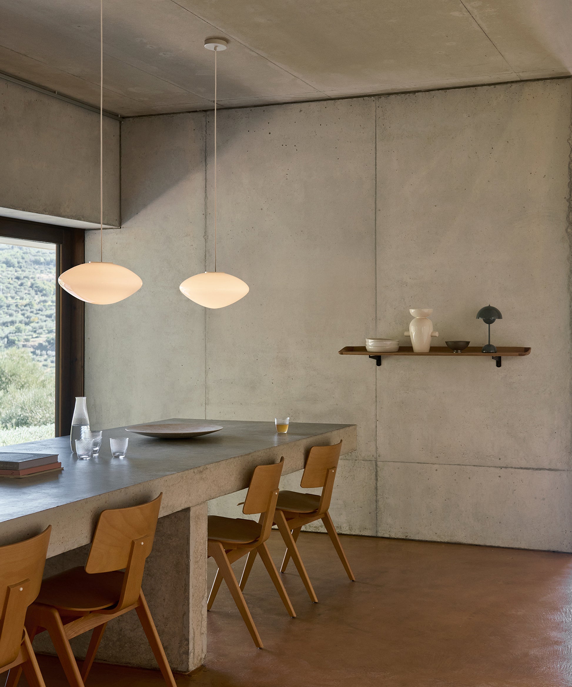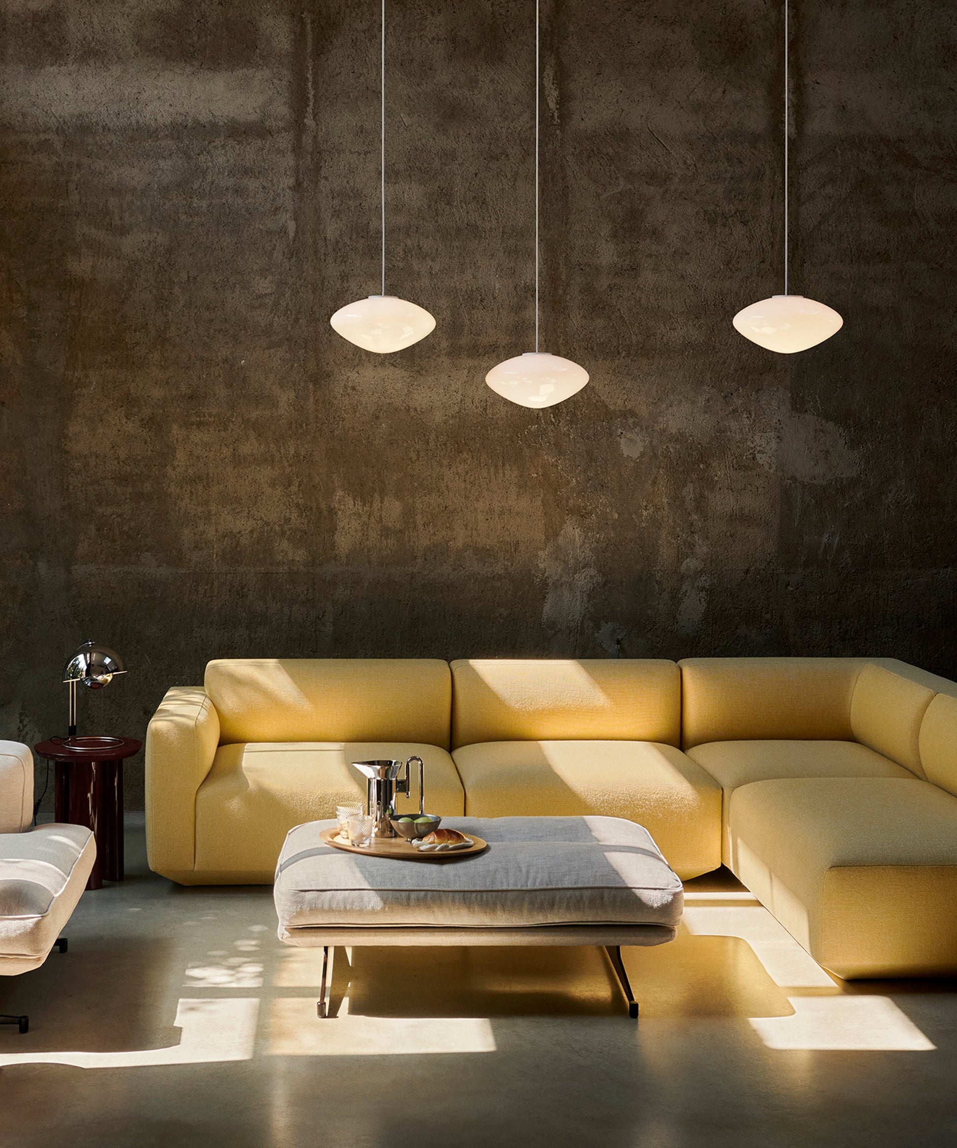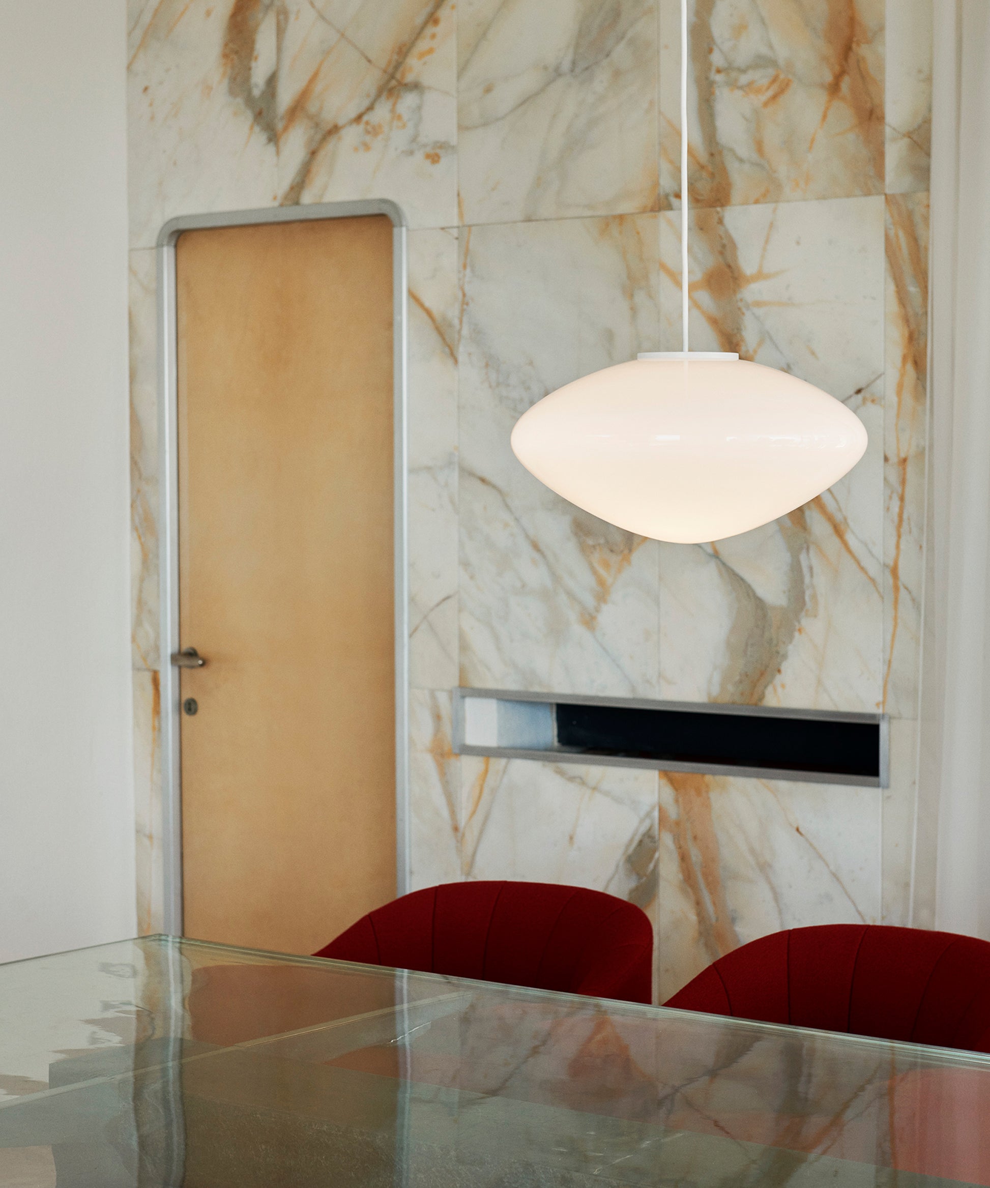 Crafted from mouth-blown opal glass with white coated aluminium details and a textile cord, the Mist pendant appears to float when suspended, creating a visually striking ensemble when arranged in a cluster.
