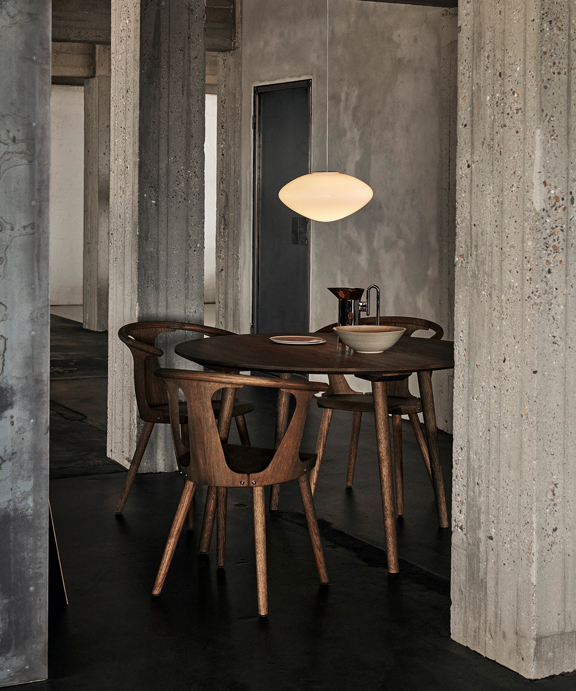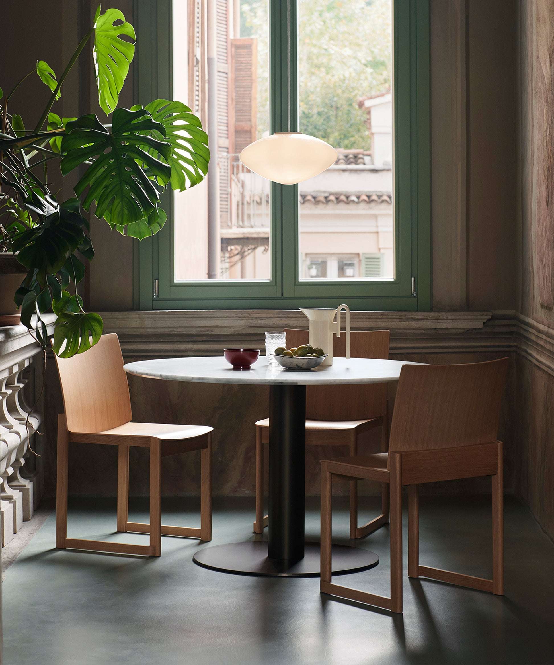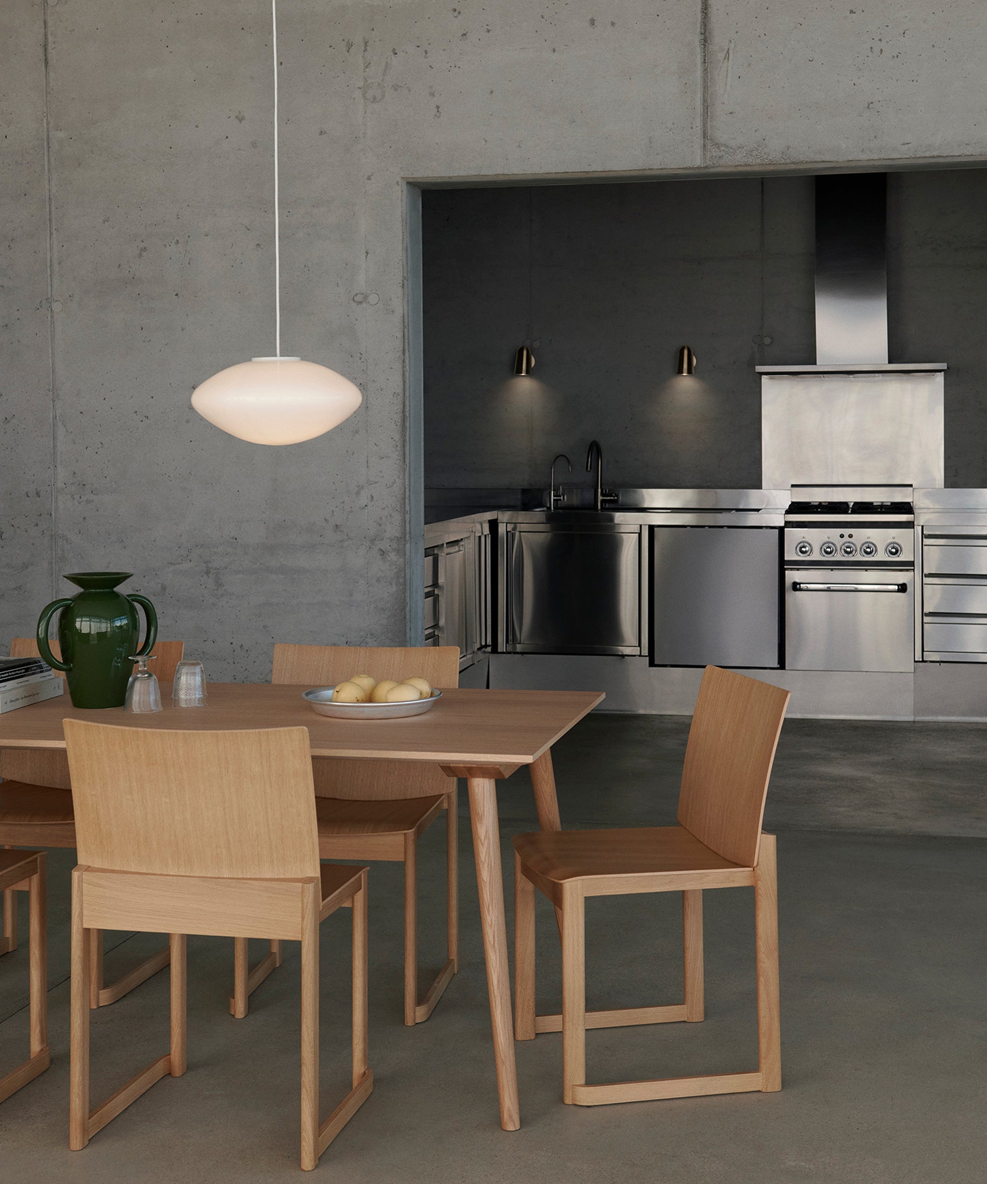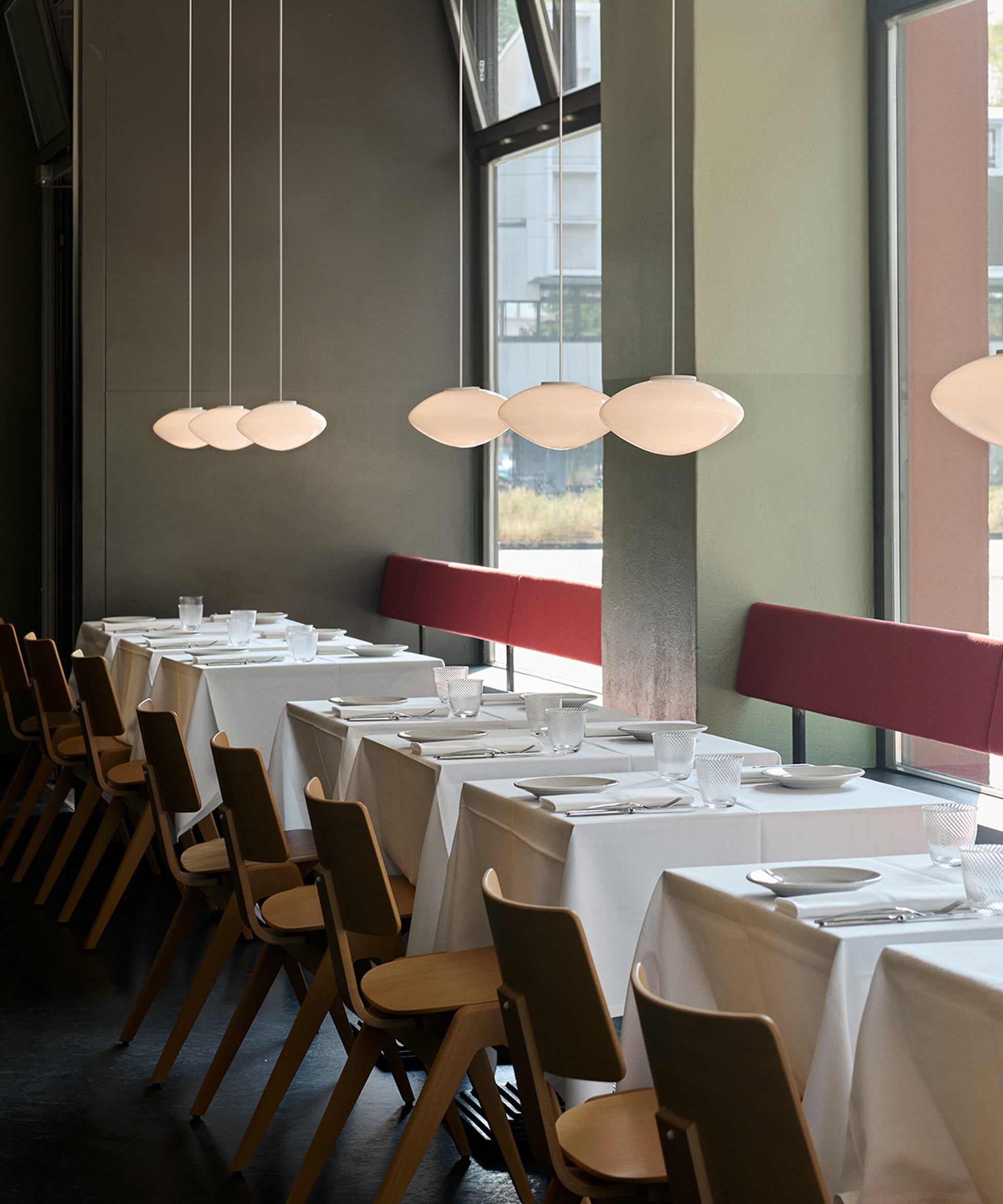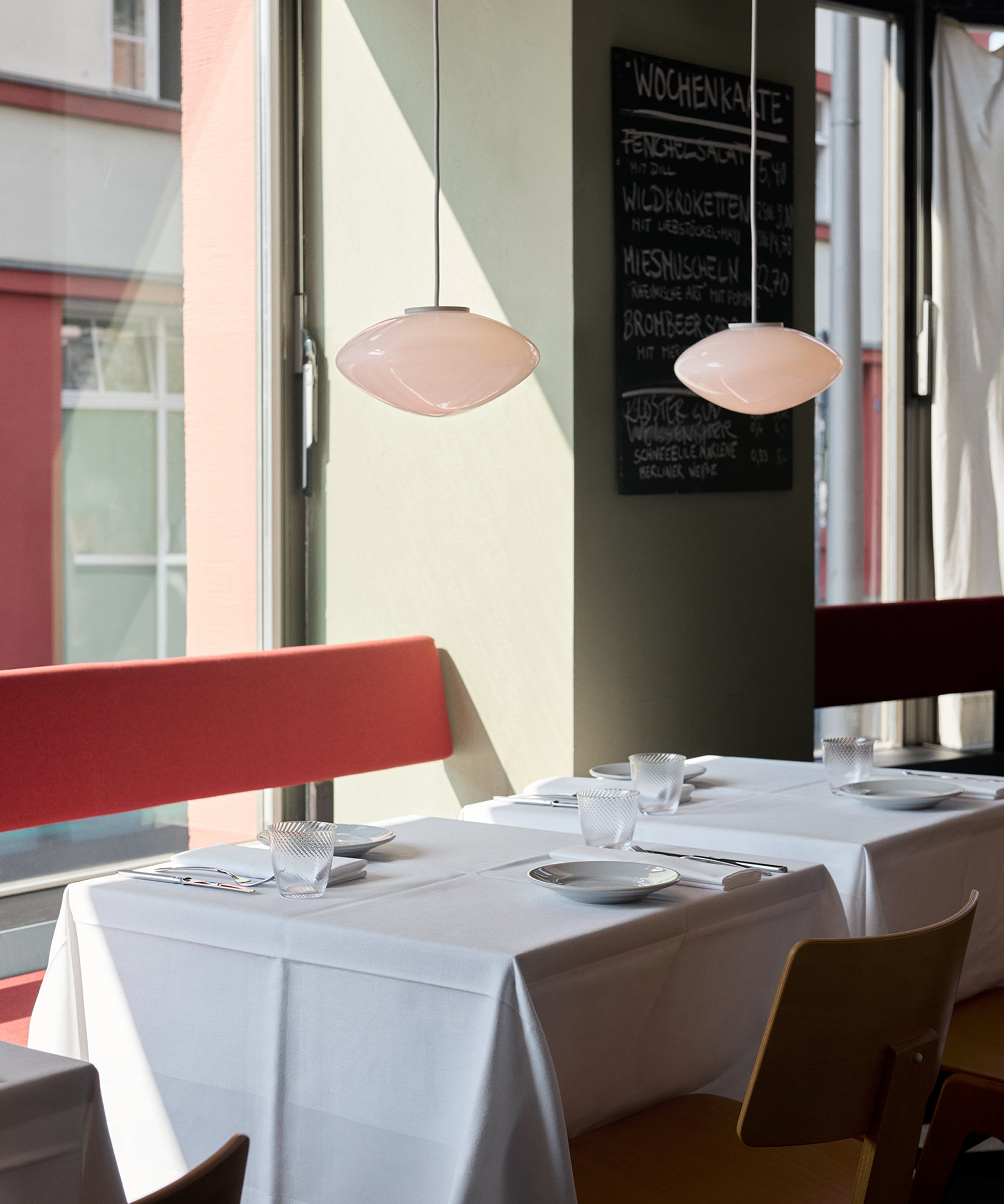 Crafted from mouth-blown opal glass with white coated aluminium details and a textile cord, the Mist pendant appears to float when suspended, creating a visually striking ensemble when arranged in a cluster.