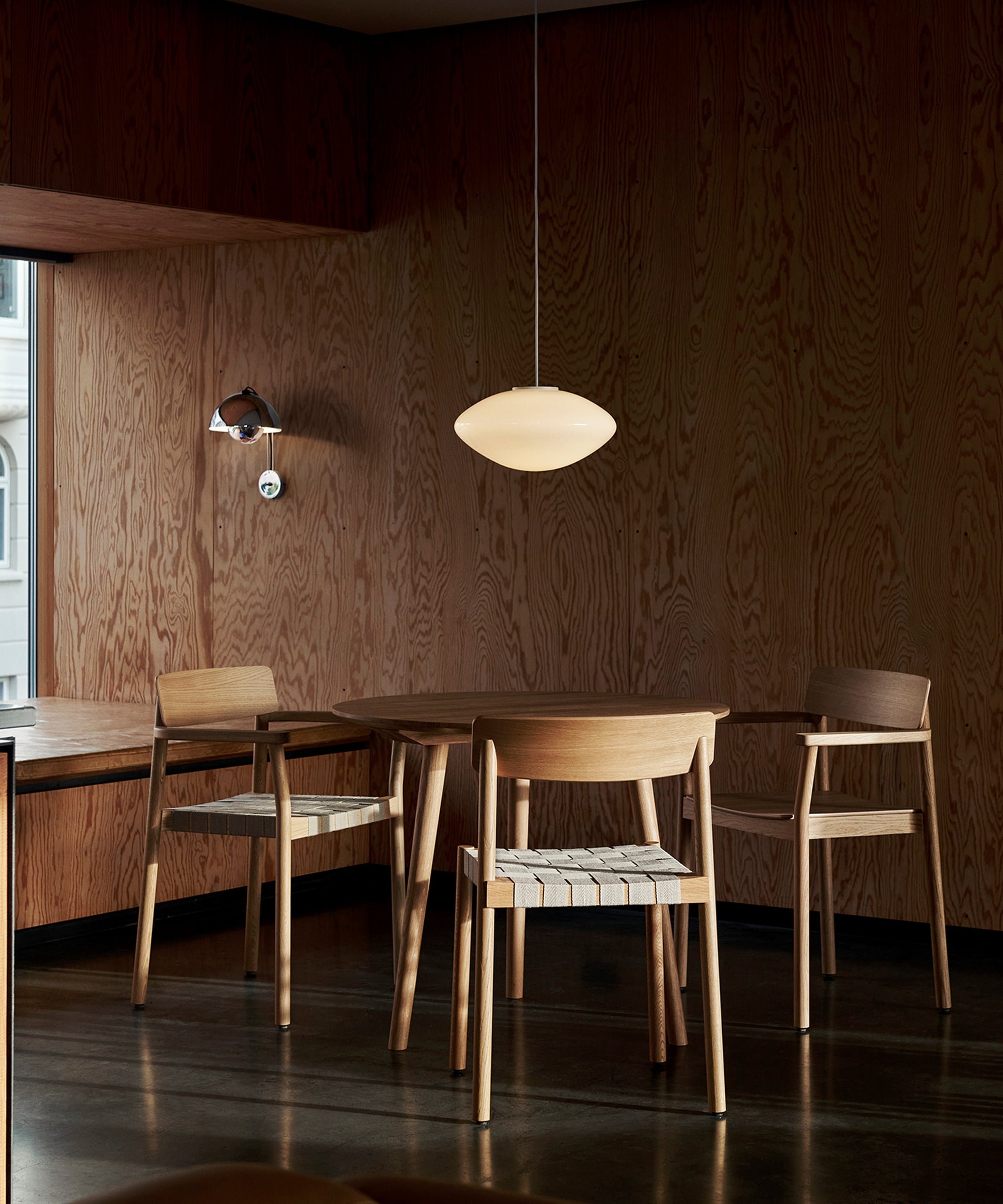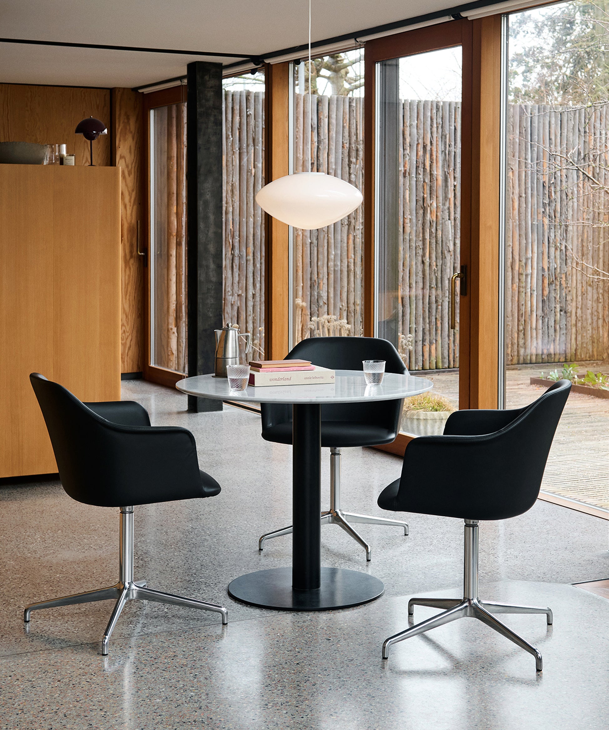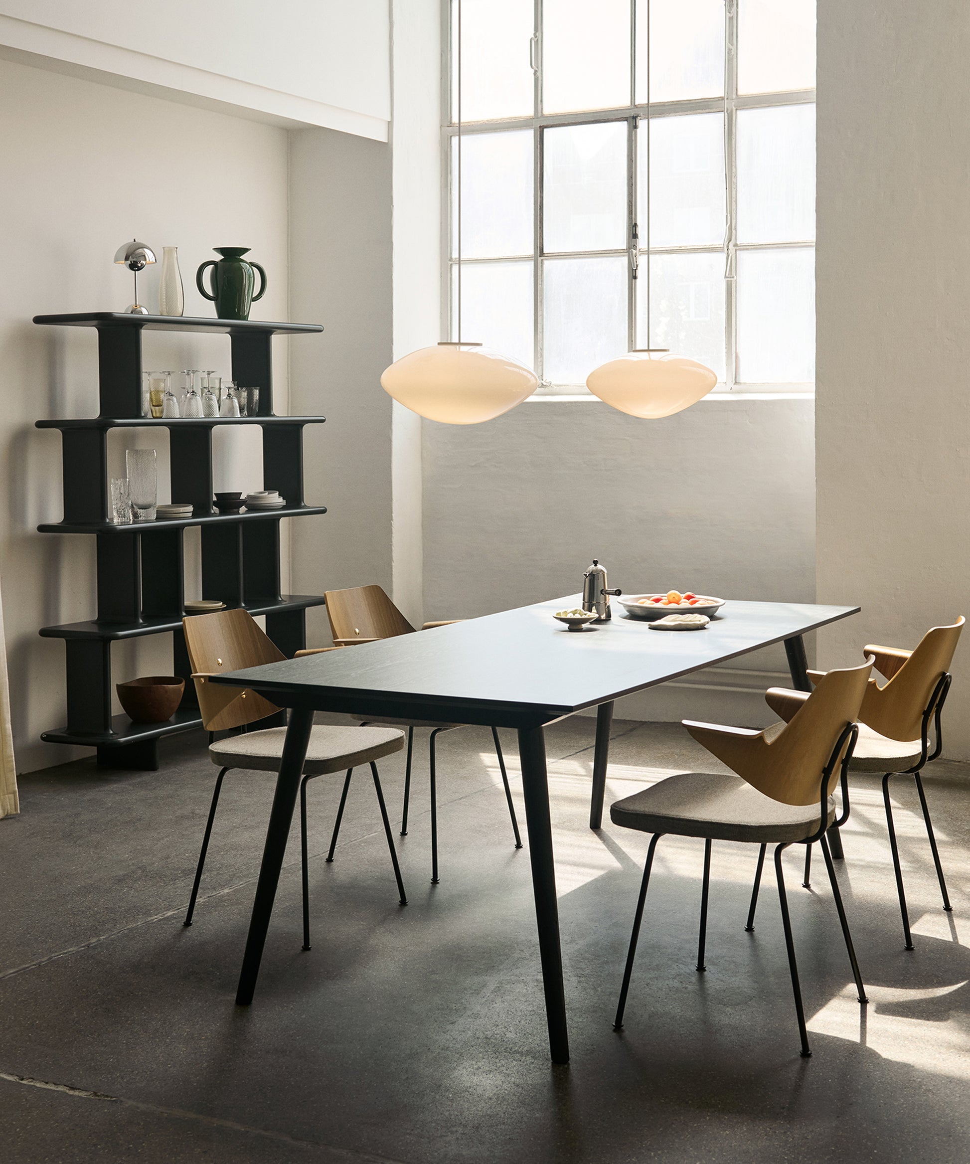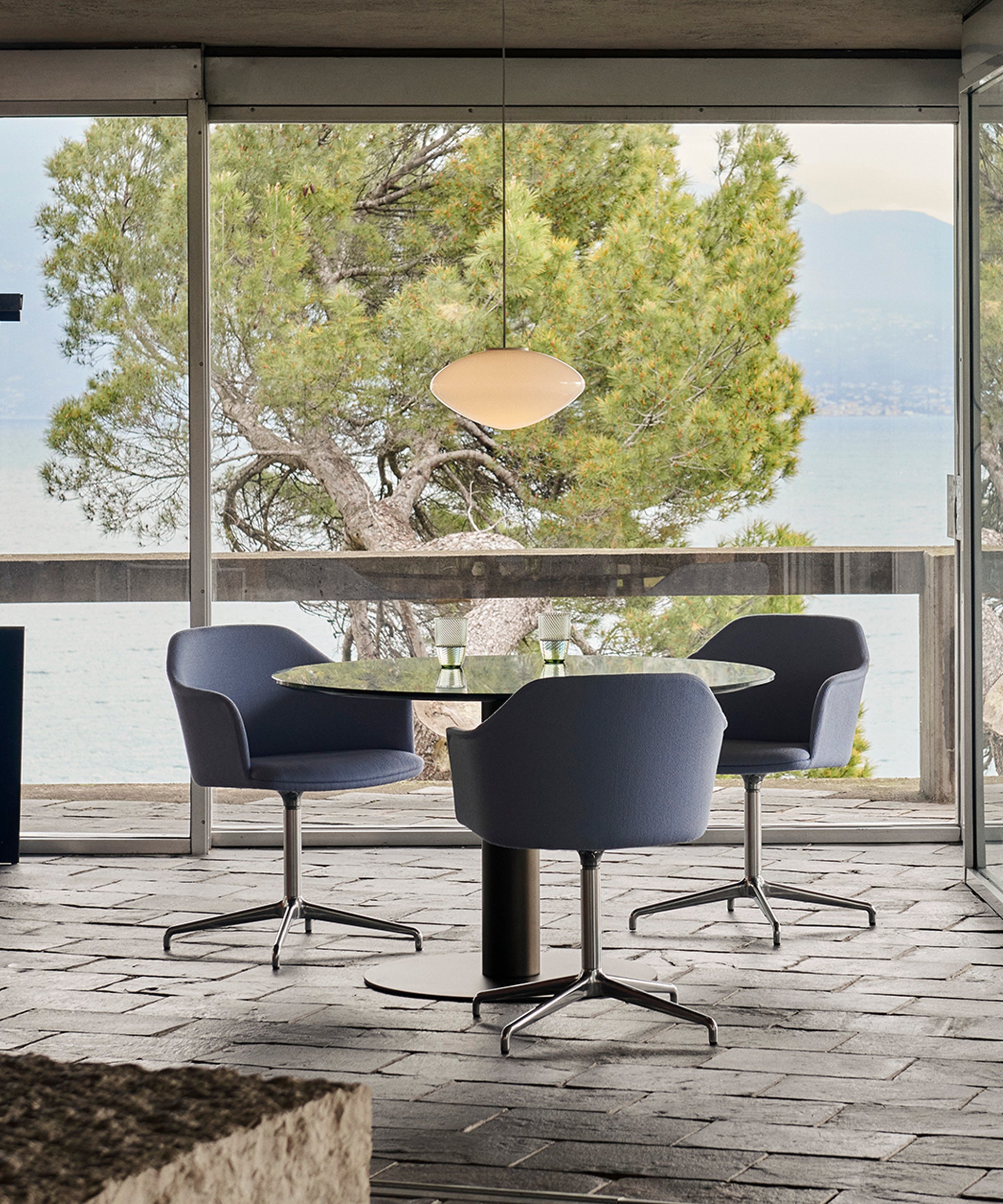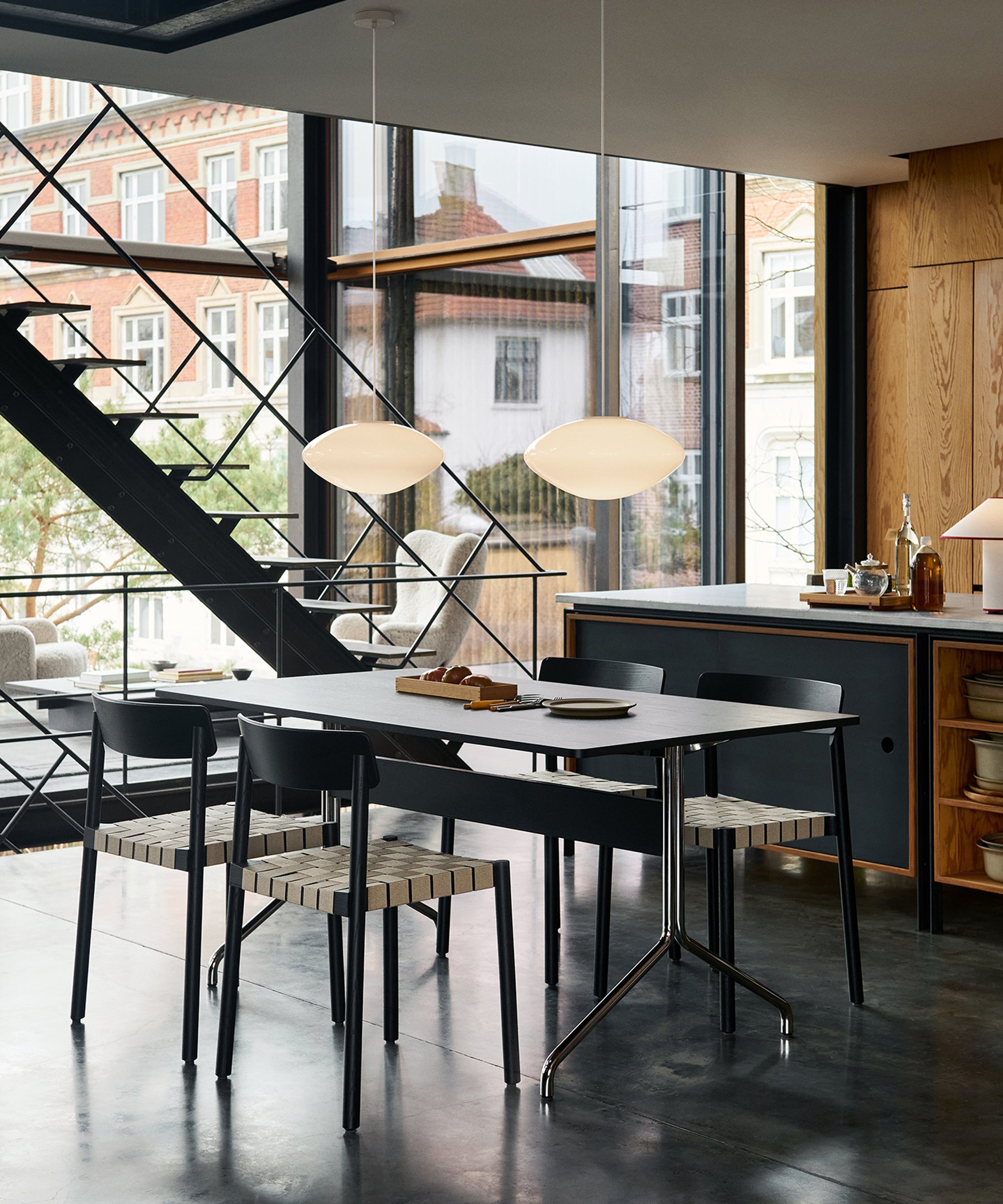Crafted from mouth-blown opal glass with white coated aluminium details and a textile cord, the Mist pendant appears to float when suspended, creating a visually striking ensemble when arranged in a cluster.