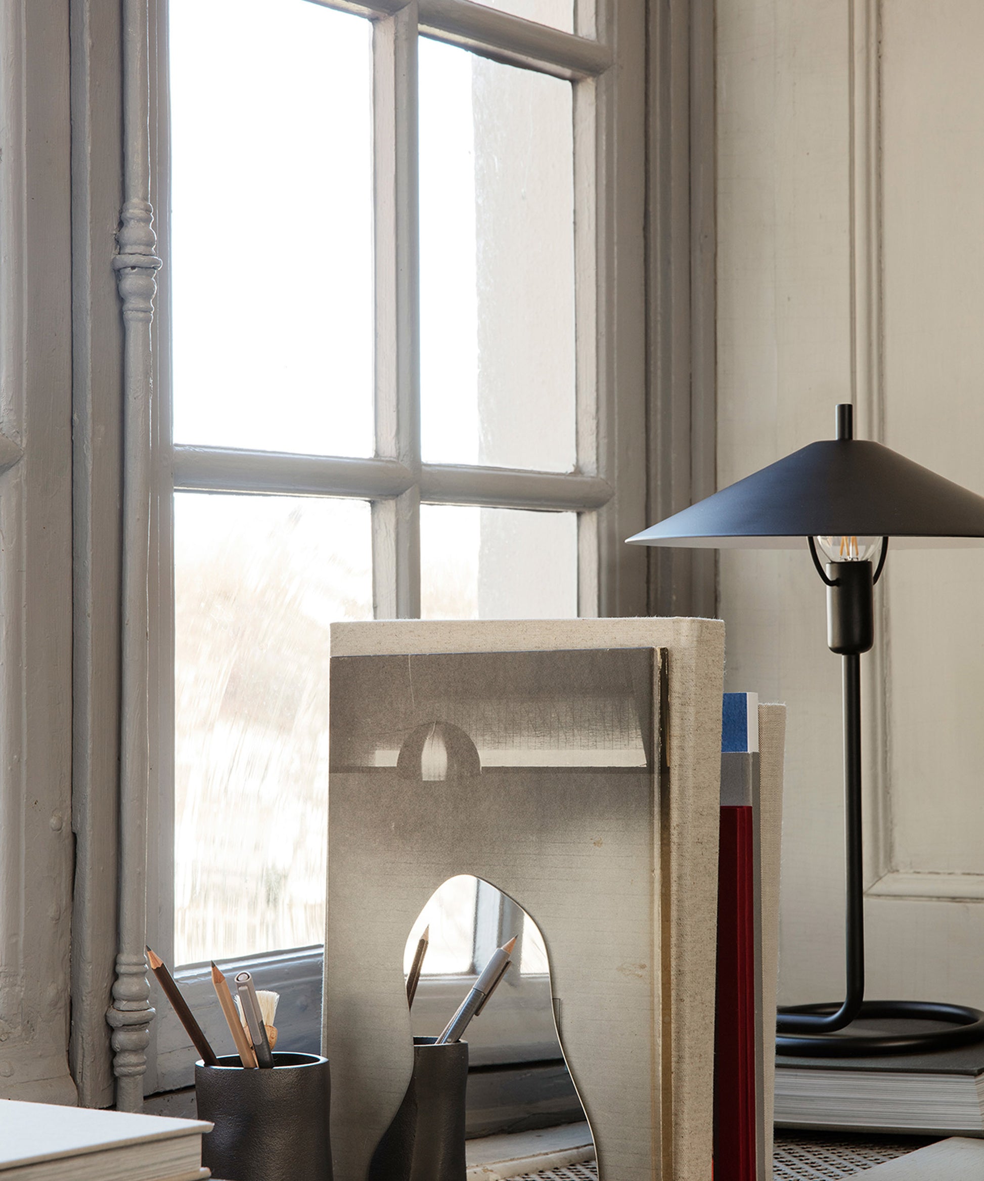 The architectural shape of the shade, combined with the white satin finish of the inside, beautifully reflects the light onto the table, making it ideal for a working situation at the desk. The Filo Table Lamp is available in various colours to make room for personality.