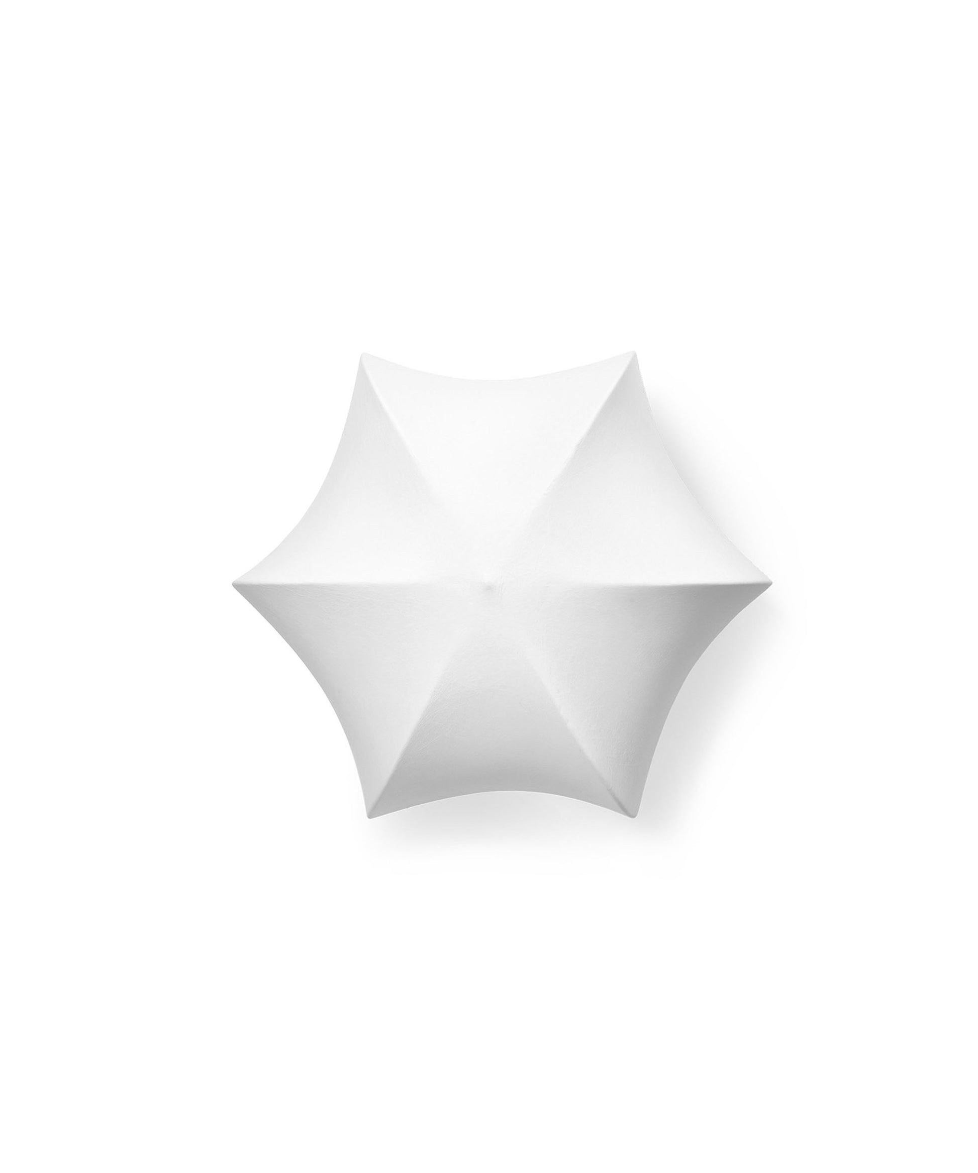 Made through an intricate process where liquid tissue is sprayed over the lamp's inner steel structure, the result is a translucent shade that artfully stretches over intricate arches, ensuring that the lamp emits a soft, diffused light while resembling a delicate flower. The non-woven polymer shade will beautifully patinate over time, giving it a unique appearance. Hang the Poem lamp on a wall or use it as a plafond-style ceiling lamp that will elevate and illuminate any space.