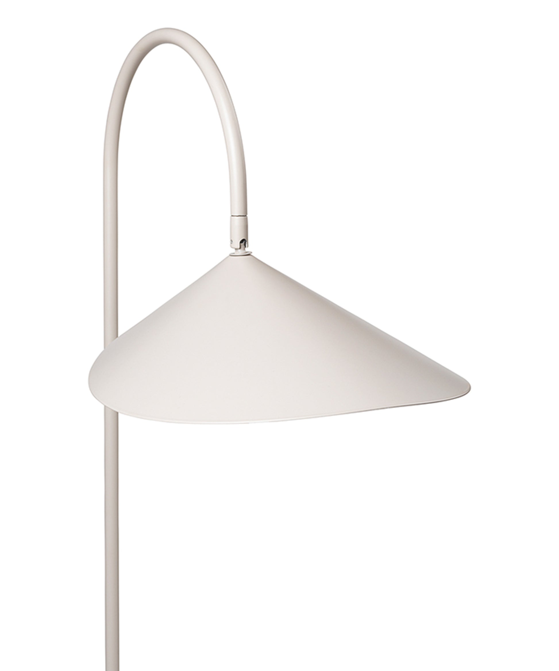 Achieving the perfect balance in the off-centre structure of the lamp, the black marble foot counterweighs the gentle way the lampshade is suspended from the curved metal arch in a leaf-like manner. With the matte, off-white inside of the shade, the lamp provides a soft, evenly distributed light, and the lampshade can be adjusted to ensure optimal light conditions in all situations.