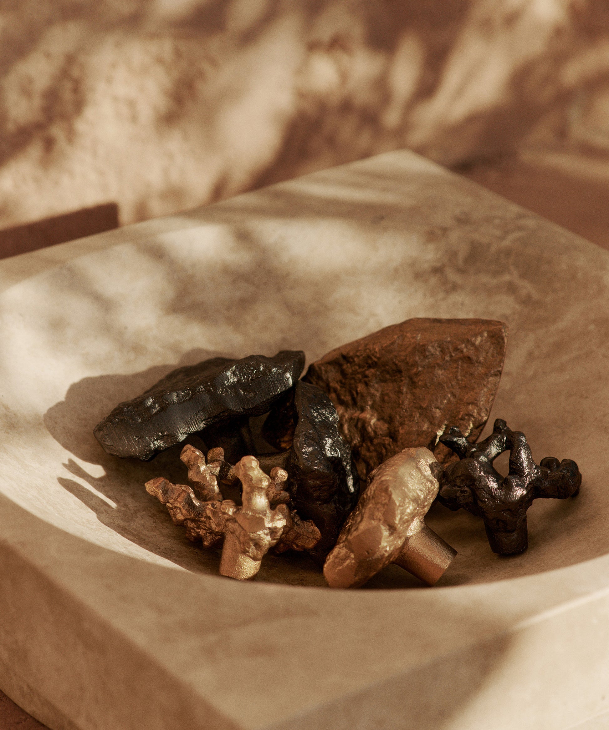 Moulded from a handpicked stone discovered on the island, it captures the raw, organic textures and irregular forms characteristic of the region. Crafted from blackened recycled aluminium, this design serves as both a decorative and utilitarian feature, seamlessly integrating into entryways, bathrooms, or living spaces.