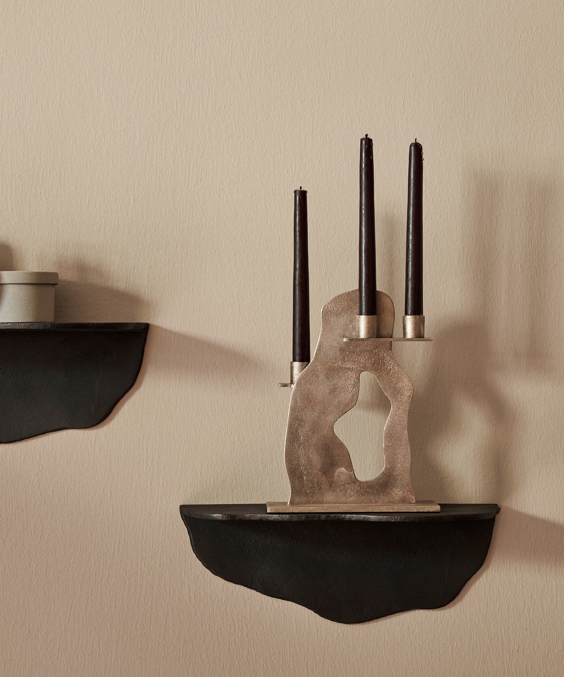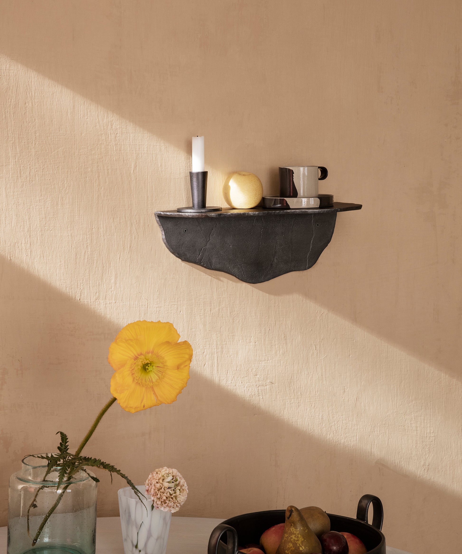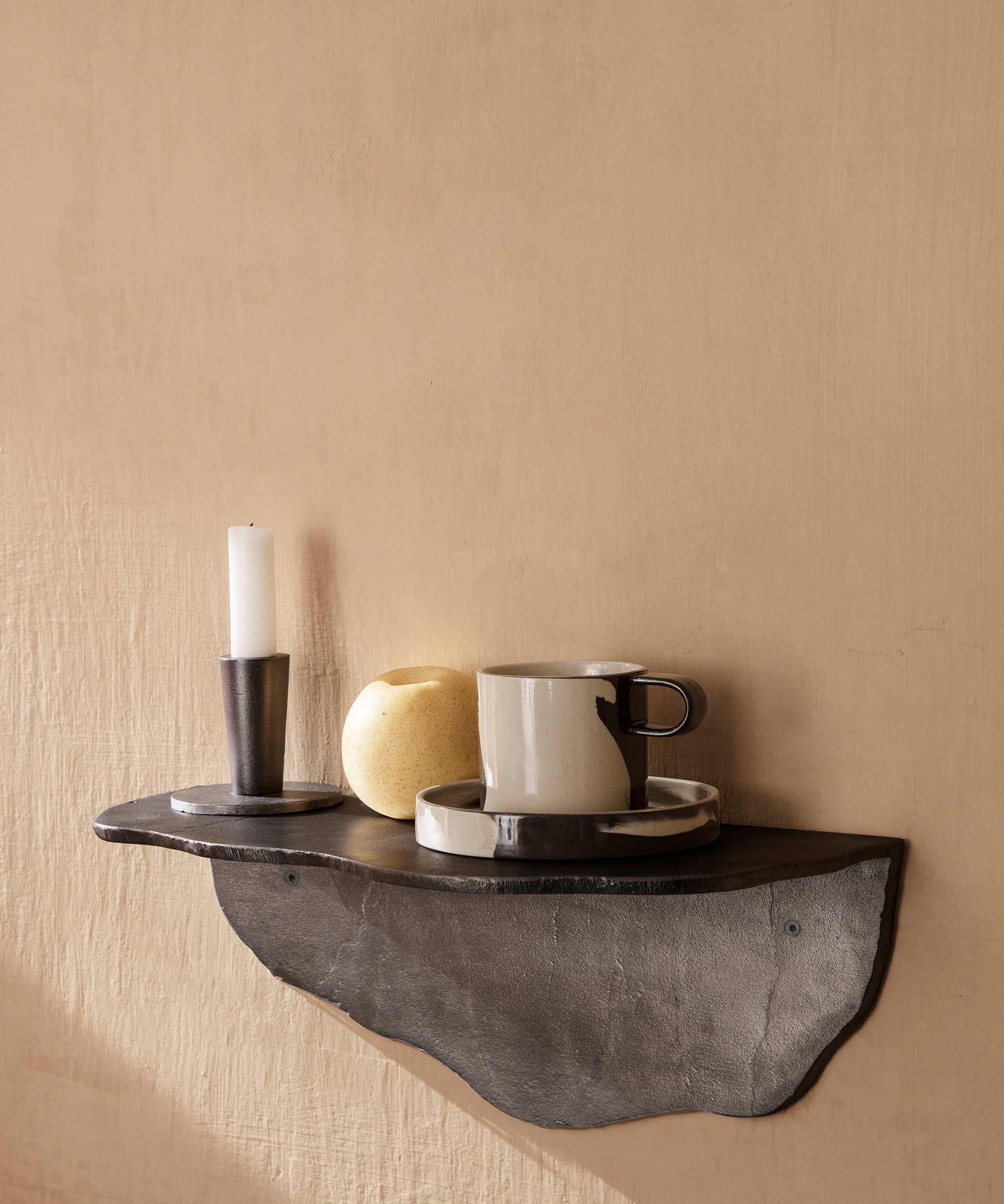 Made from 100% recycled aluminum, this casted, decorative and functional shelf embraces the rough and jagged look of the material, with the casted metal finish mirroring the appearance and texture of fractured natural stone.