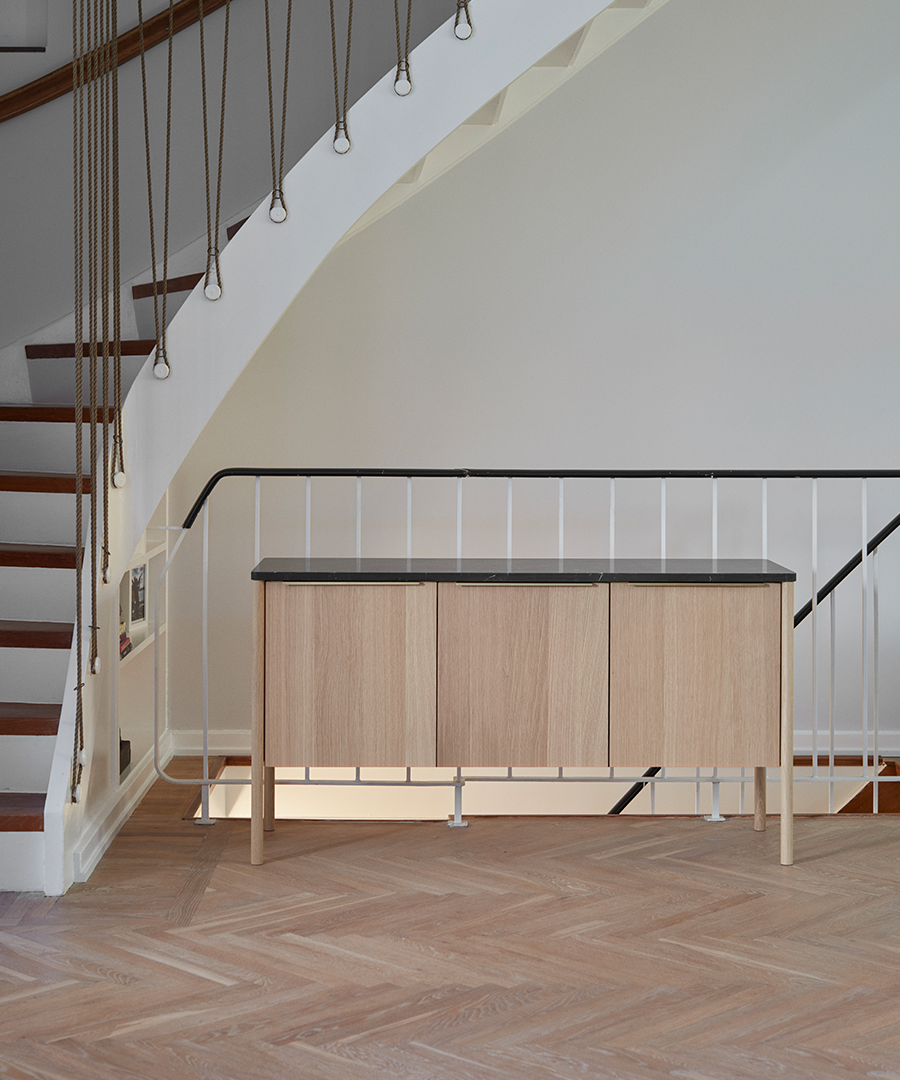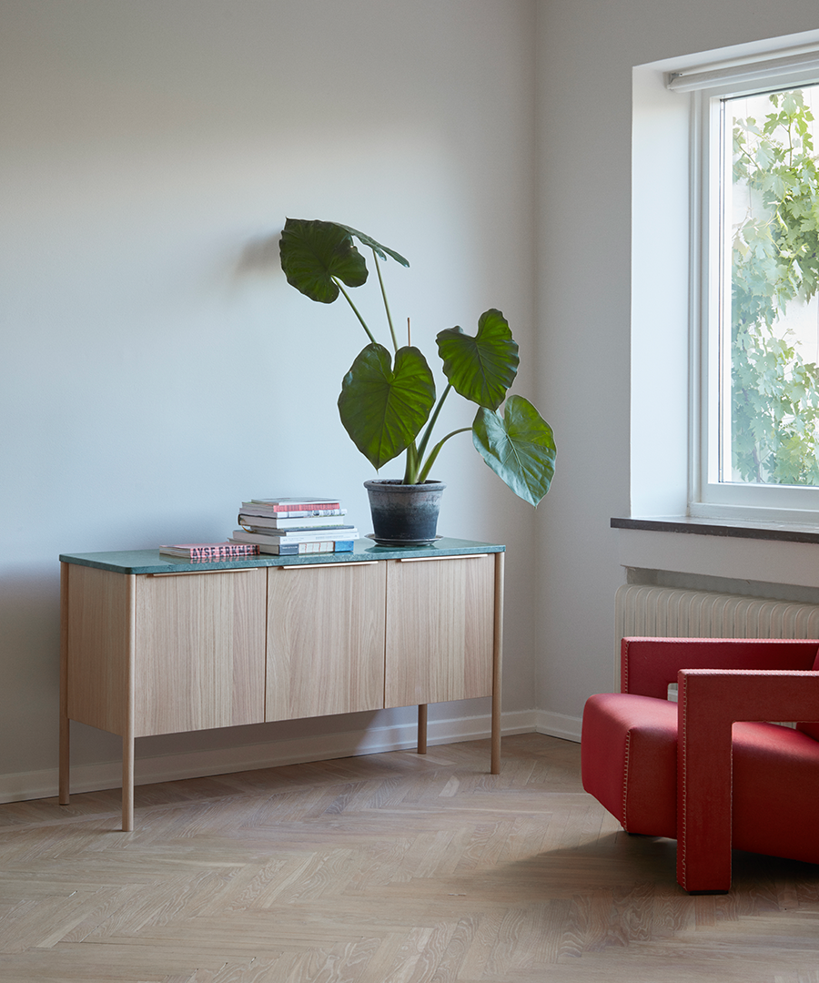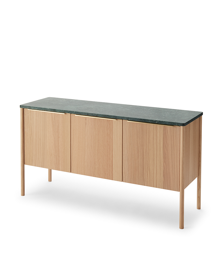 The beauty of the Jut Cabinet lies in its simplicity. Its offset legs and bottom-flush doors highlight the natural elegance of the wood, while the brass handles offer a nod to the modern sensibilities of the designer. Its slim footprint makes it perfect as either a living room centerpiece or hallway console. Features include three inset doors and two adjustable shelves in the middle and right cabinets. Cabinet top available in Oak, Black Marble, or Green Marble.