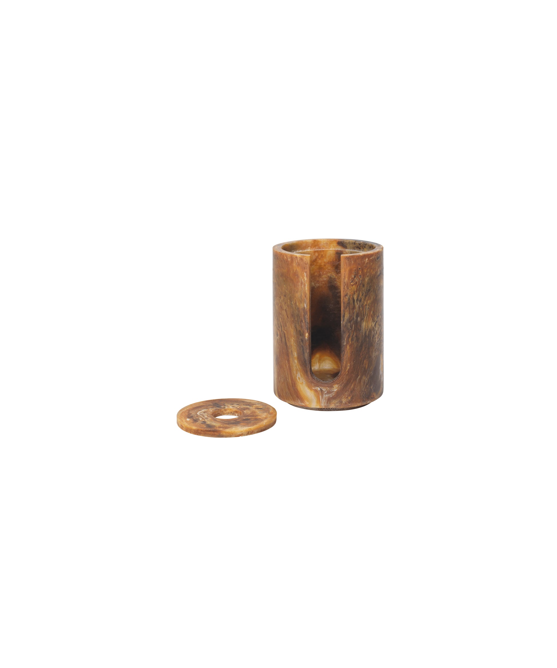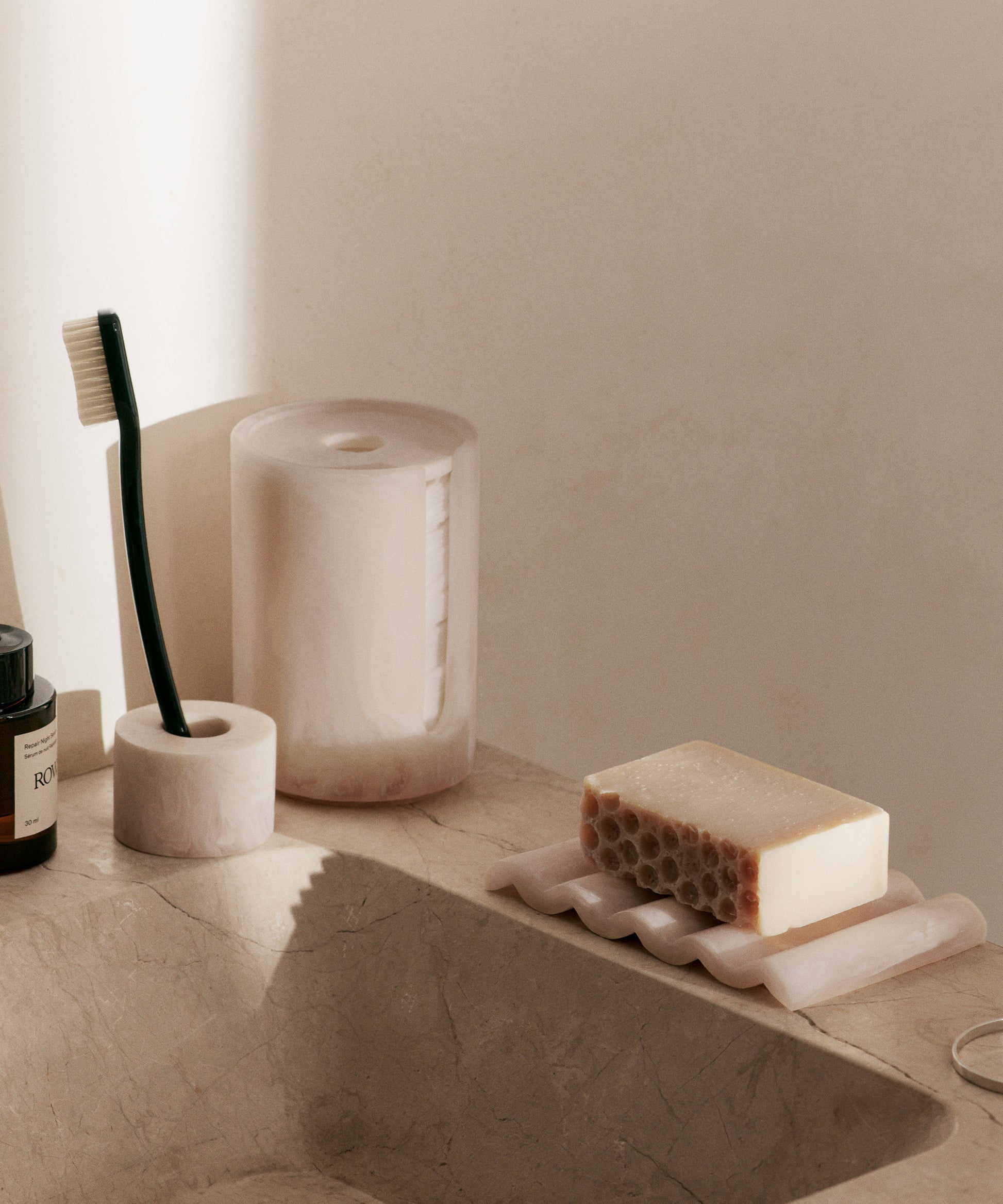 The Mist Cotton Pad Holder is a round storage solution designed to hold cotton pads. Crafted from marbled resin, it combines lasting durability with an airy, refined appeal.
