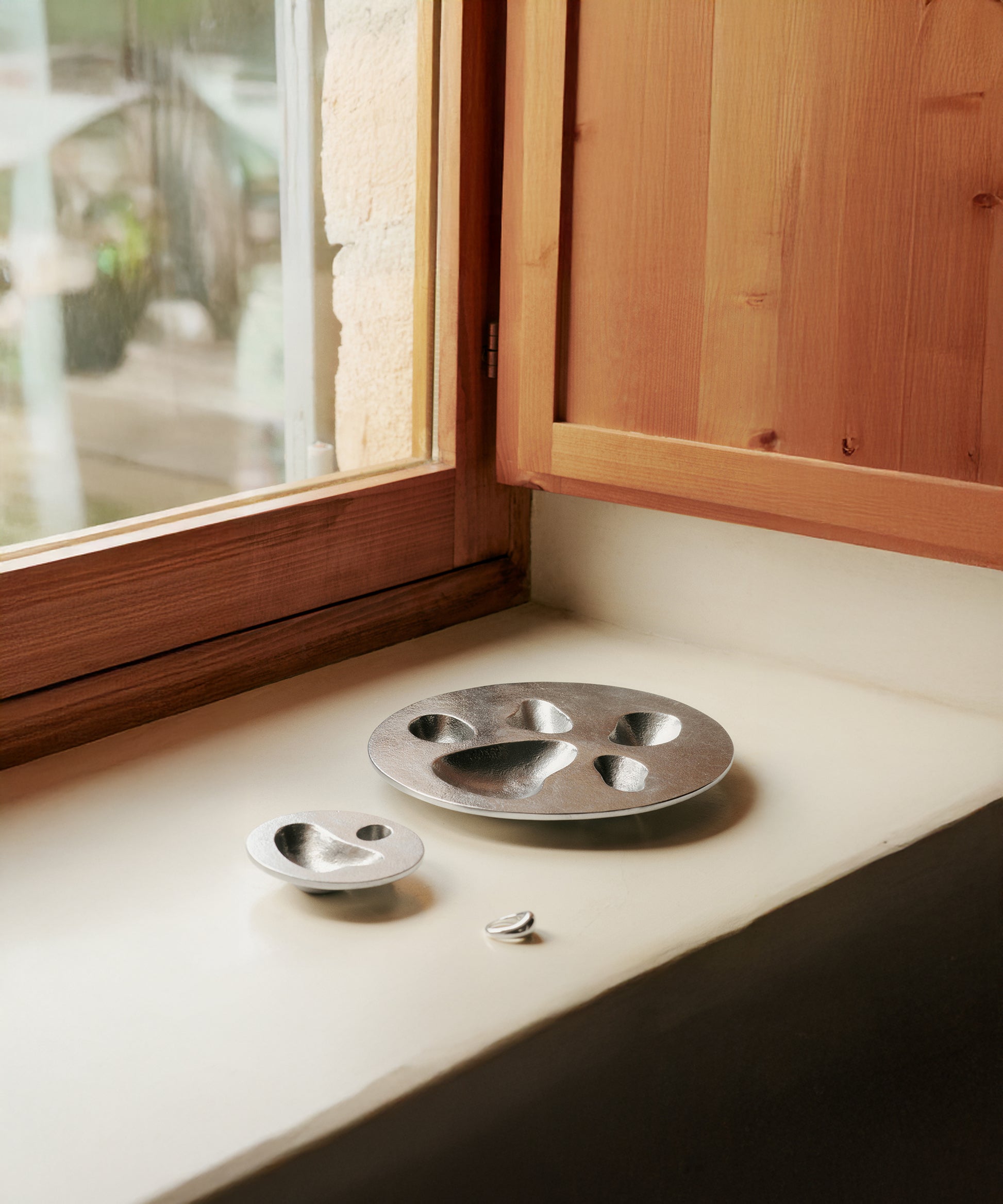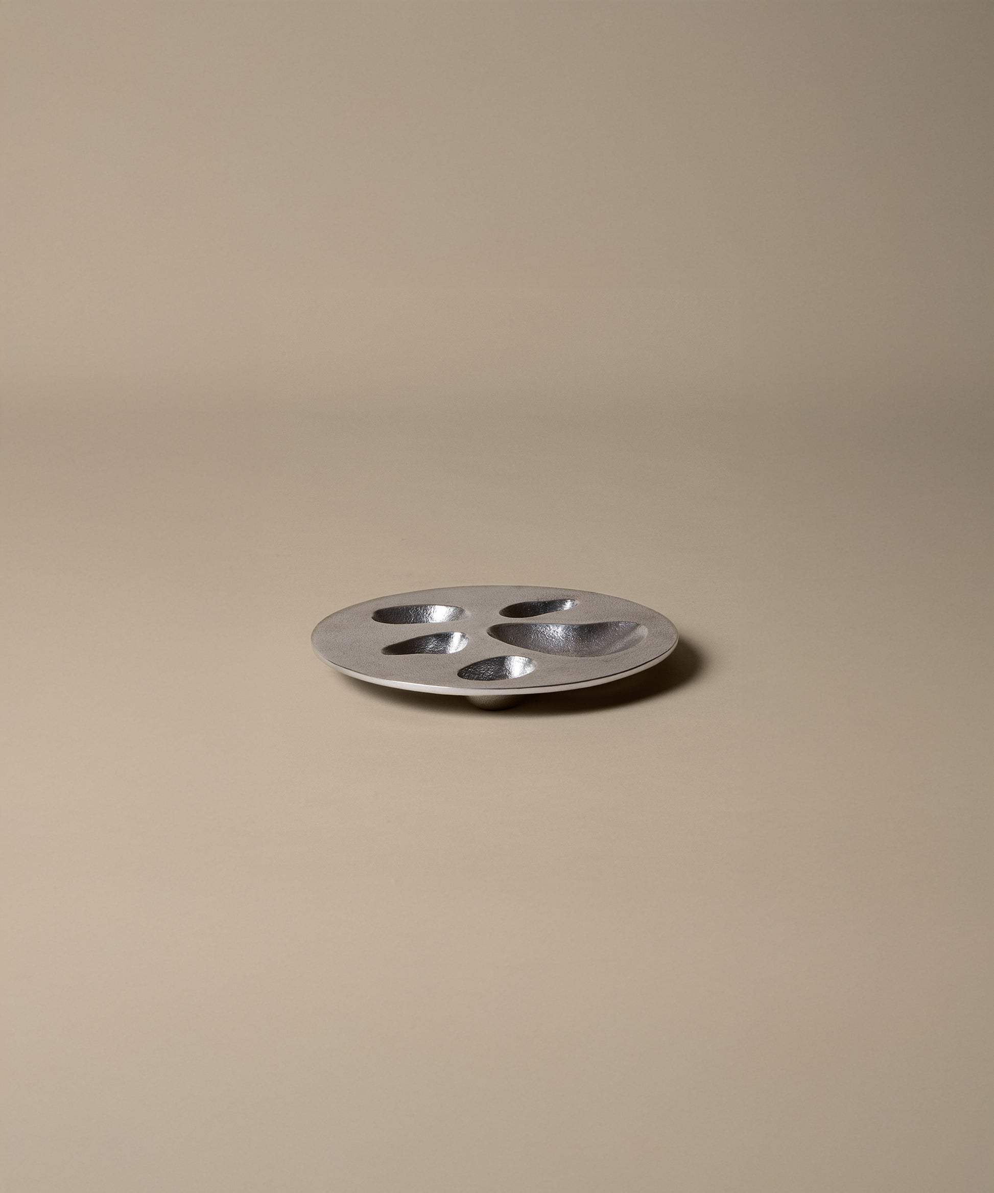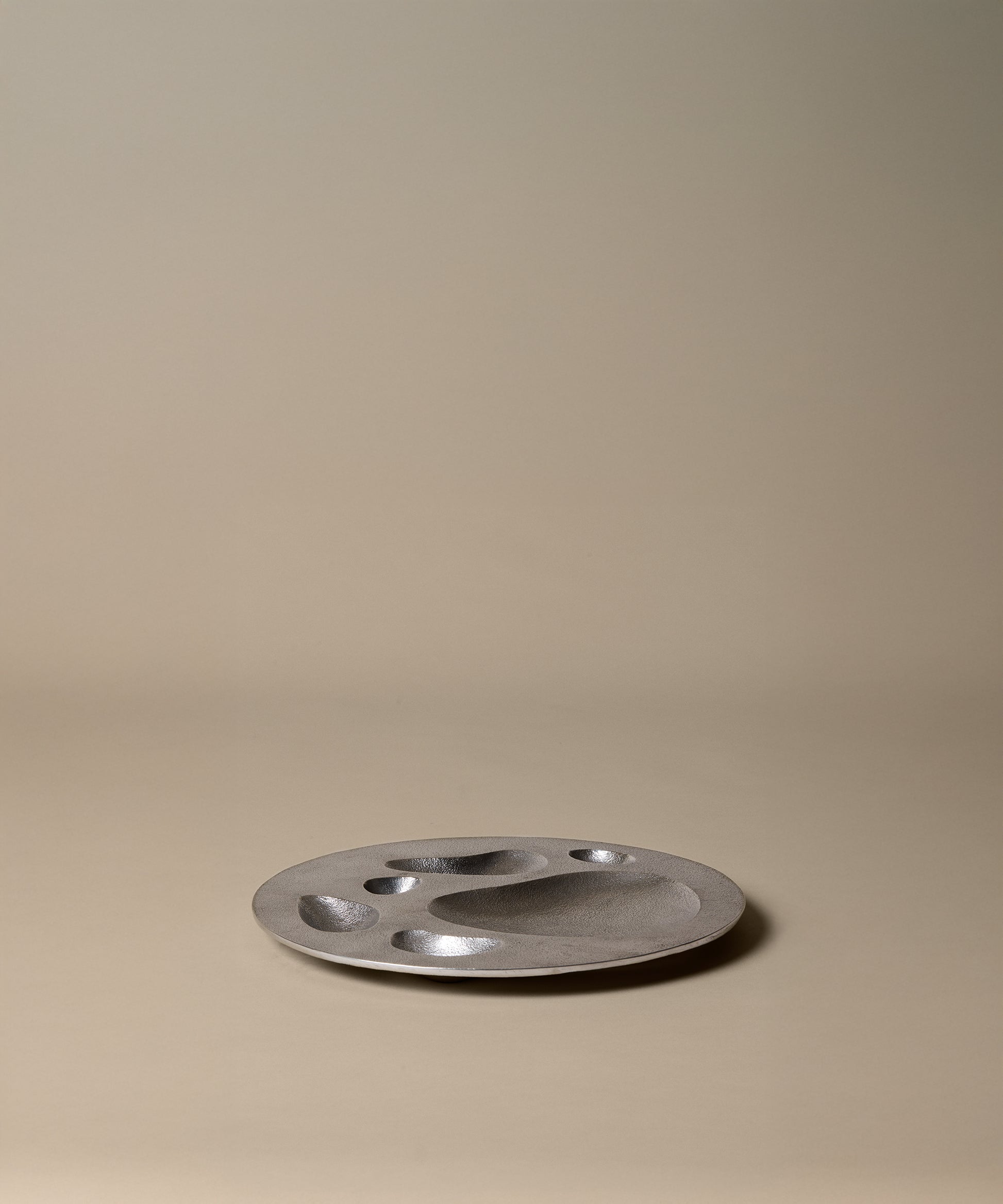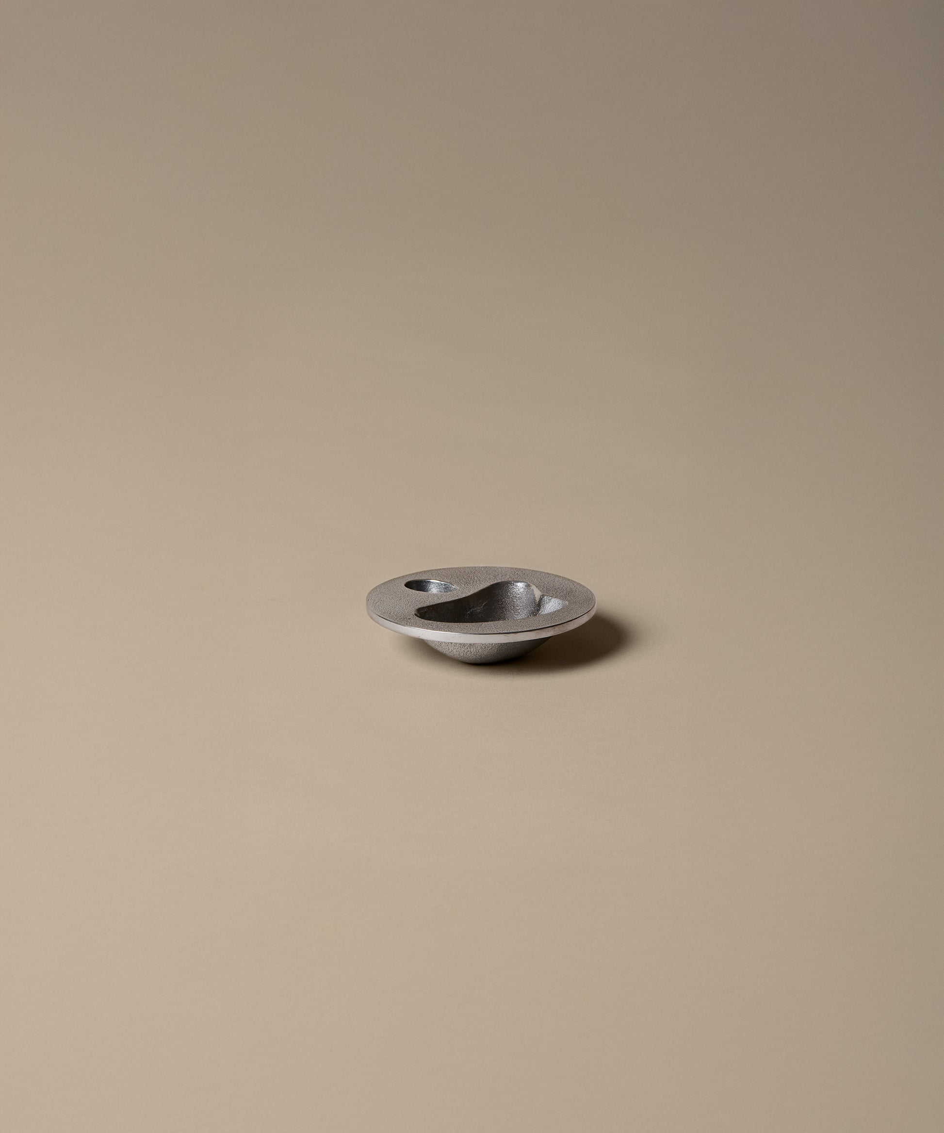 Crafted from recycled aluminium with a textured sand-cast finish, it features organically carved holes and small niches, adding depth and visual intrigue. These design elements invite creative use, making it perfect for displaying decorative items and storing nicknacks. Its unique design ensures it stands out as both a practical accessory and a statement piece in any space.