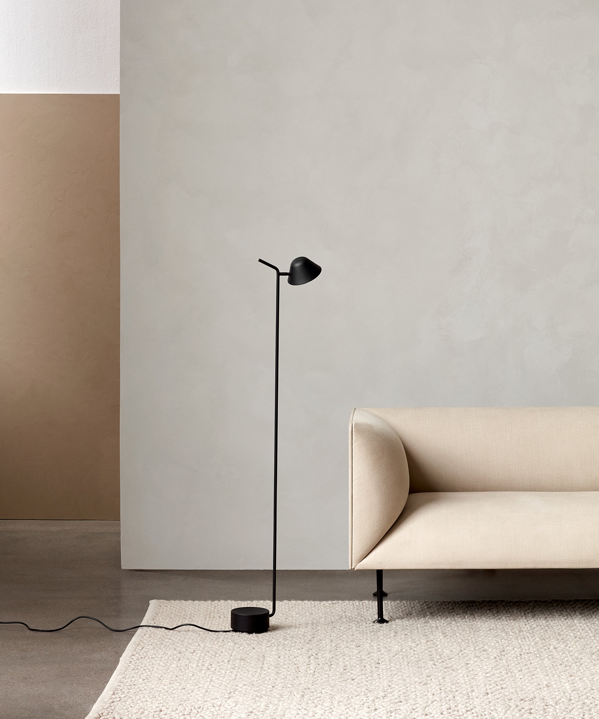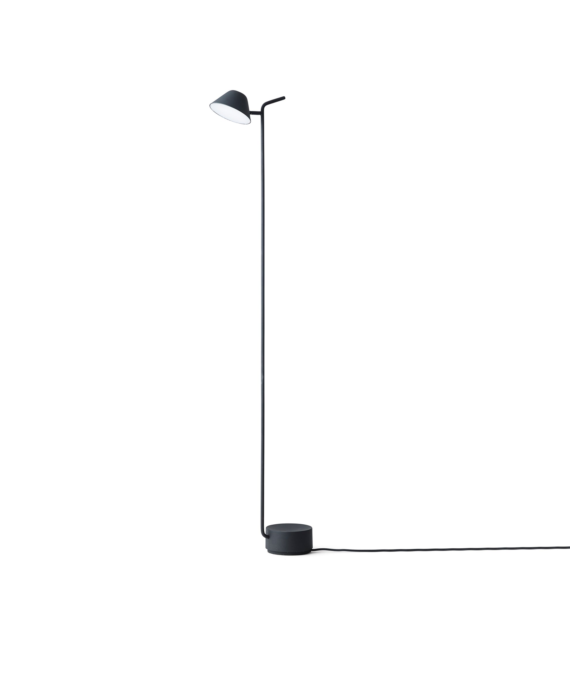 The shape and silhouette of the Peek floor lamp were the basis for the smaller Peek table lamp. Use the floor lamp as a reading light by the sofa or as ambient room lighting. The top end of the stem has a touch-sensitive dot that functions as a dimmer.