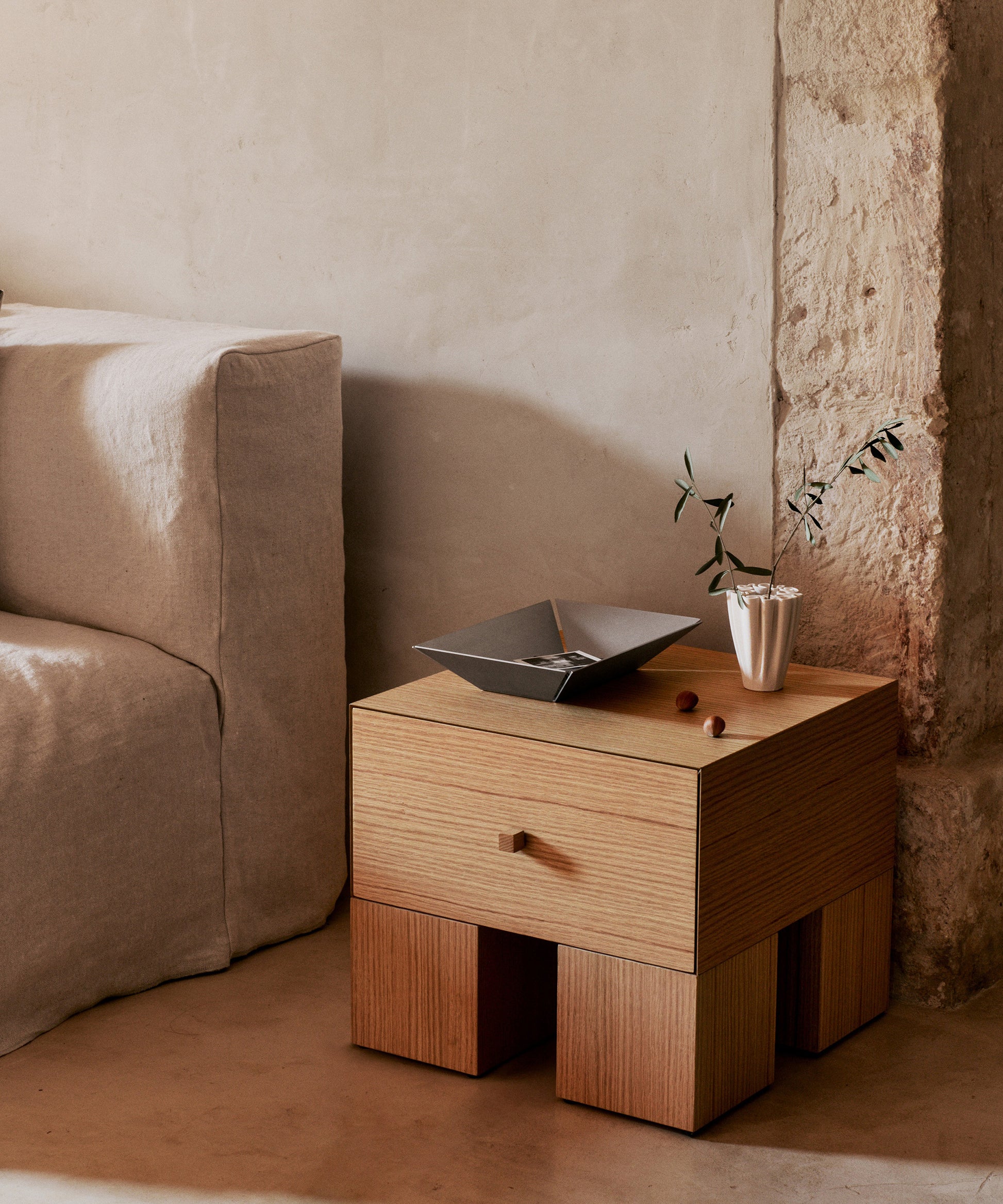 Its edges are deliberately cut or gapped, adding a unique and intentional design element. A versatile piece for organising various household items, its clean, geometric lines bring a touch of contemporary elegance to any space.