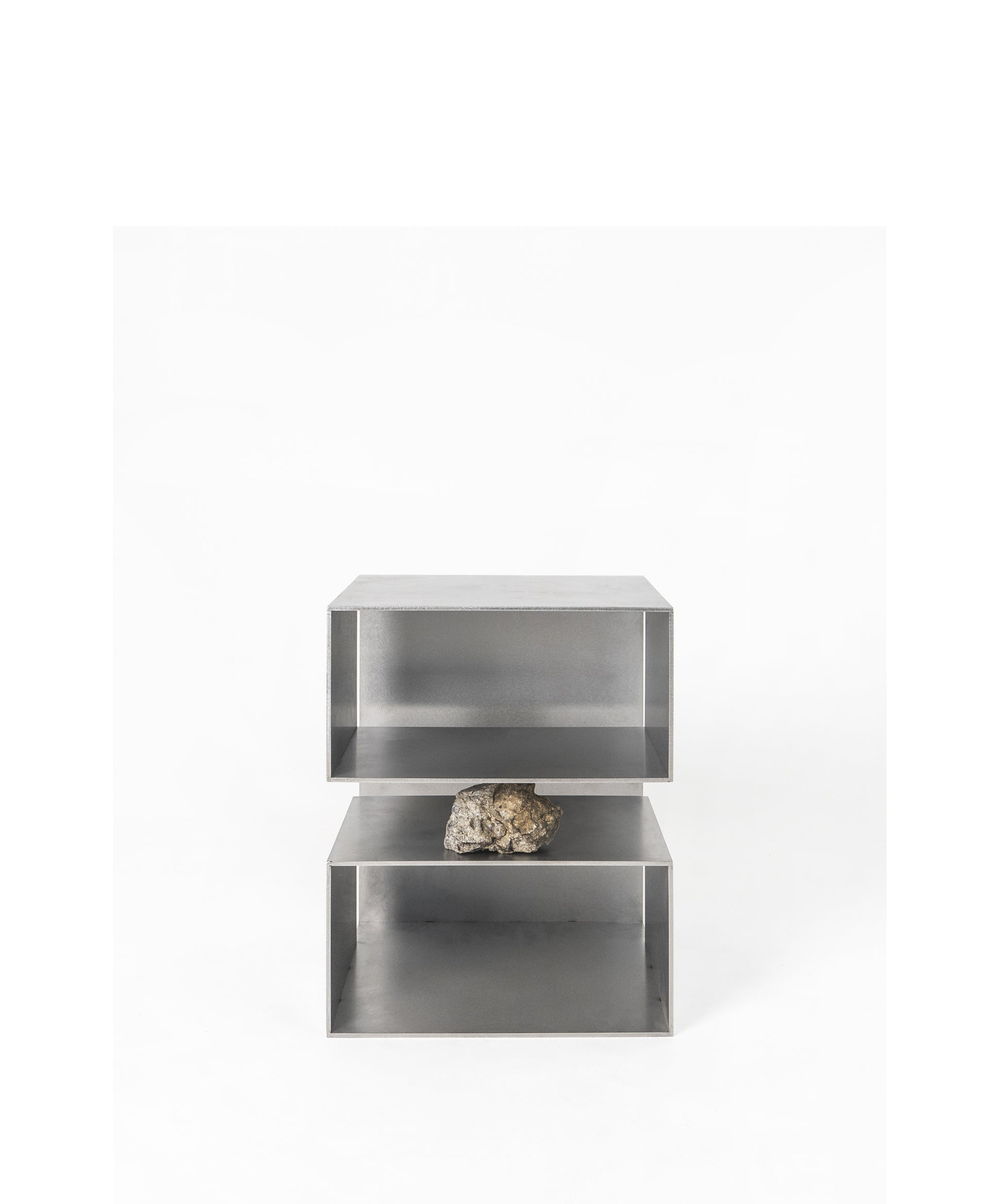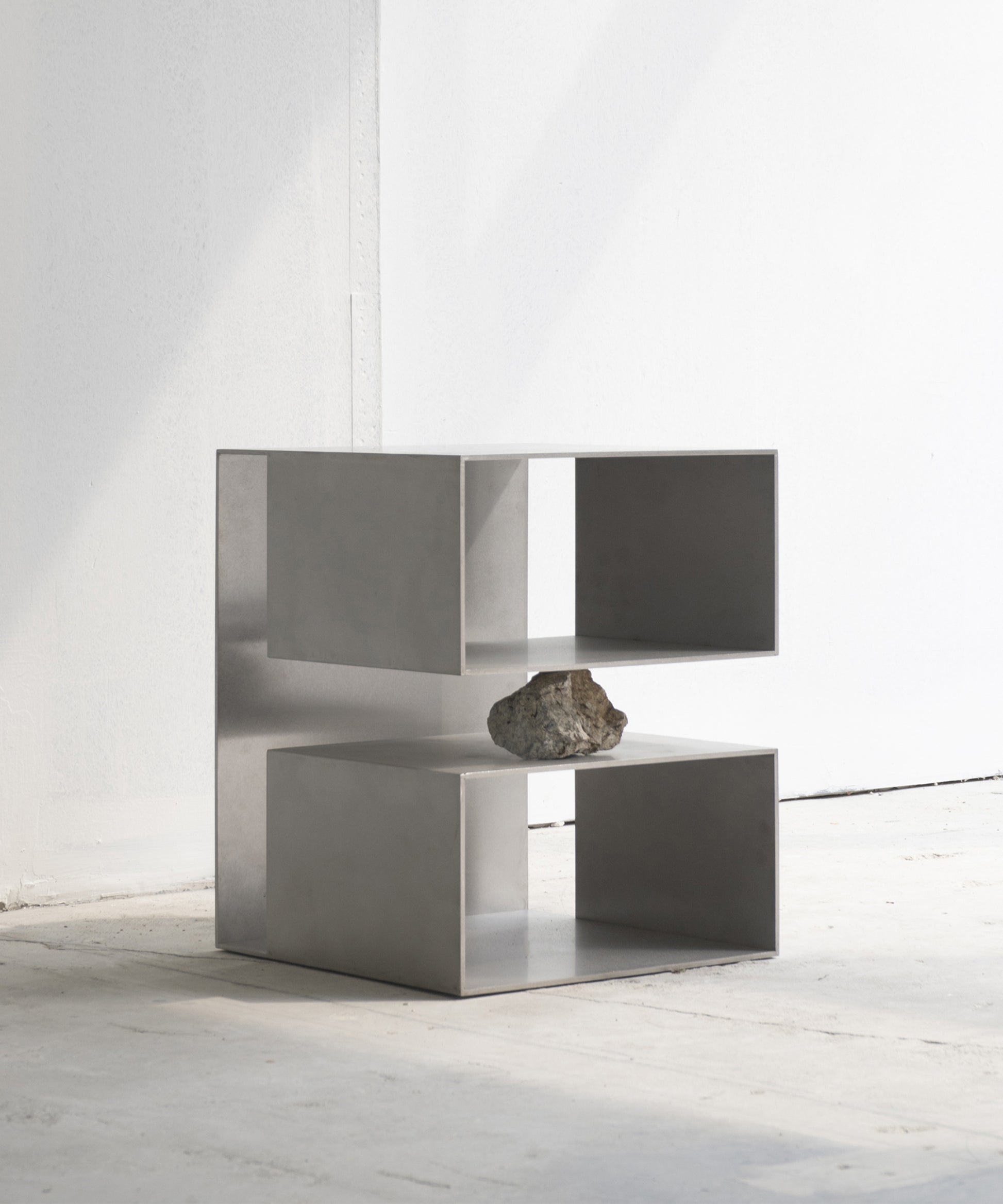 Consisting of functional pieces including tables, chairs, and shelving, ÔProportions of StoneÕ combines primitive, natural forms of stone with industrial and futuristic structures of steel. The strong, geometric steel against the organic stone reveals an arresting juxtaposition of elements, simultaneously highlighting and questioning materiality. For Lee, the stone is the starting point for each piece and this is evident throughoutÑthe steel appears to have formed around the organic object, mimicking the natural construction of its counterpart.