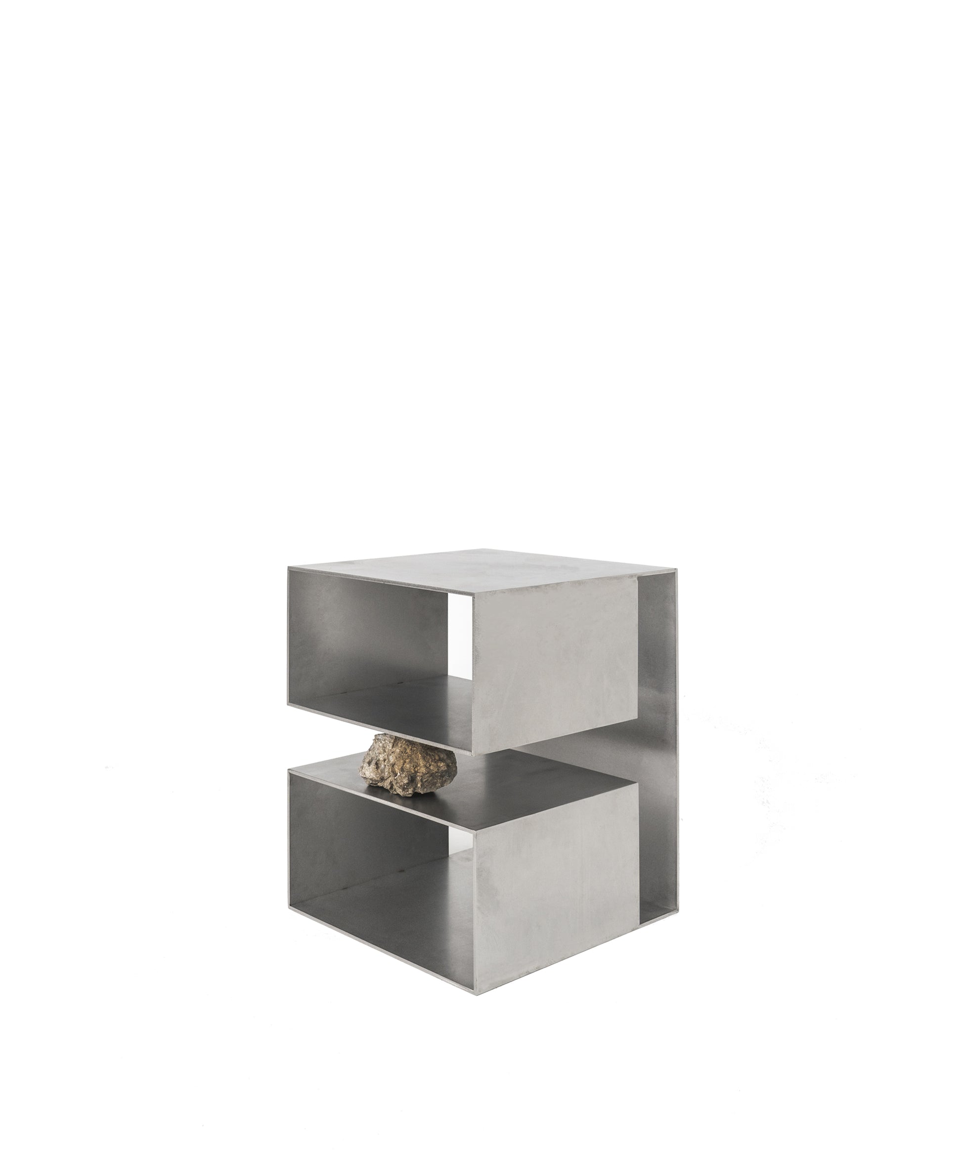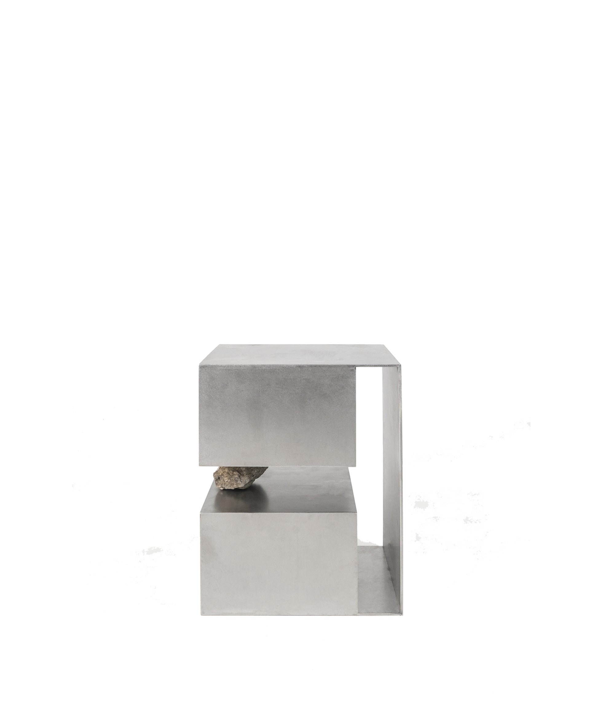 Stone and steel both symbolize strength and structure however the process of their making is very different. Steel, forged by heat and human intervention, is often sleek and precise in its finished state. Stone however, could be regarded as the epitome of natural forms; it is carved by the elements over thousands of years. Bringing together these natural and artificial elements could easily appear incongruous but in LeeÕs work it is harmonious, with both elements appearing to strengthen one another. This unexpected balance also contributes to the structural integrity of the piecesÑthe stones provide weighted support, ensuring they stay grounded. This contrasting of elements is brought together through shared functionality: with each piece, Lee highlights a distinct visual tension whilst emphasizing a delicate coexistence.