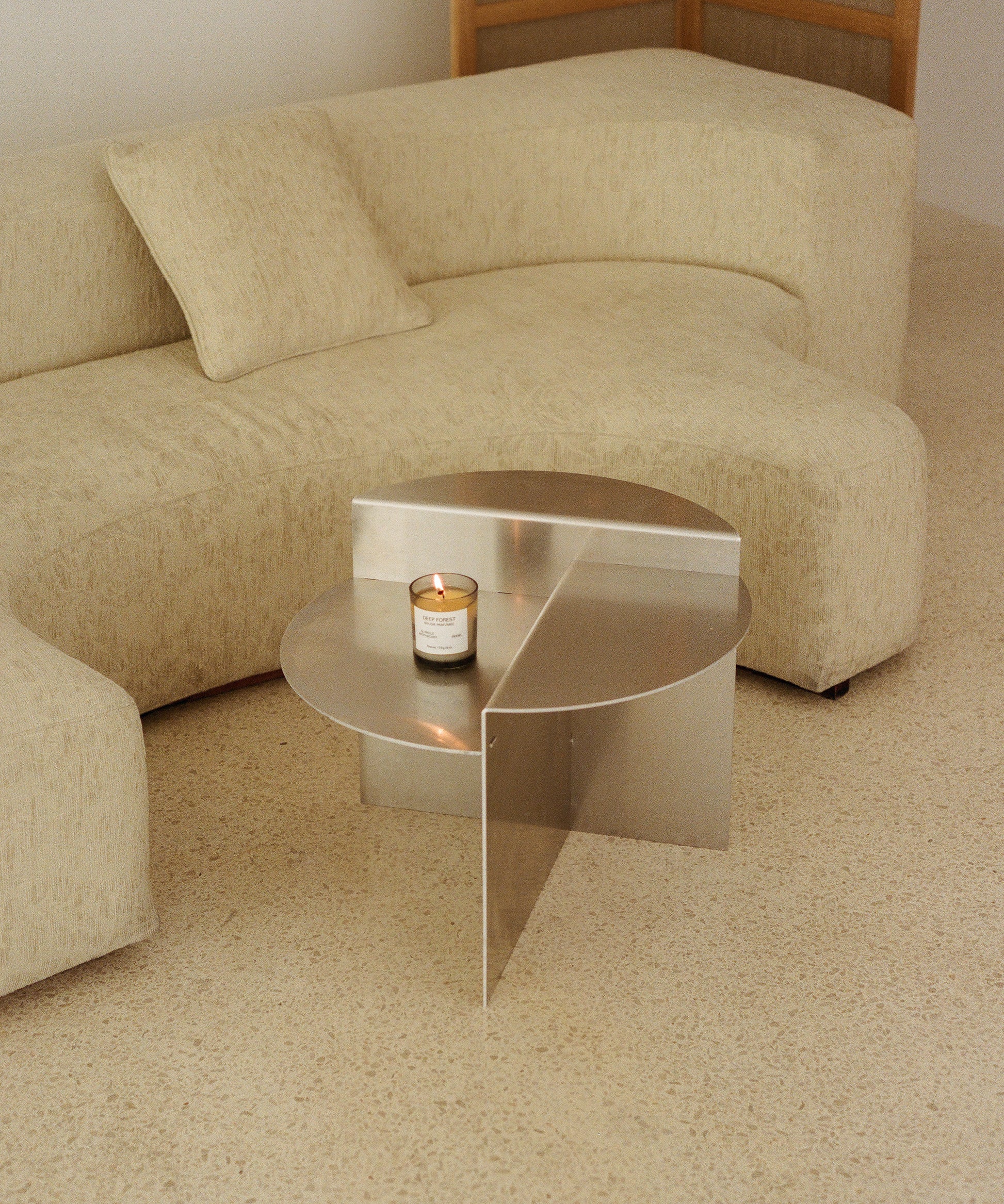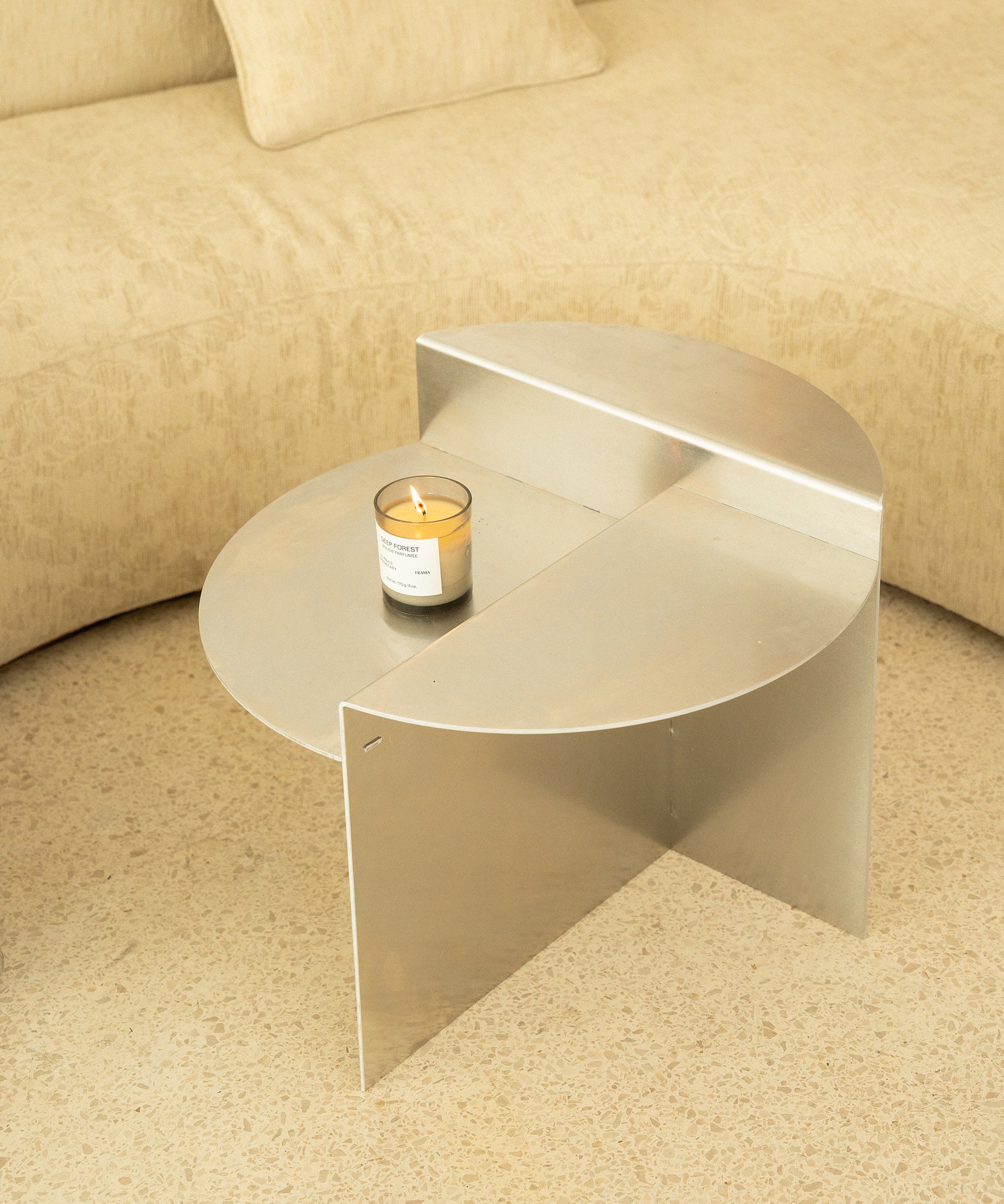 The Rivet Side Table is a versatile furniture piece suitable for any room. Its circular top is divided into three different levels, creating a dynamic surface.