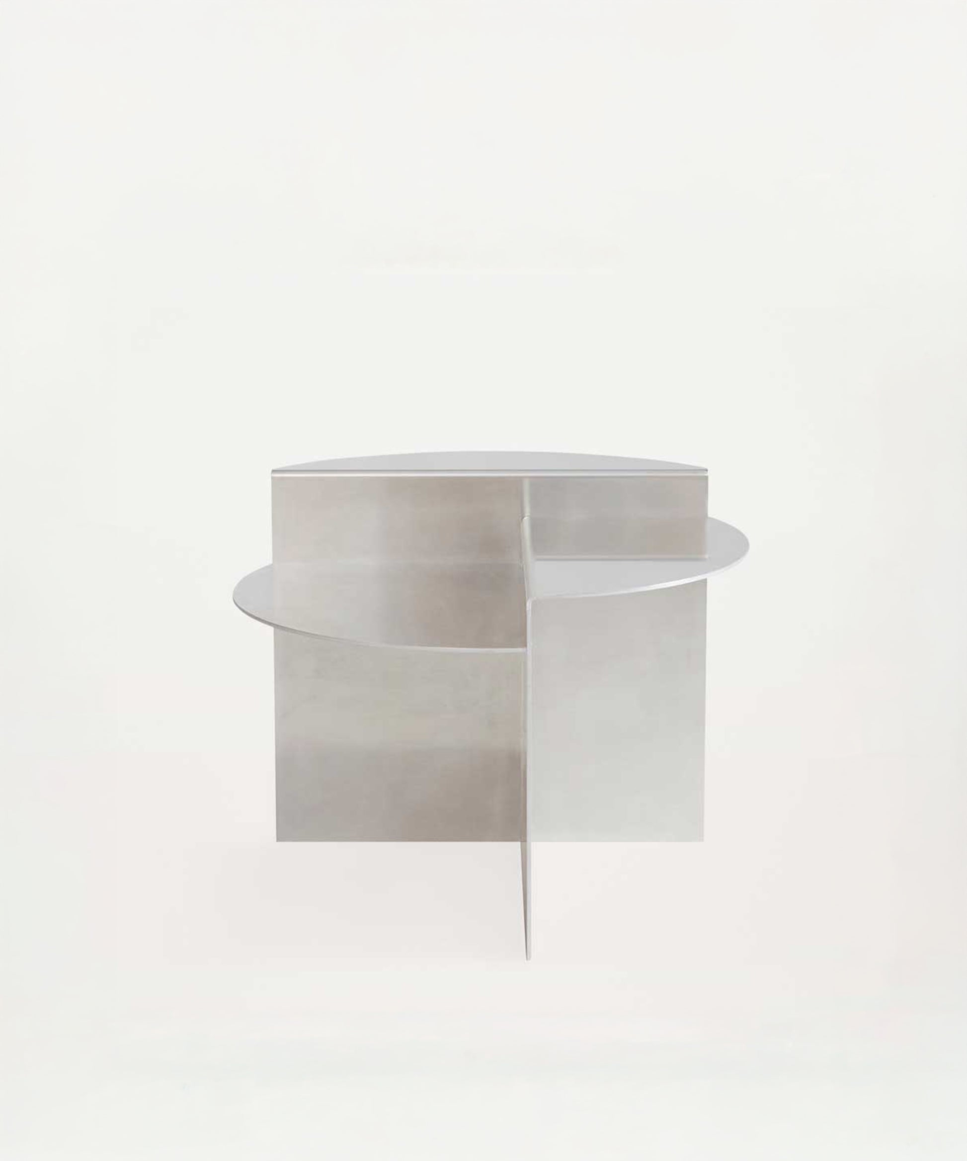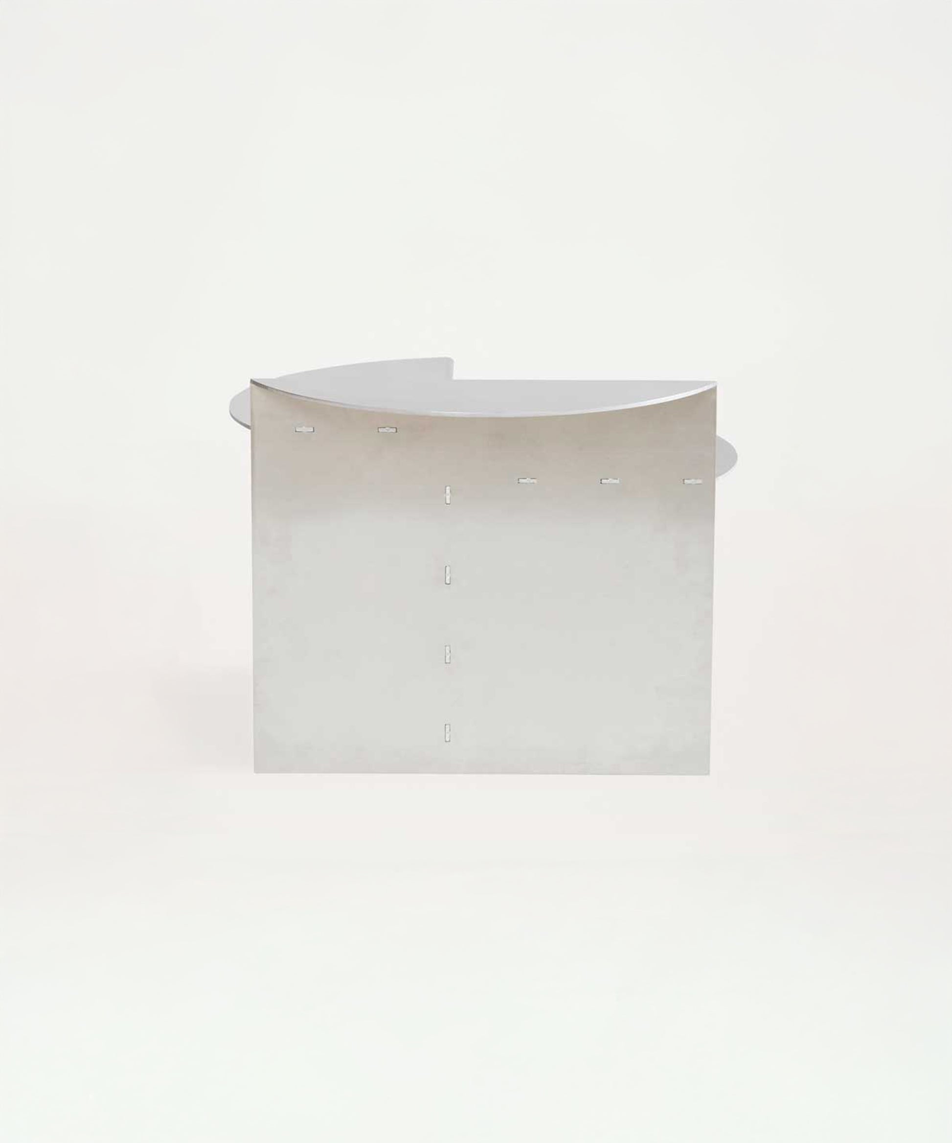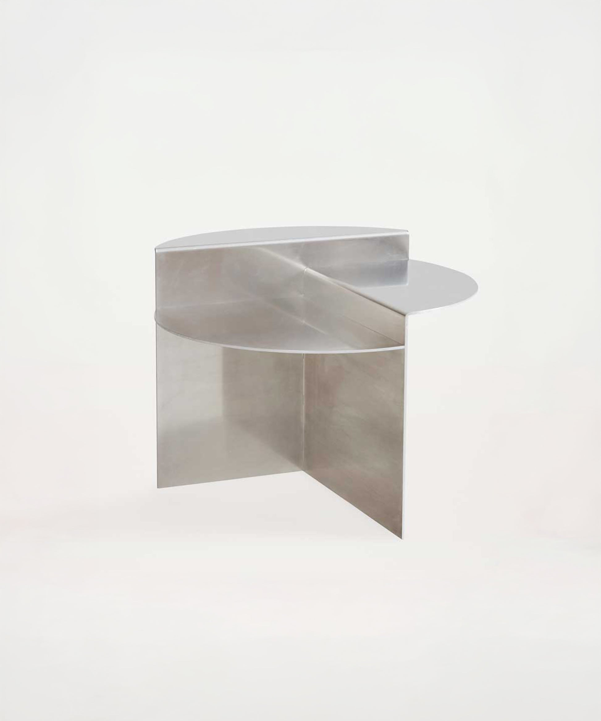 Based on a riveting technique suitable for making perpendicular joints between separate, laser-cut raw aluminum sheets, the table is put together by hand using a hammer in a cold-forming assembly process developed by designer Jonas Trampedach in 2011.