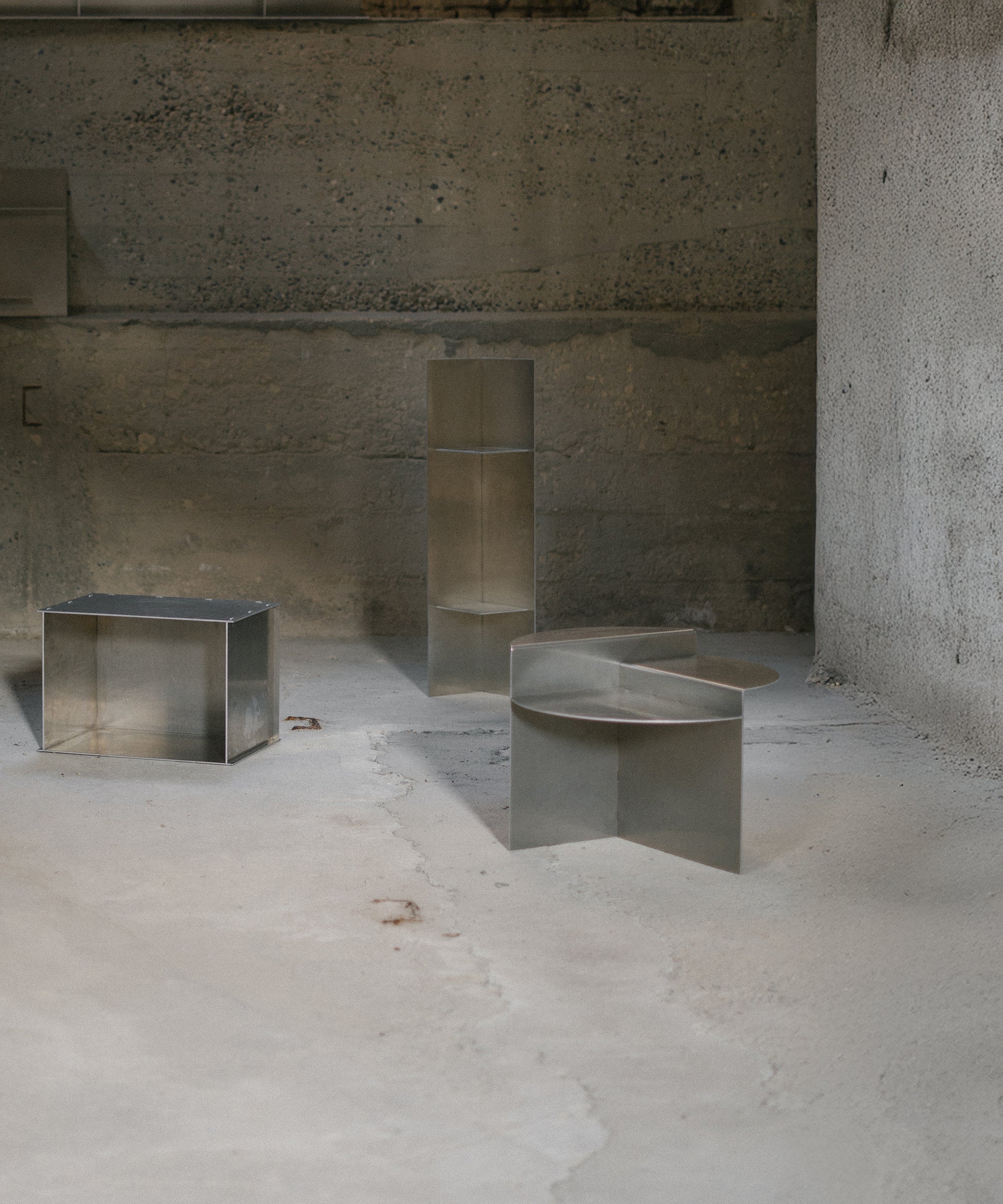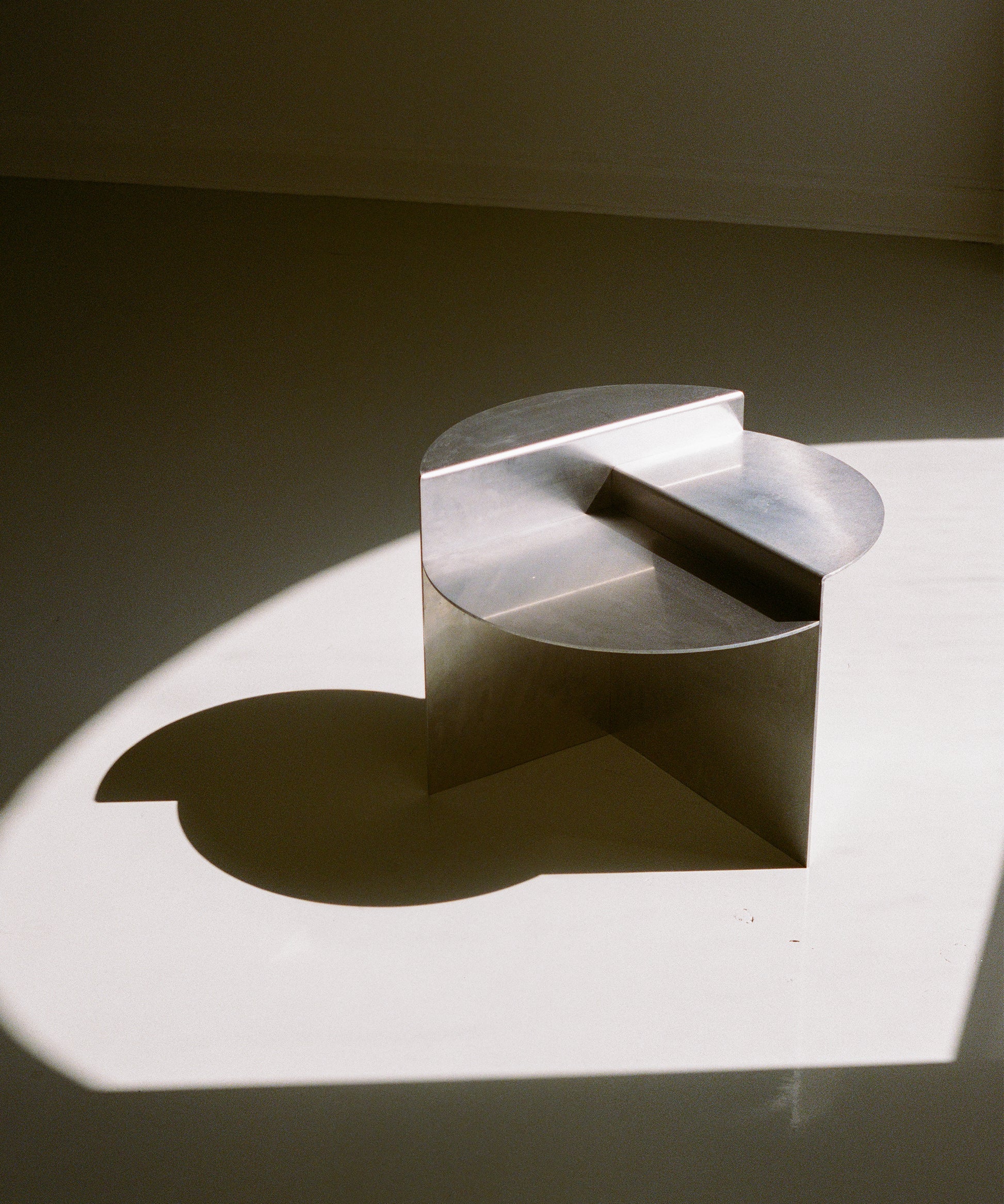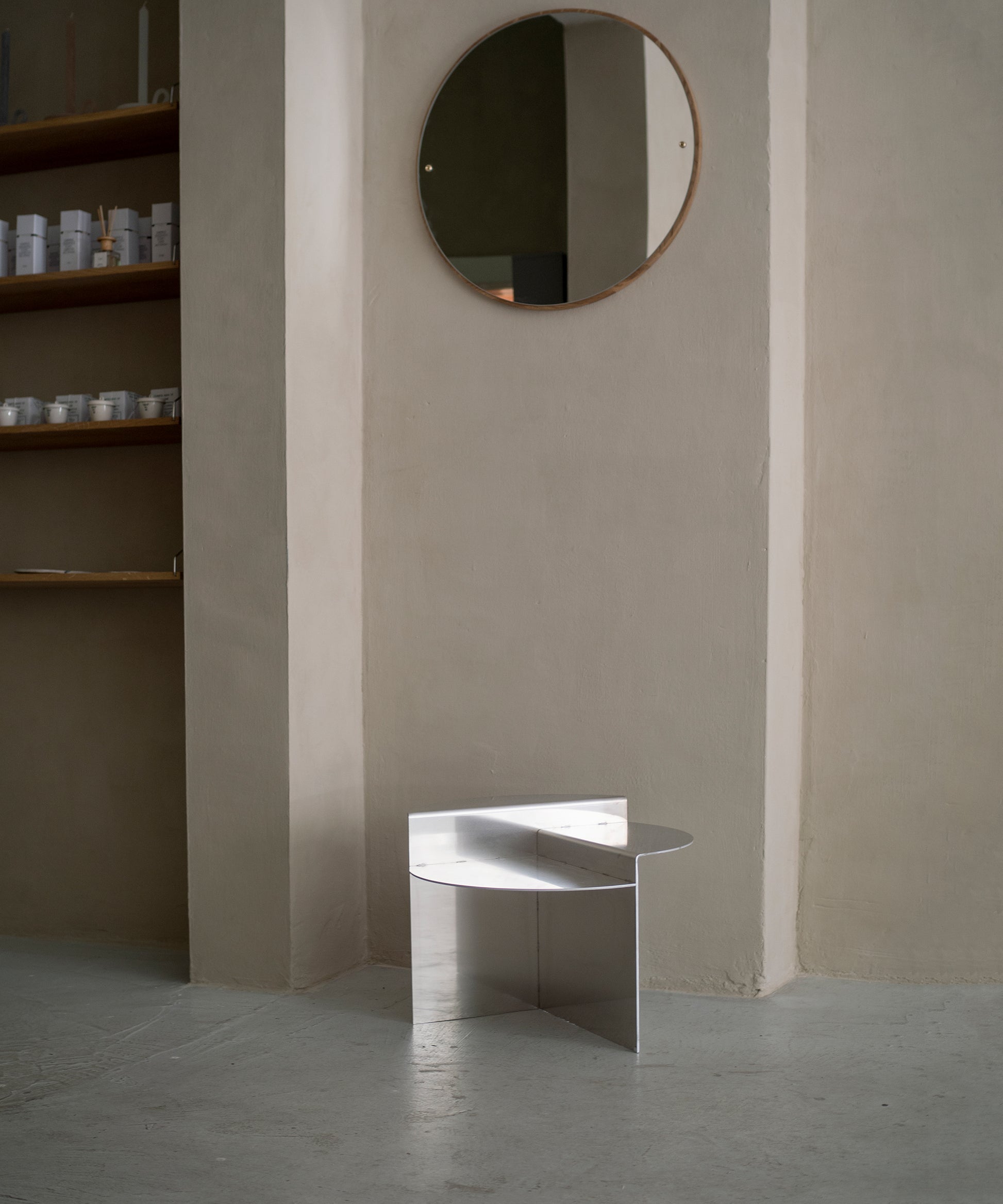 Based on a riveting technique suitable for making perpendicular joints between separate, laser-cut raw aluminum sheets, the table is put together by hand using a hammer in a cold-forming assembly process developed by designer Jonas Trampedach in 2011.