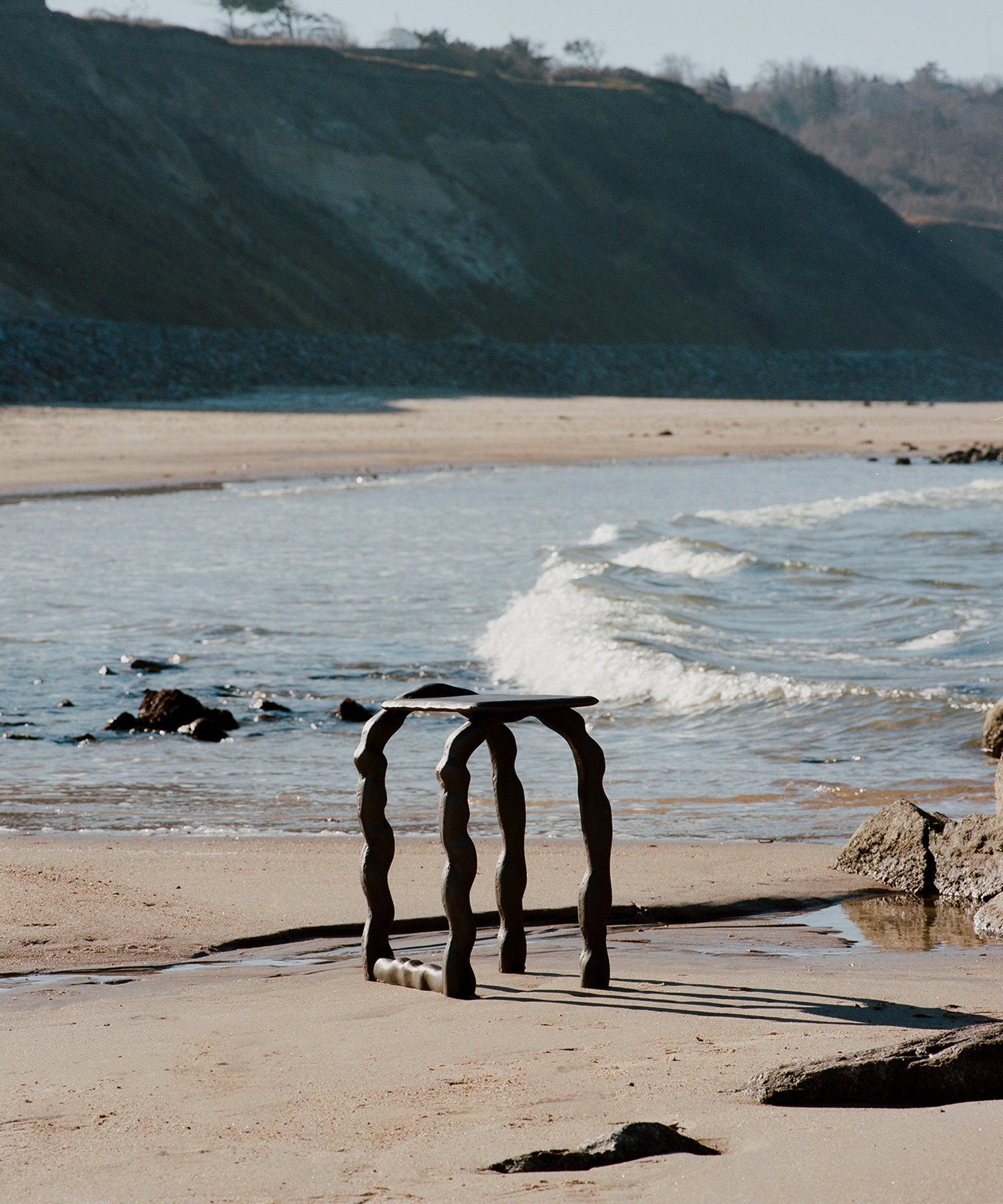 Made in collaboration with the Norwegian artist Øfstedal Eng, the sculptural piece is formed entirely from 100% recycled casted aluminum, and features looped, organically formed legs that beautifully contrast its metallic material. Suitable for use outdoors.