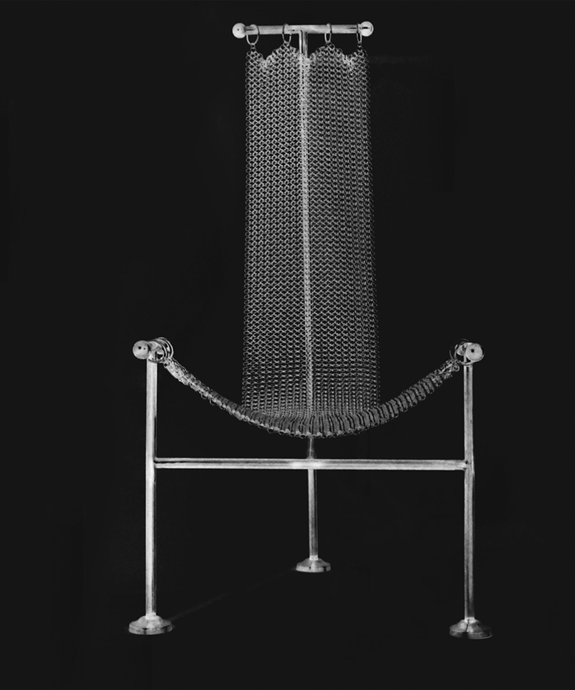 Chainmail Chair is a new take on William Katavolos's 1952 T-chair. Its seat is made up of hand-linked metal rings coming together to form a strong and flexible mesh that drapes down its T structure.