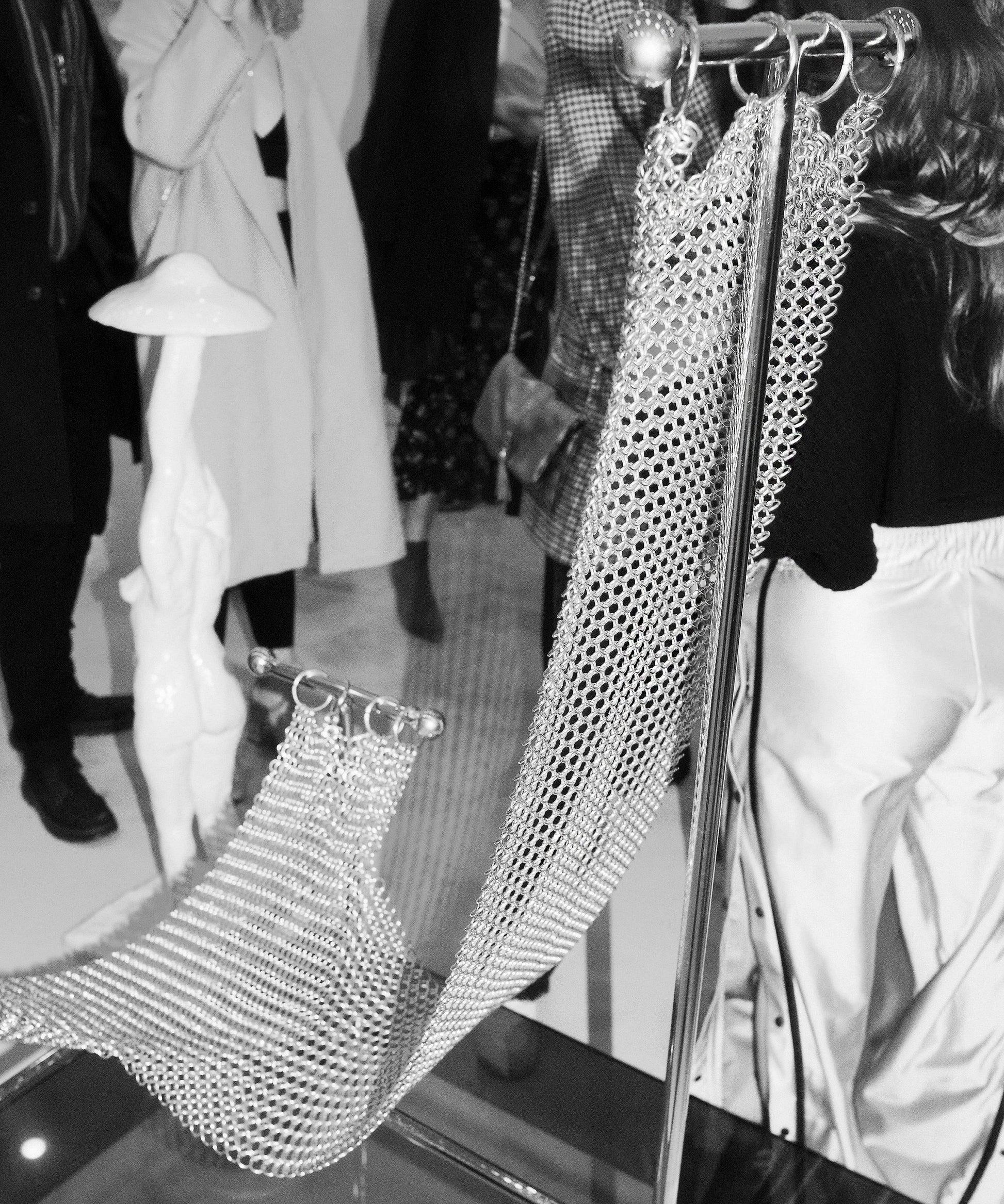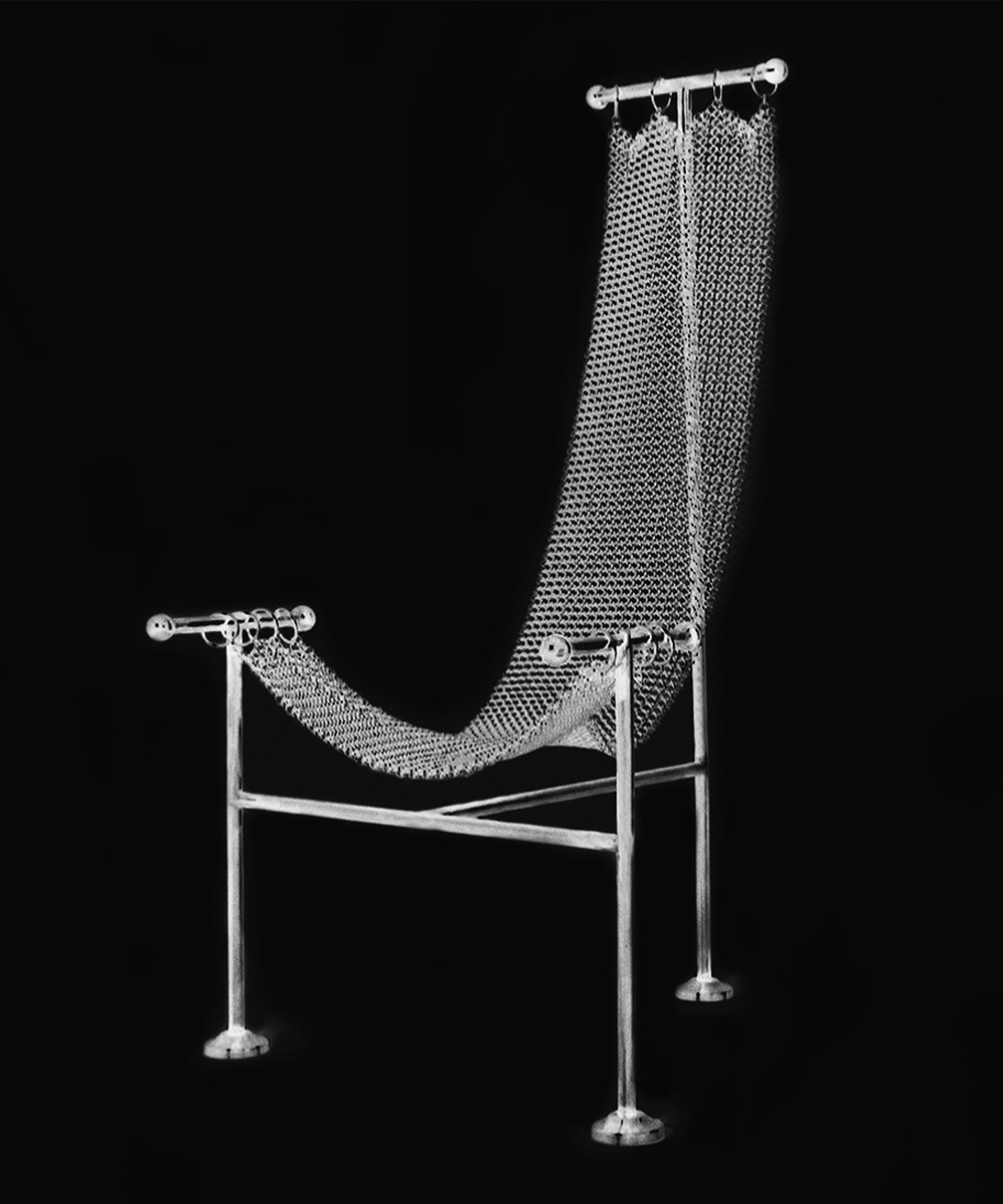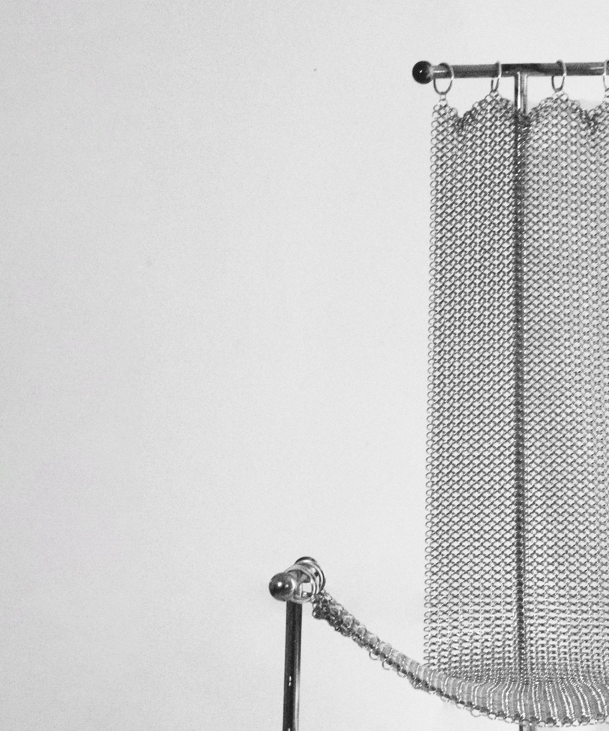 For the Chainmail chair, we sought to create a design that supported the idea of a body that is open to different forms of expression; to pain, to pleasure, to pleasure in pain, a body concentrated on its primal instincts. Chainmail chair ultimately seeks to express and question our wish for constraint. Chainmail is a fascinating material. It consists of a series of hand-linked rings coming together to form a strong and flexible mesh that drapes like a textile. Simple in concept but extremely versatile and charged with meaning. The result of an old craft that somehow looks industrial and modern.