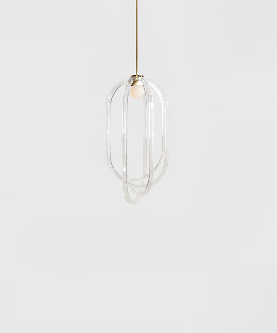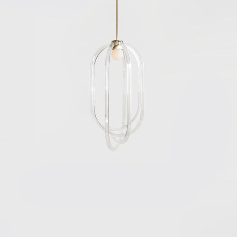 The resin rings are designed to evoke bubble-filled glass while offering the strength and durability of resin. The inside facing of each ring is fogged, allowing the light to carry through the entirety of the ring's loop. The fixture is available in a variety of metal finishes. Please note, that it assumes a 25" rod length, however, it is easily customizable upon request (Please email us at help@trnk-nyc.com with your specifications).