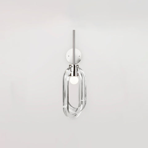 The resin rings are designed to evoke bubble-filled glass while offering the strength and durability of resin. The inside facing of each ring is fogged, allowing the light to carry through the entirety of the ring's loop. The fixture is available in a variety of metal finishes.