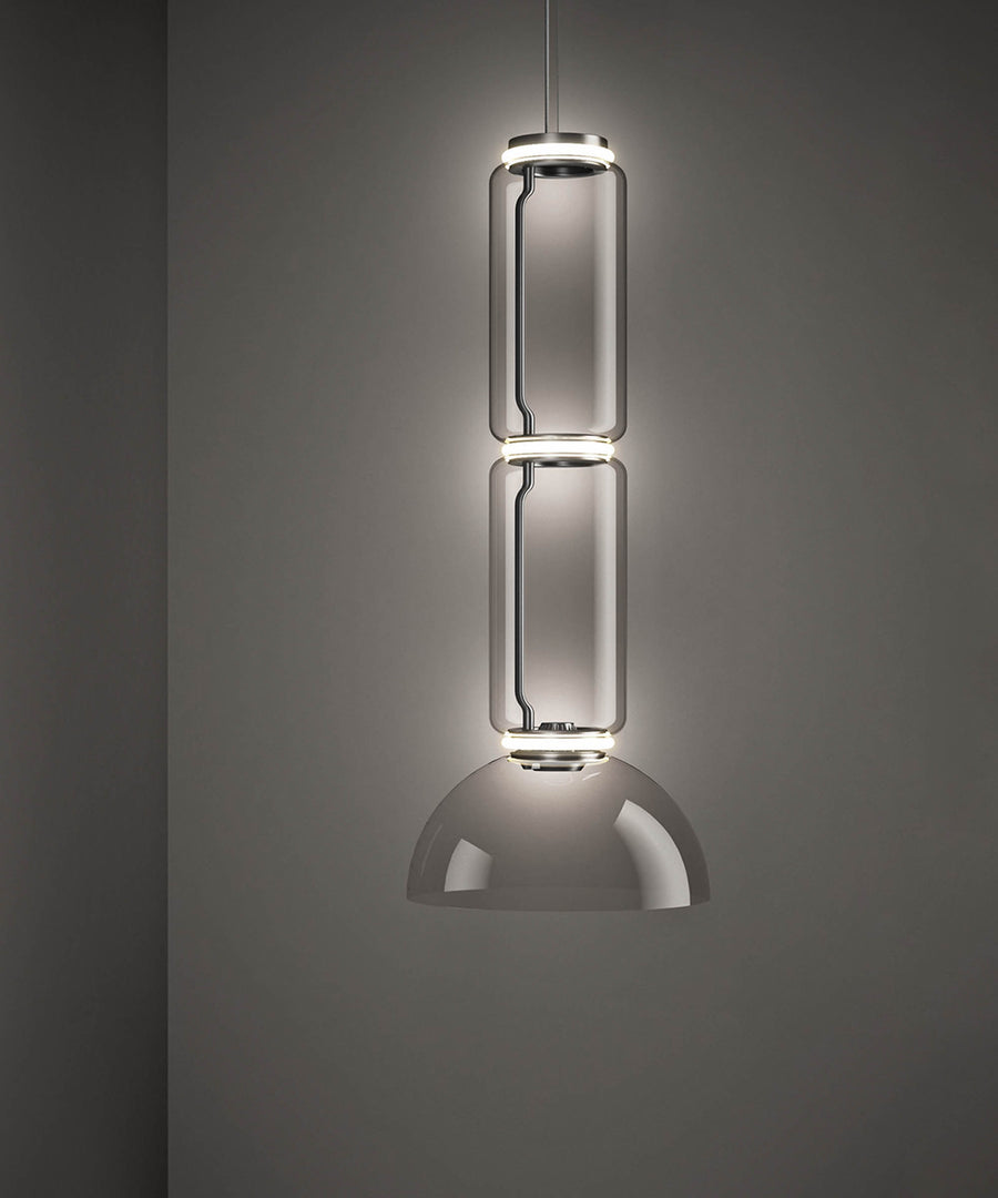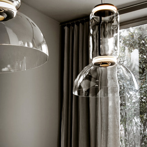 A transparent hand-blown glass cylinder, surrounded on both top and bottom by discrete LED technology, is the foundation of this product. The fixtures built from these units form columns of light at varying heights that illuminate at the intersection between each module. Configurable as a hanging or standing lamp, the Noctambule pendant lamp features additional components that allow for numerous options. The cylindrical body is available at a low and high heights, and a dome- or cone-shaped head can be selected if a more direct light source is desired. Dimming capabilities can be configured in the power supply unit within the ceiling rose or as a pedal panel on the power cord. The inspiration behind the design: Inspired by night owls, Noctambule features a transparent body that almost blends into a room when unlit, but makes its presence known when it illuminates at night. Discover the entire collection of this magical award-winning collection of cylindrical LED dimmable modern lights.